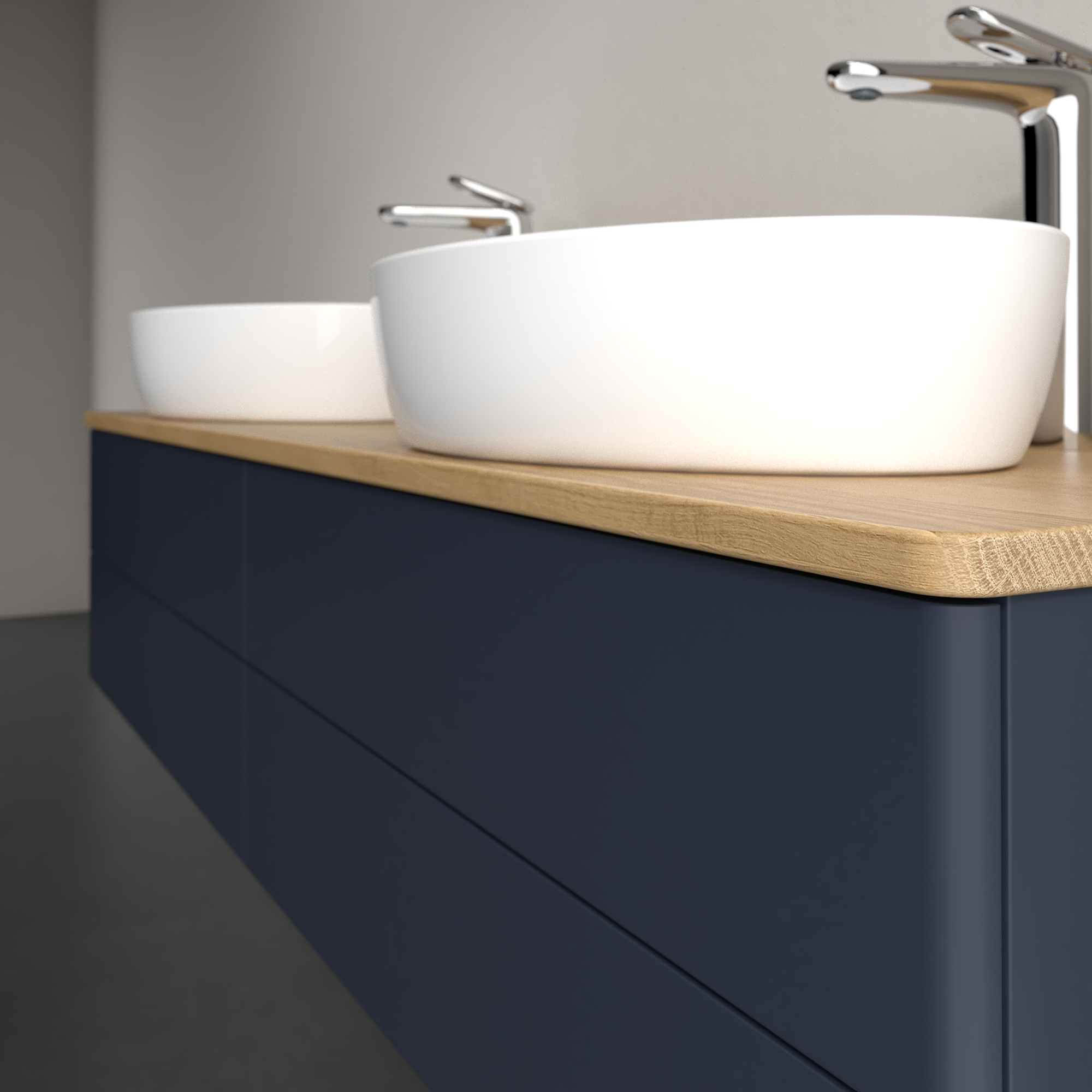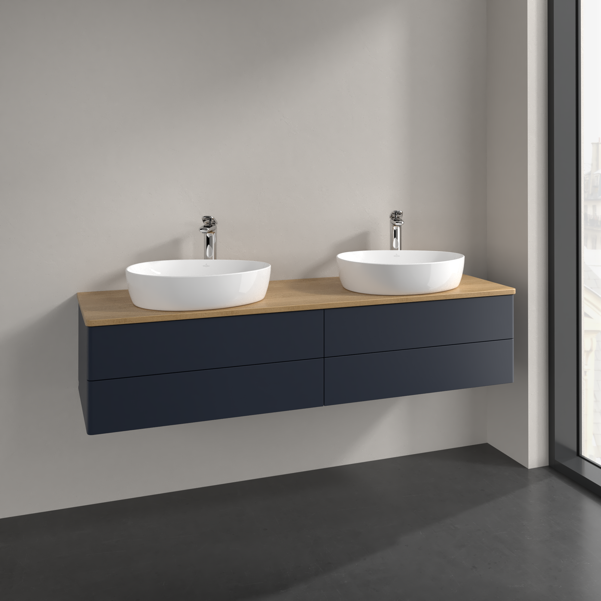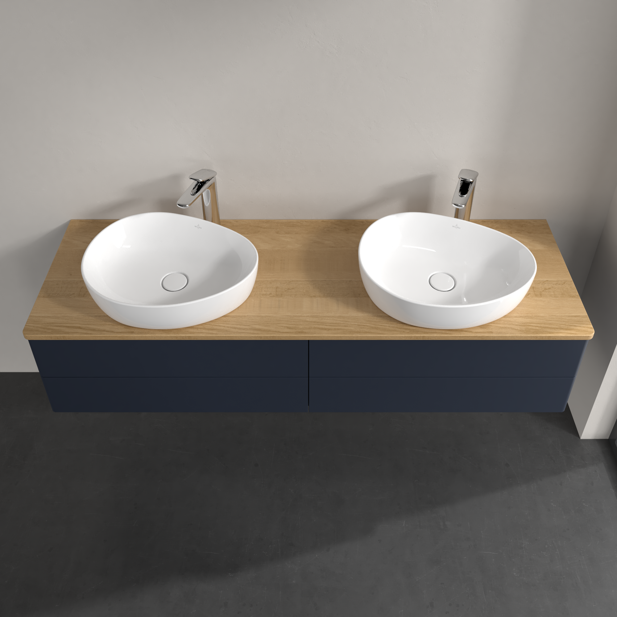 Antao Waschbeckenunterschrank, mit Beleuchtung, 4 Auszüge, 1600x360x500mm, Front ohne Struktur, Korpus: Midnight Blue Matt Lacquer, Front: Midnight Blue Matt Lacquer, Abdeckplatte: Honey Oak