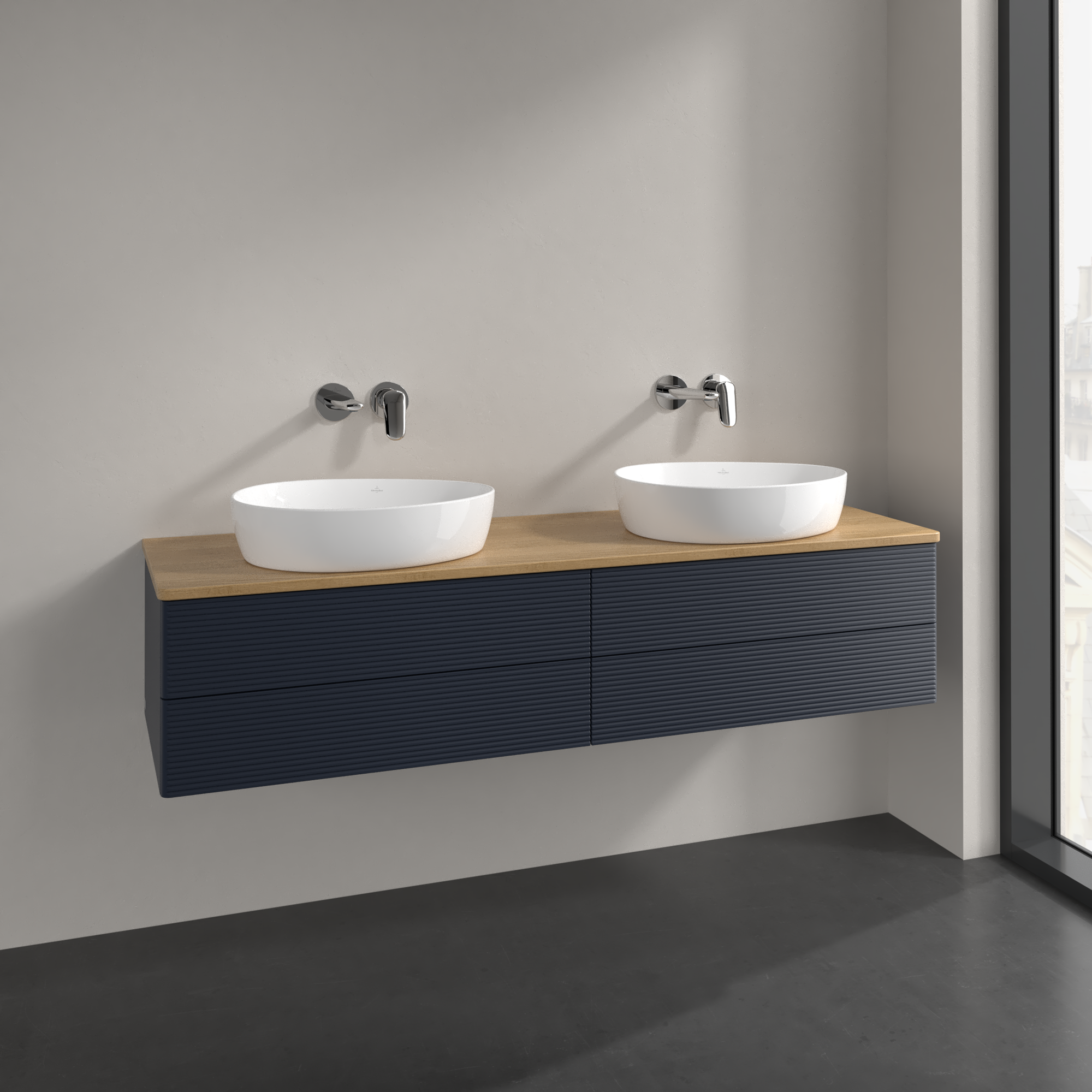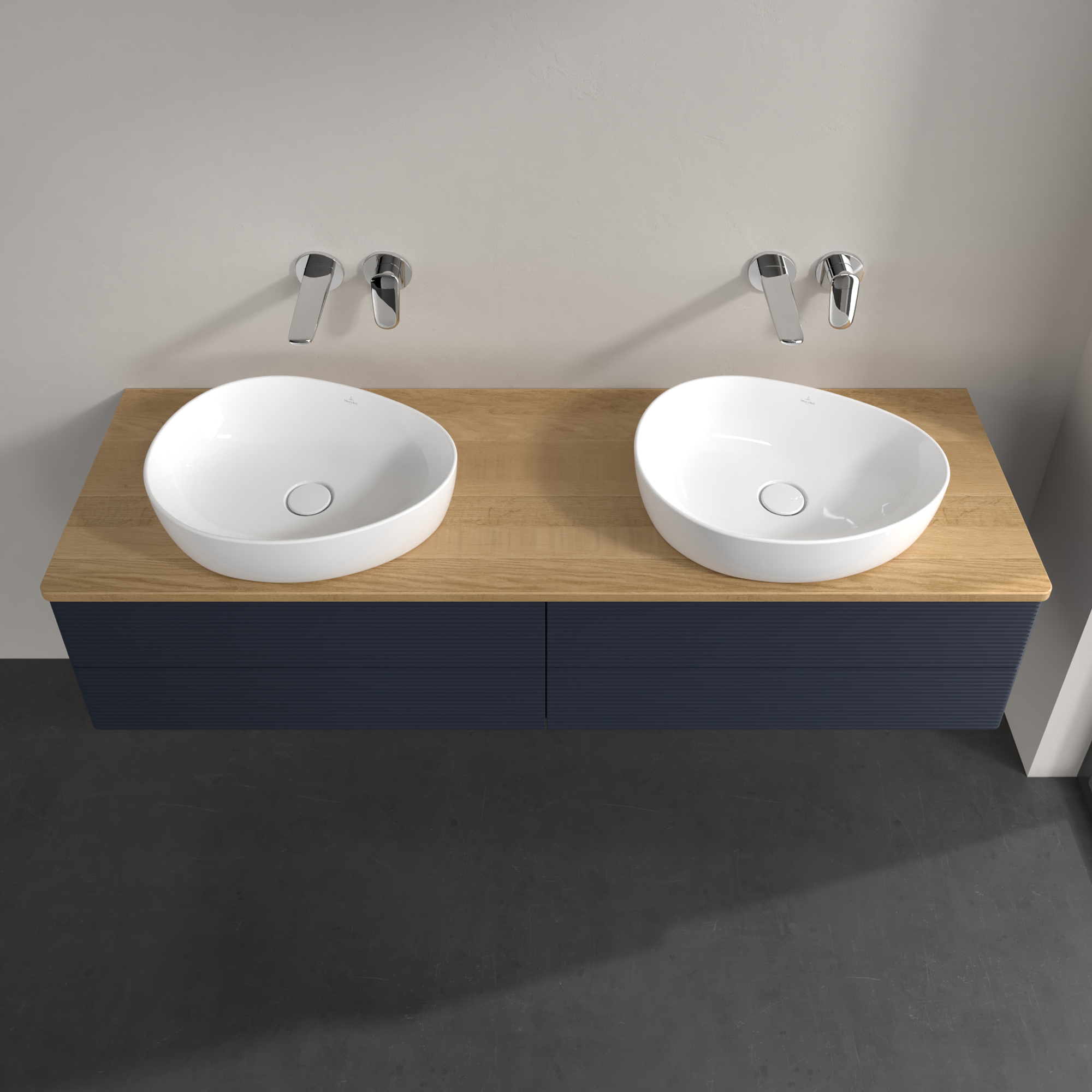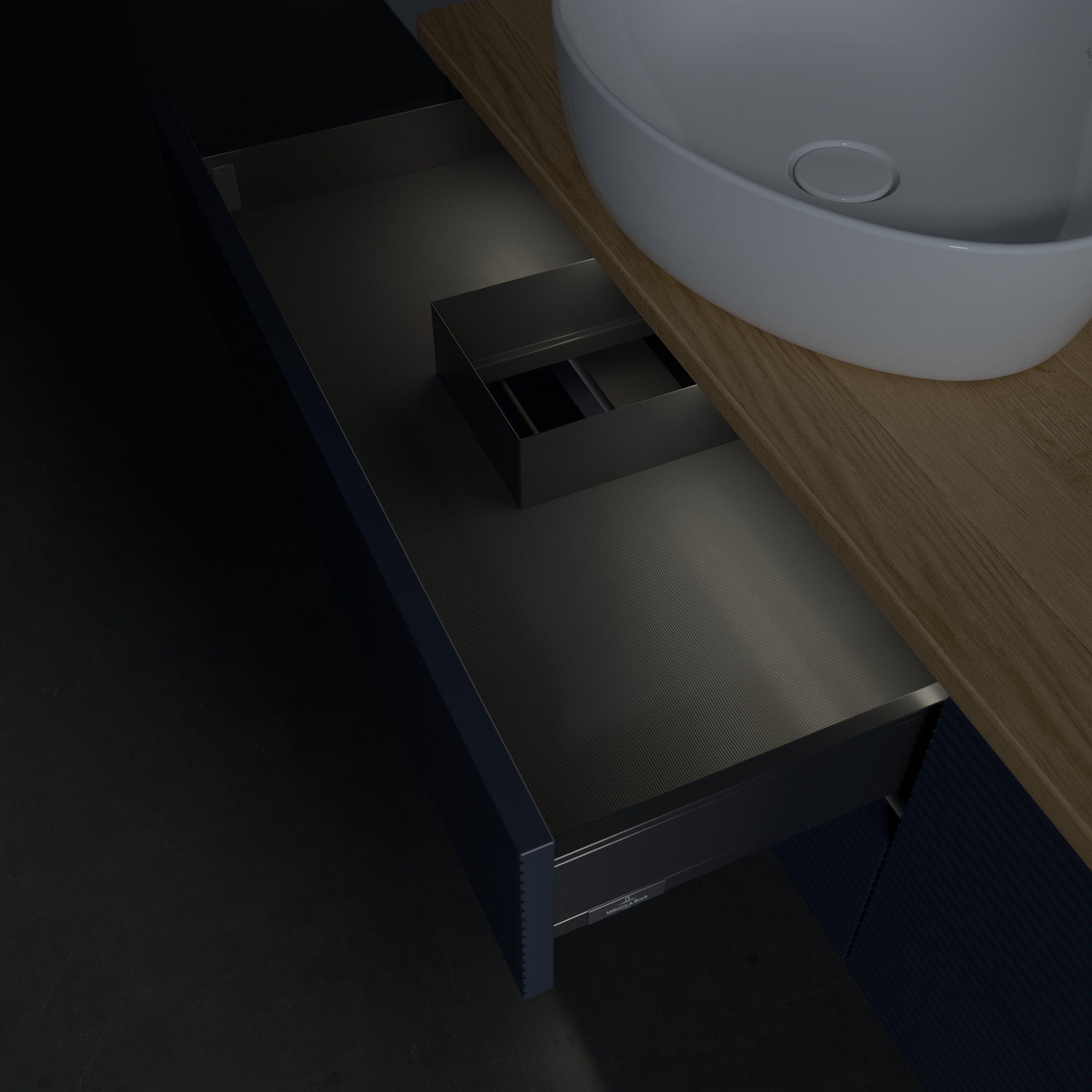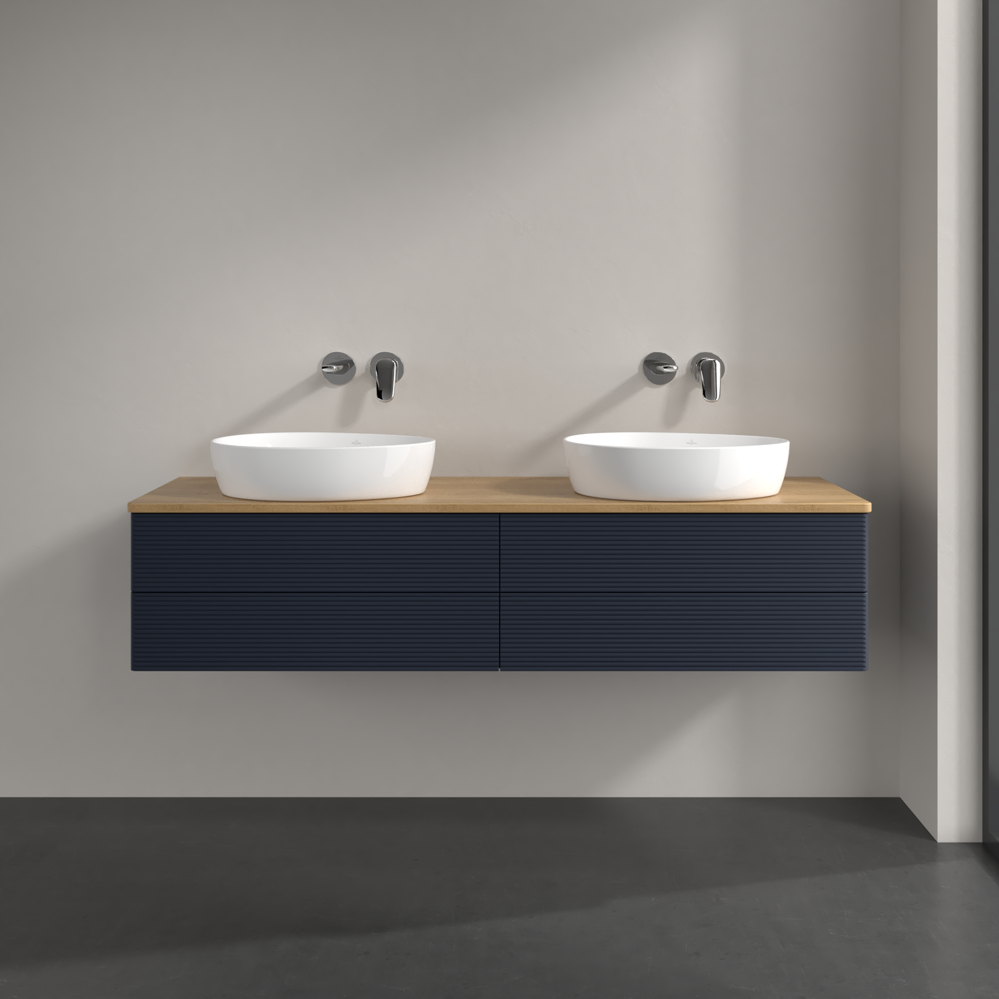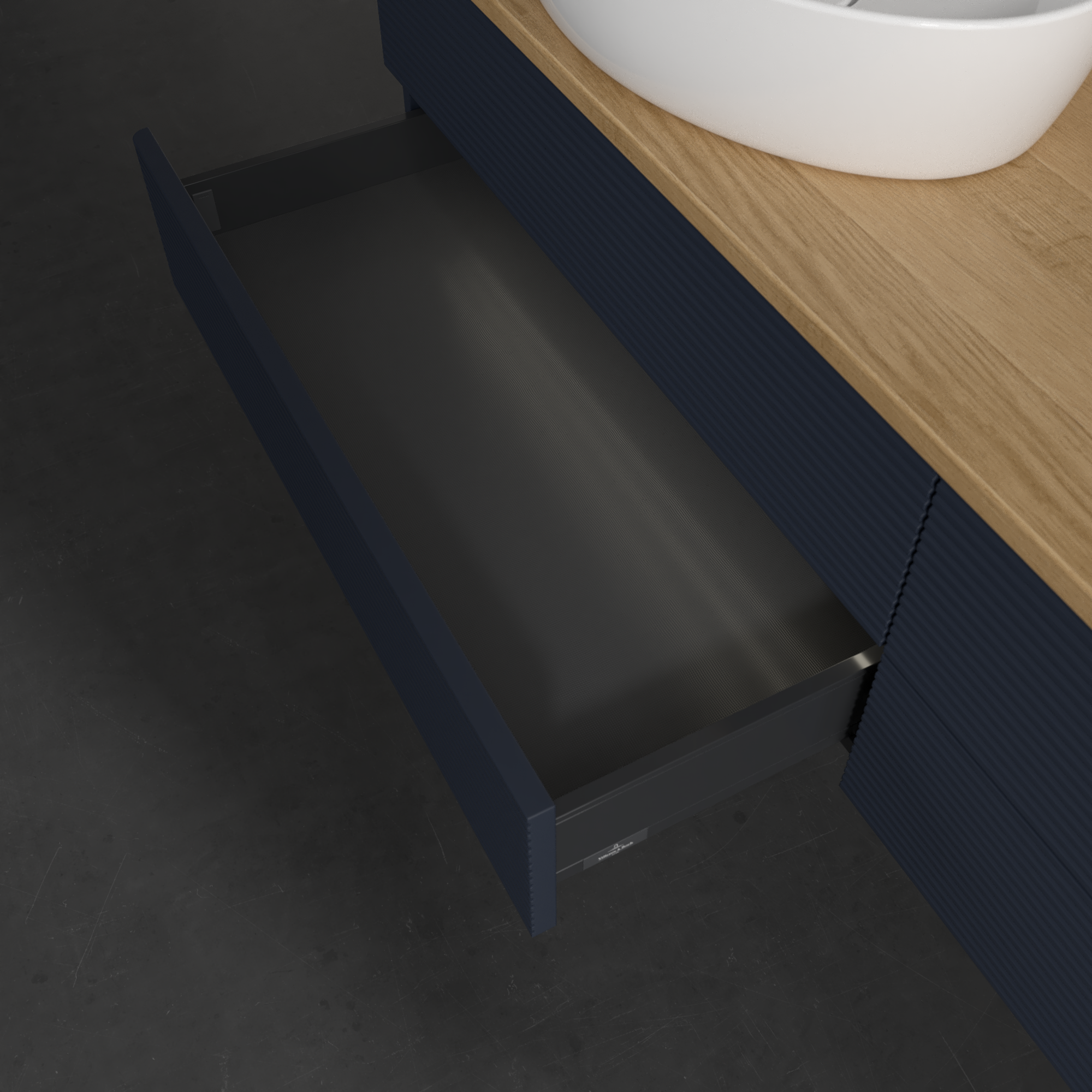 Antao Waschbeckenunterschrank, mit Beleuchtung, 4 Auszüge, 1600x360x500mm, Front mit Struktur, Korpus: Midnight Blue Matt Lacquer, Front: Midnight Blue Matt Lacquer, Abdeckplatte: Honey Oak