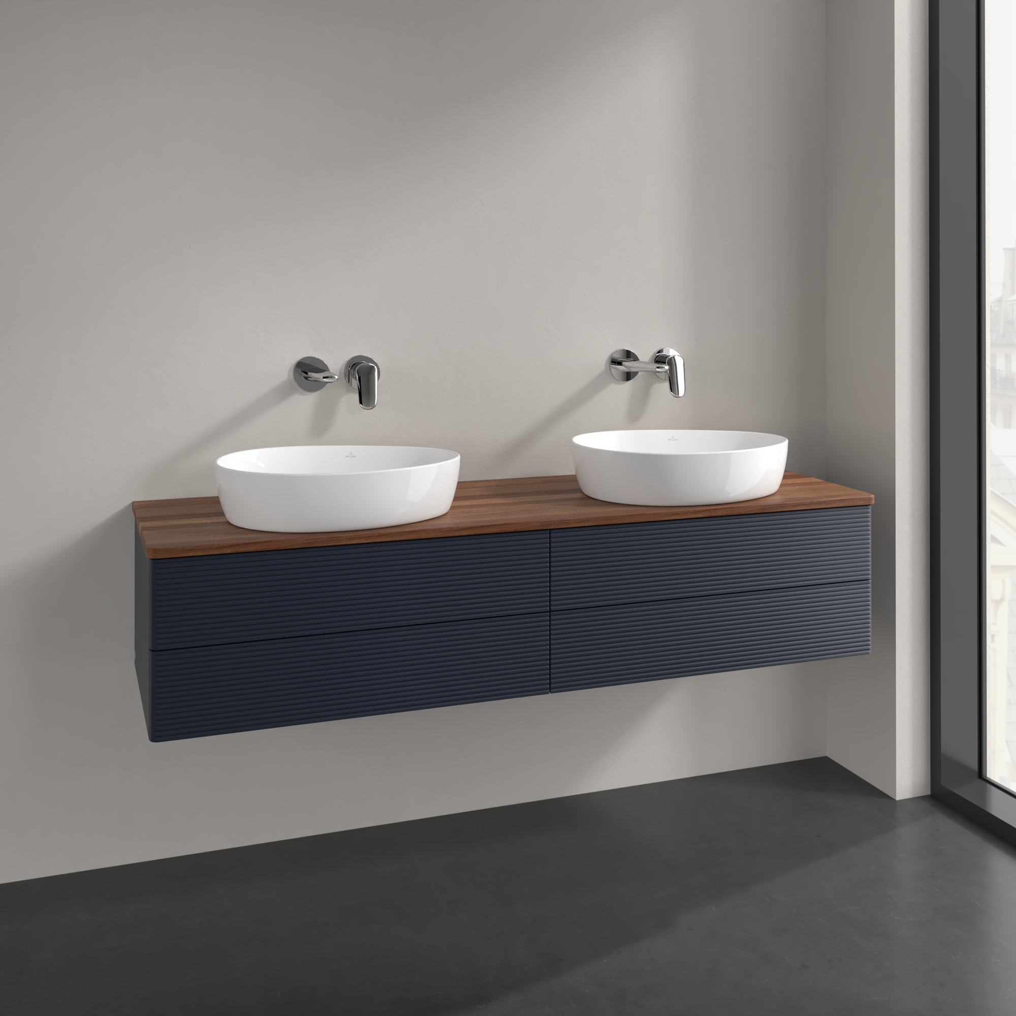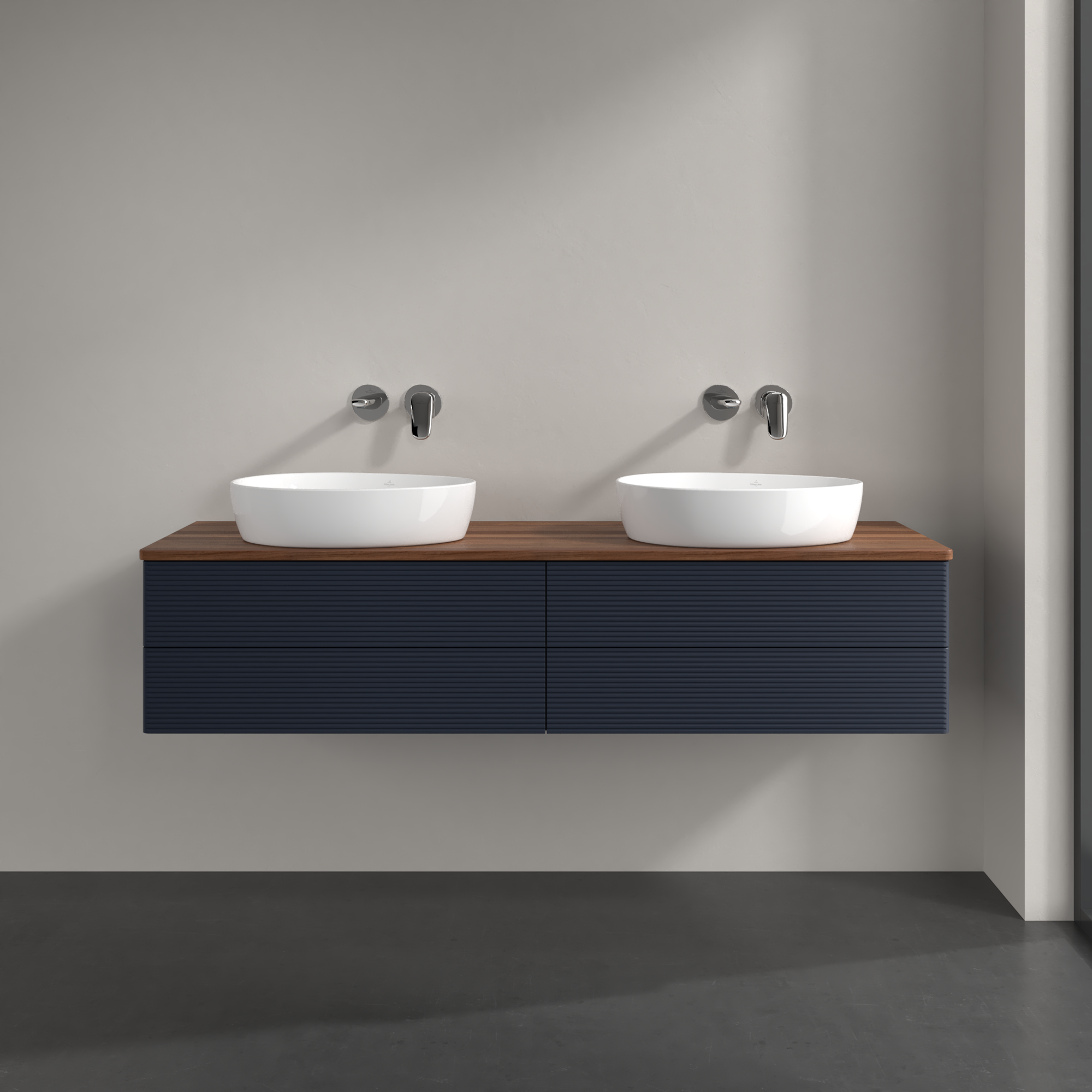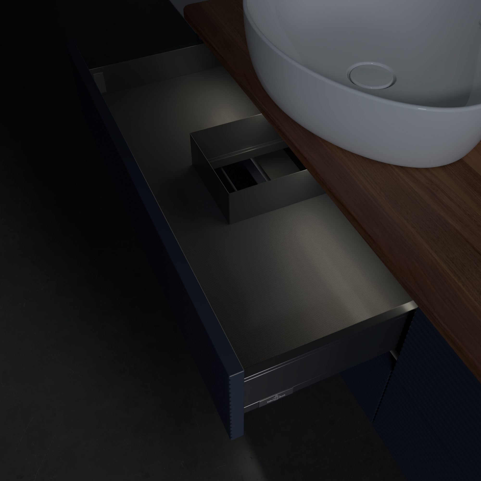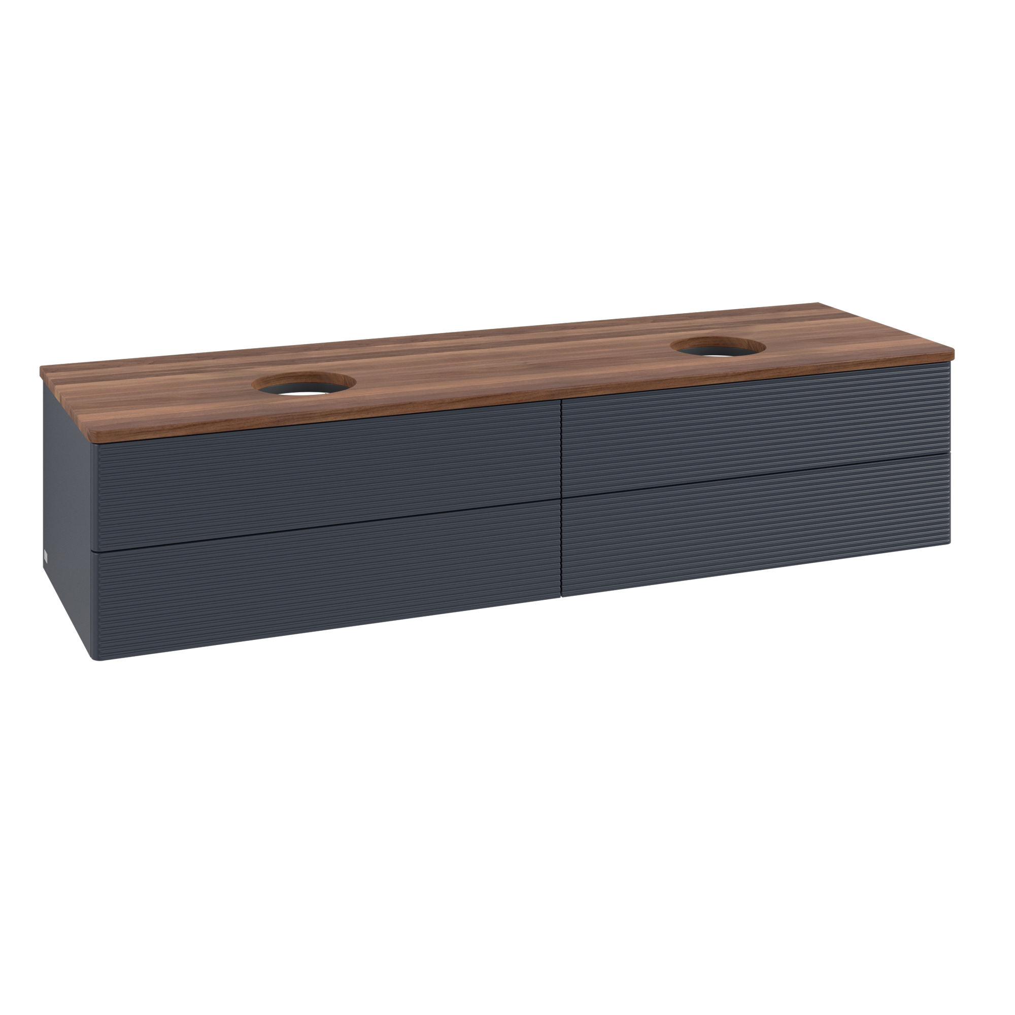 Antao Waschbeckenunterschrank, mit Beleuchtung, 4 Auszüge, 1600x360x500mm, Front mit Struktur, Korpus: Midnight Blue Matt Lacquer, Front: Midnight Blue Matt Lacquer, Abdeckplatte: Warm Walnut