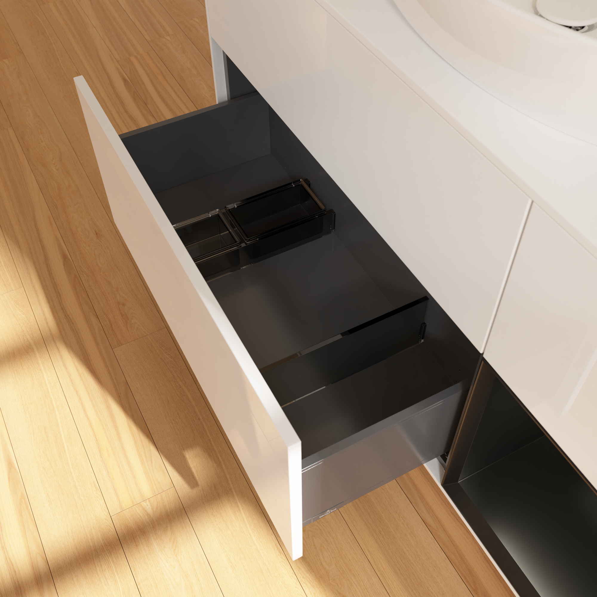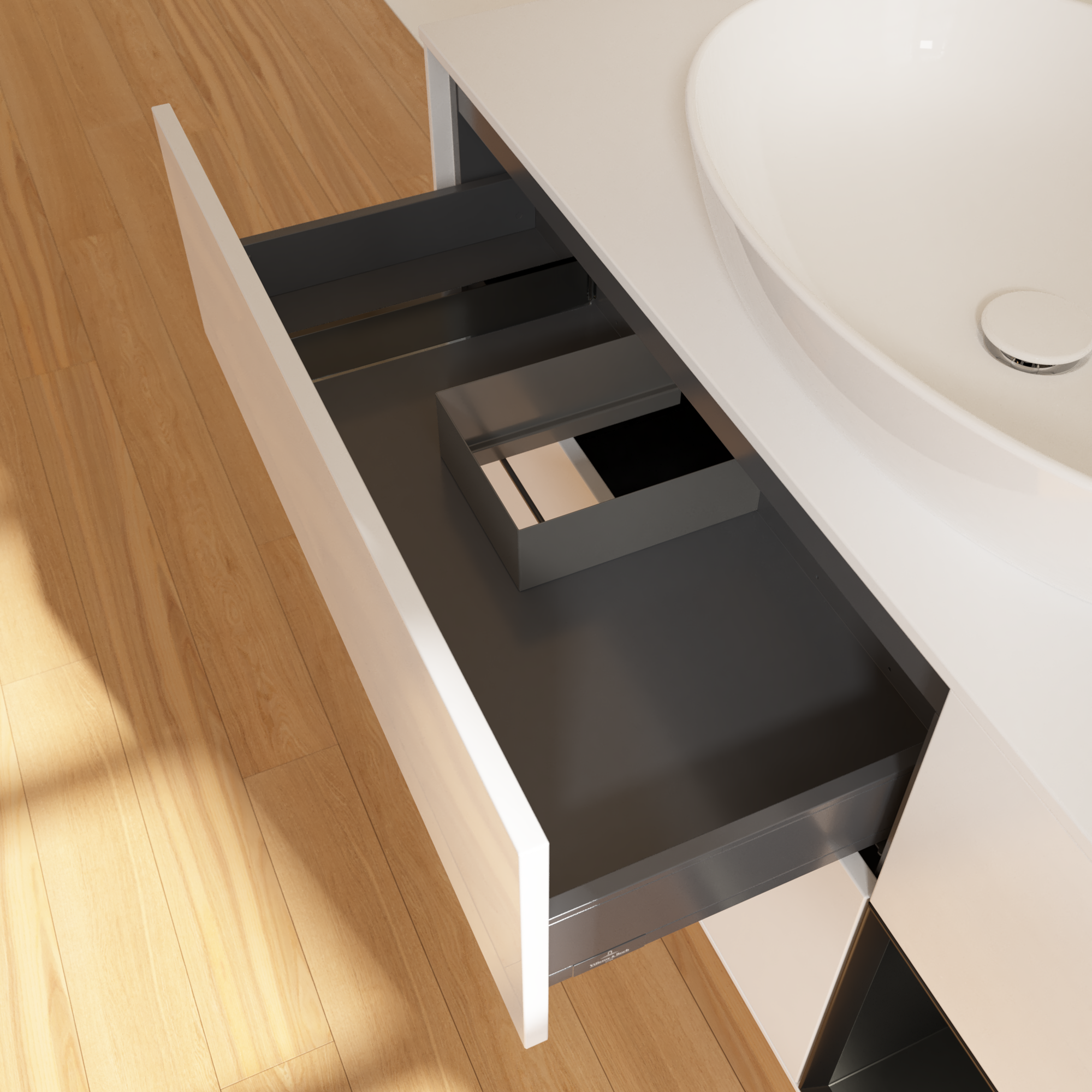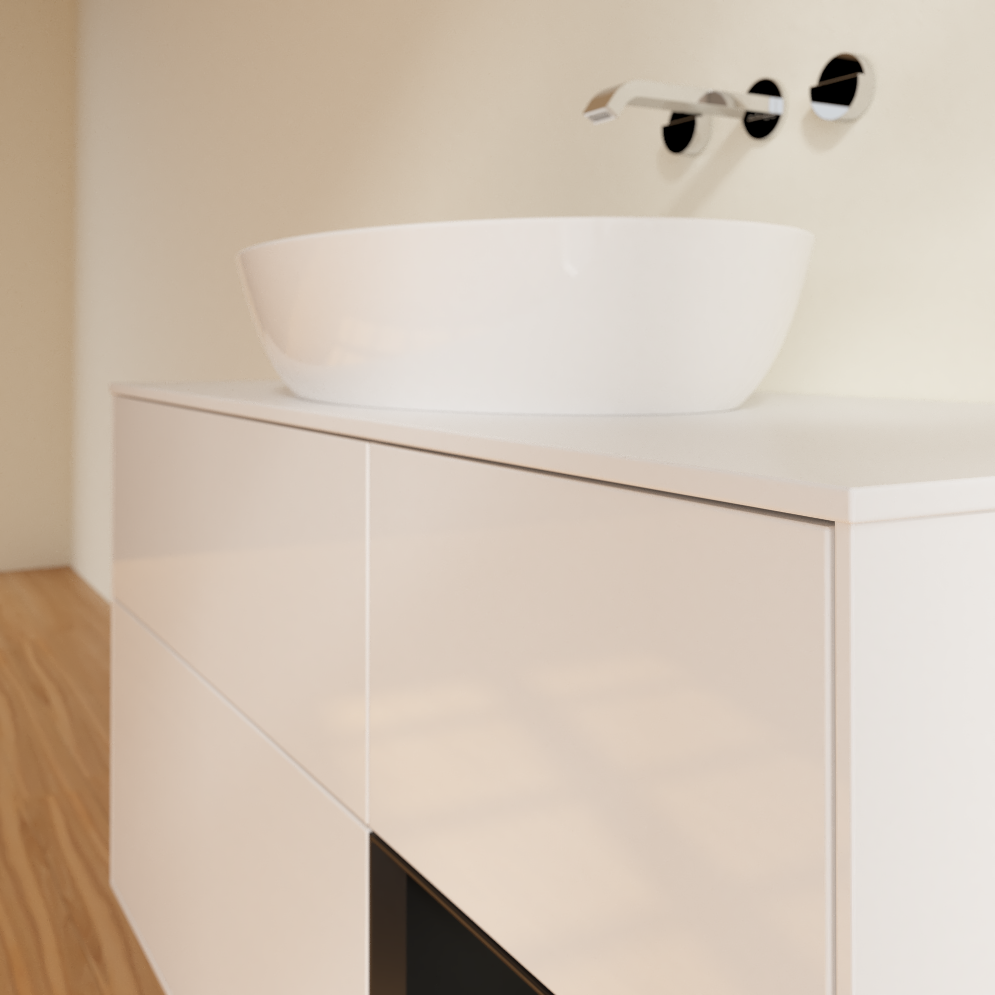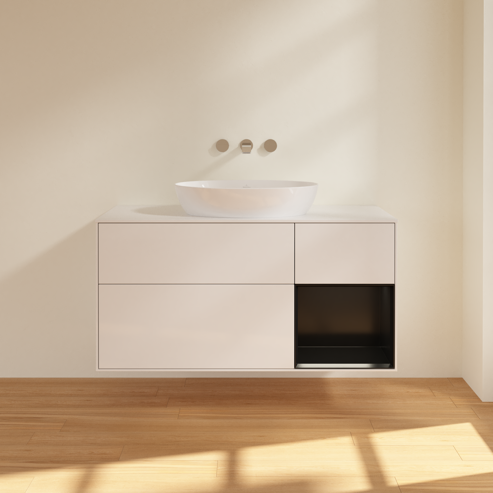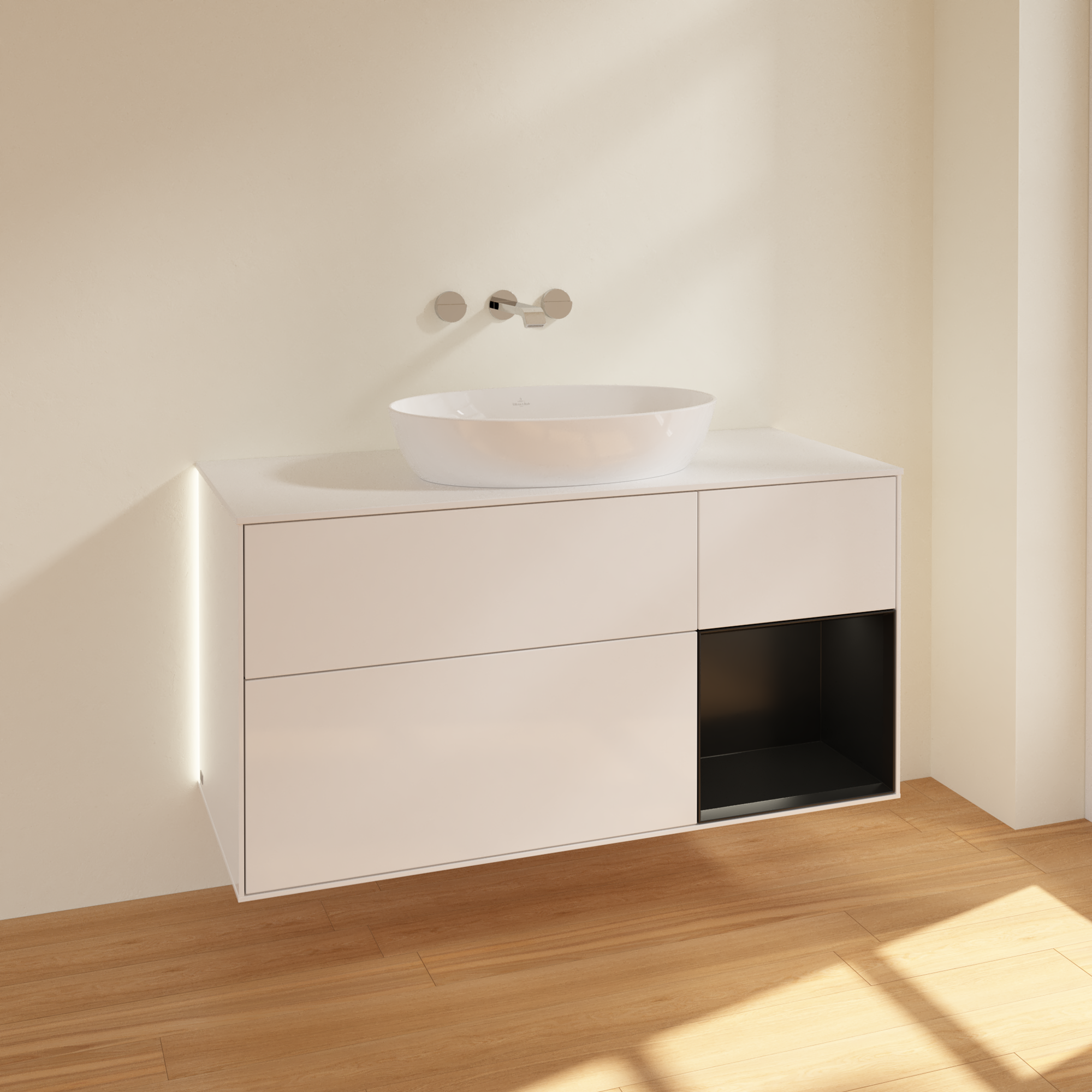 Finion Waschbeckenunterschrank, mit Beleuchtung, 3 Auszüge, 1200x603x501mm, Korpus: Glossy White Lacquer, Front: Glossy White Lacquer, Regalelement: Black Matt Lacquer, Abdeckplatte: Glass White Matt