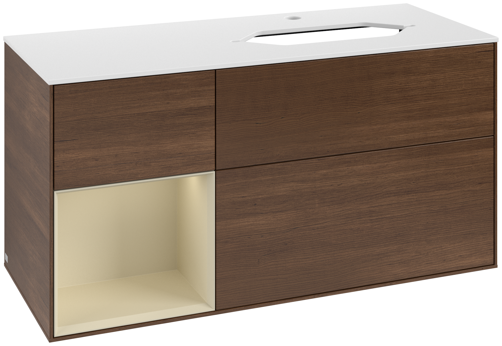 Finion Waschbeckenunterschrank, mit Beleuchtung, 3 Auszüge, 1200x603x501mm, Korpus: Walnut Veneer, Front: Walnut Veneer, Regalelement: Silk Grey Matt Lacquer, Abdeckplatte: Glass White Matt