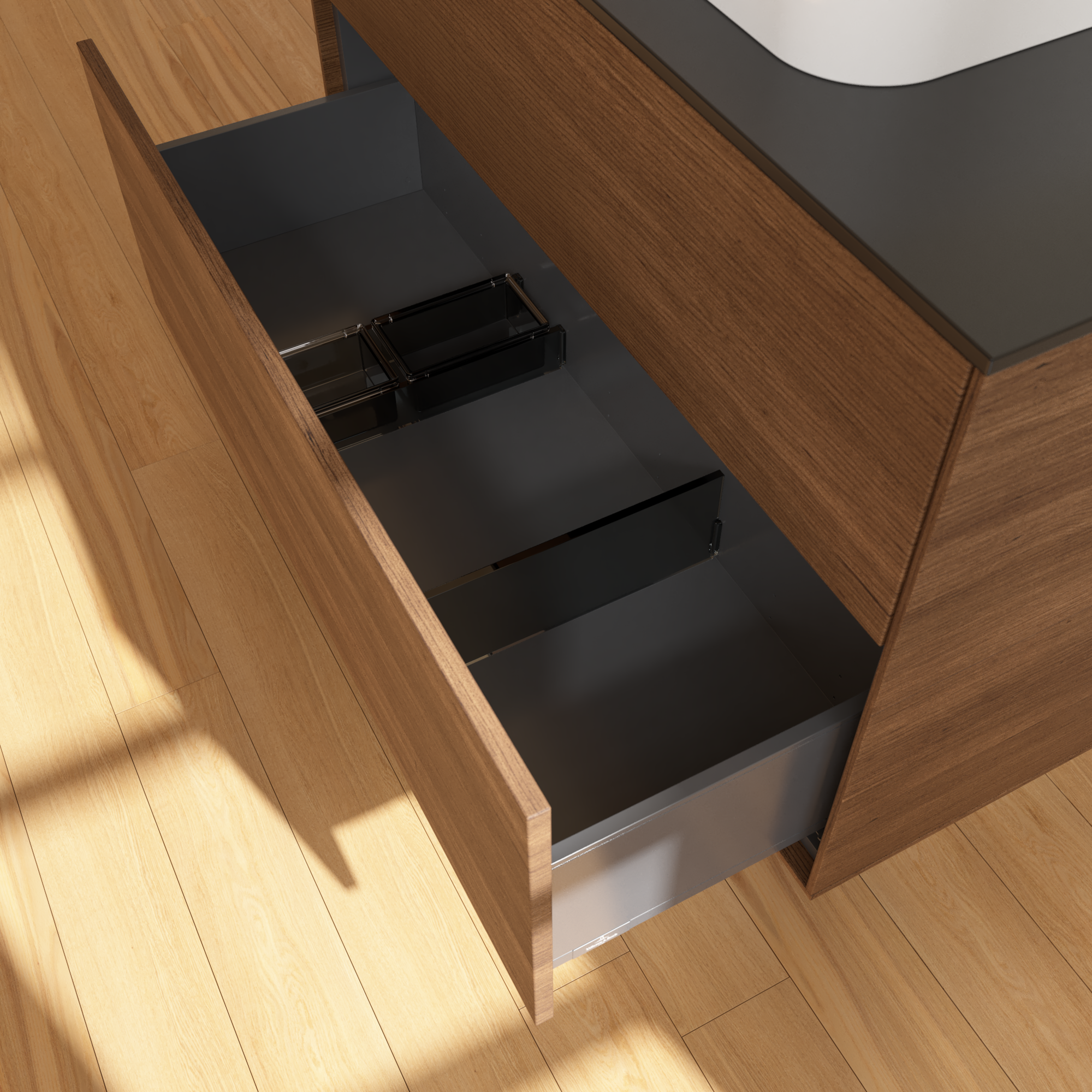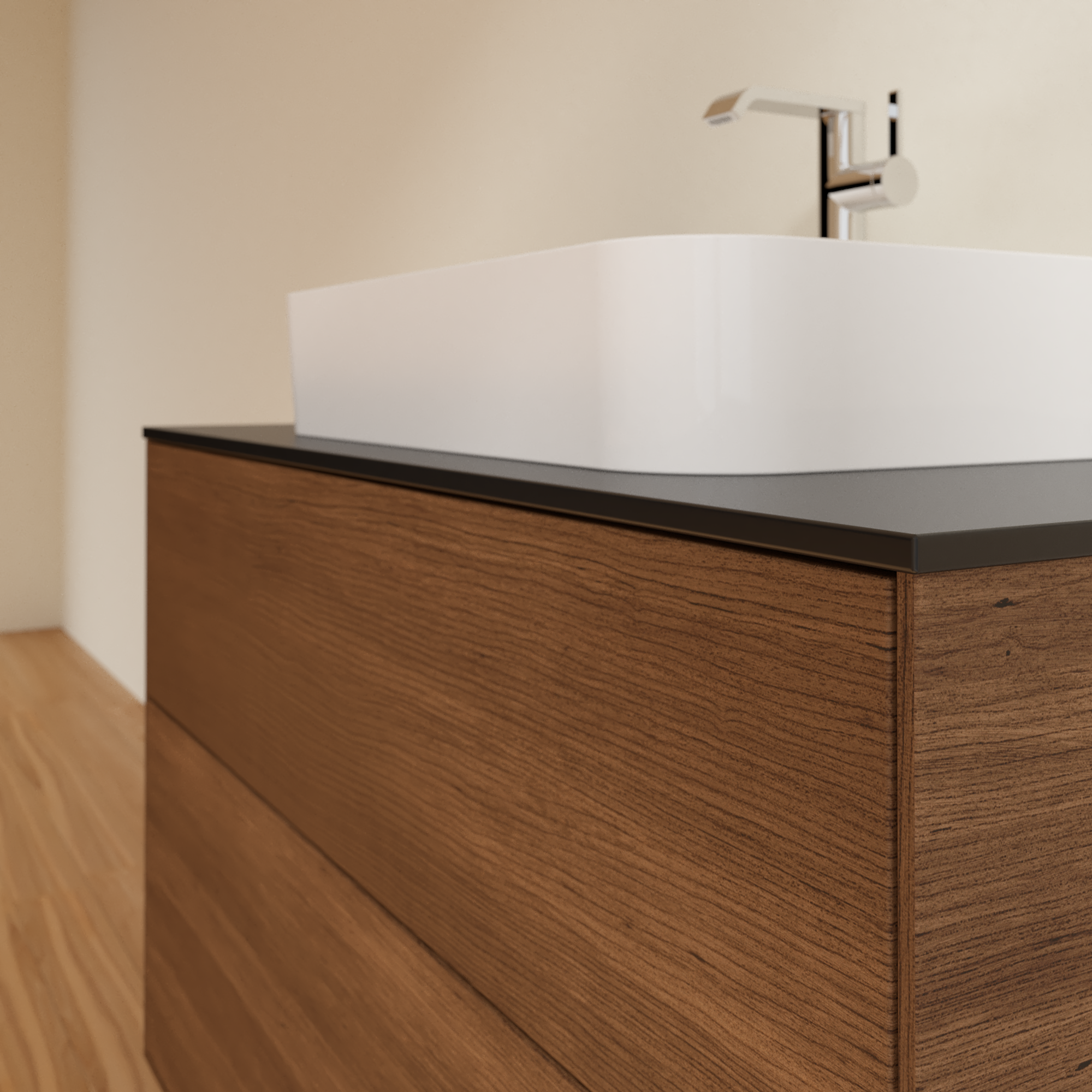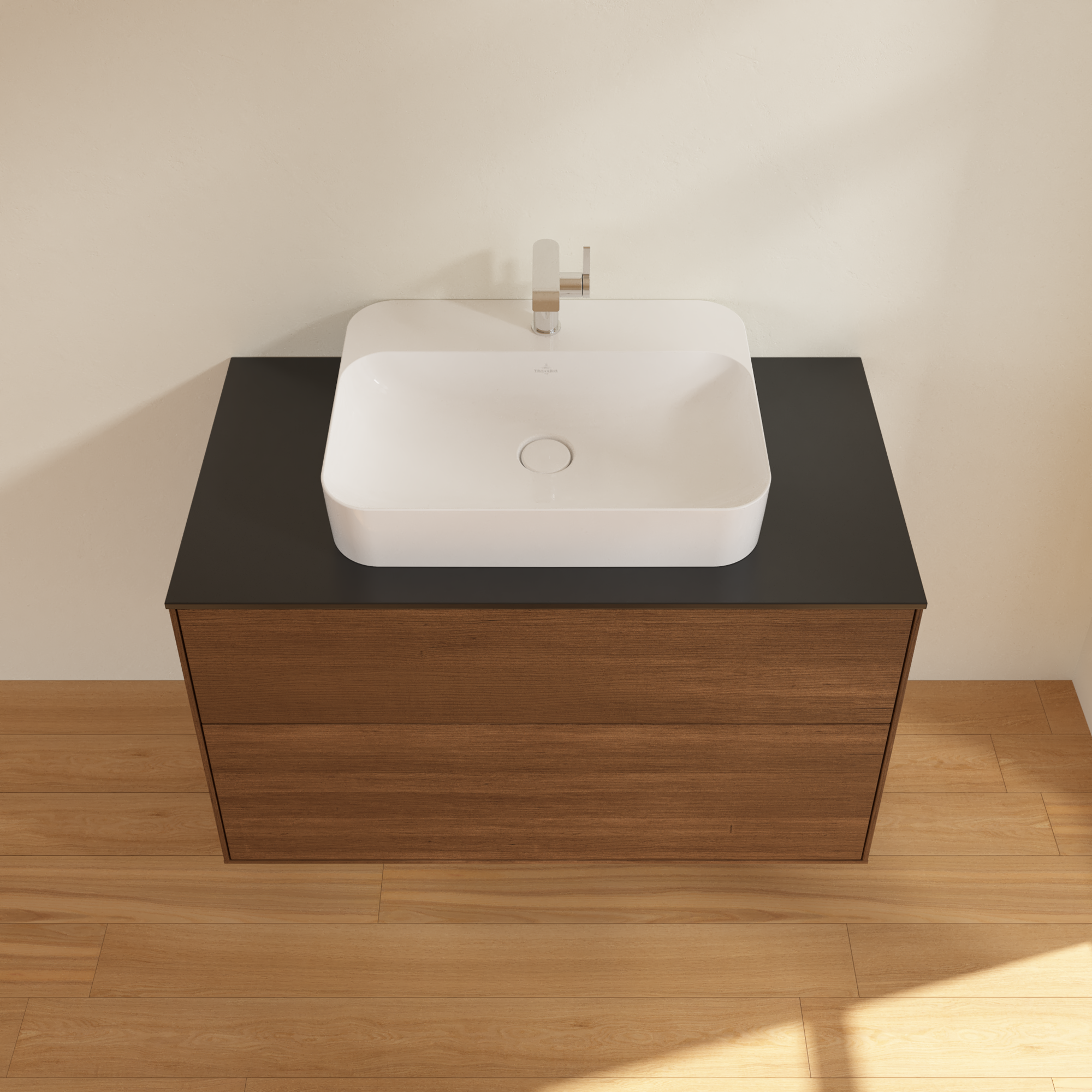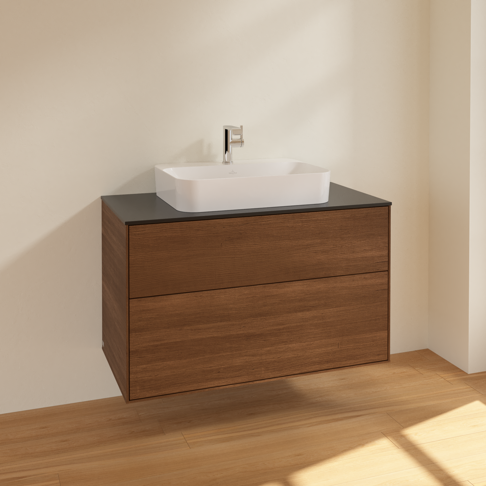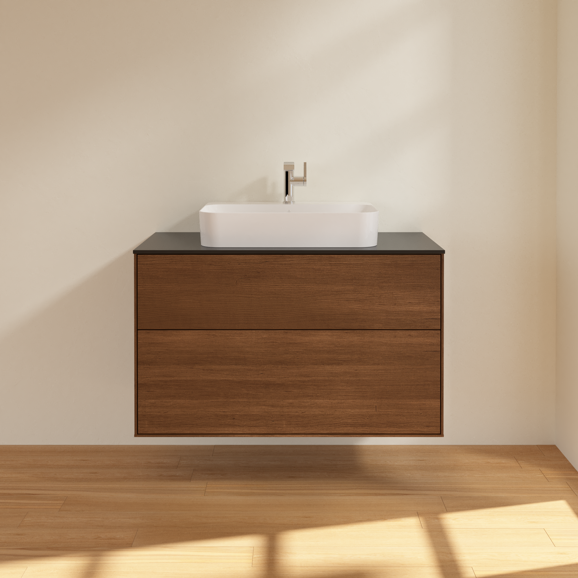 Finion Waschbeckenunterschrank, 2 Auszüge, 1000x603x501mm, Korpus: Walnut Veneer, Front: Walnut Veneer, Abdeckplatte: Glass Black Matt