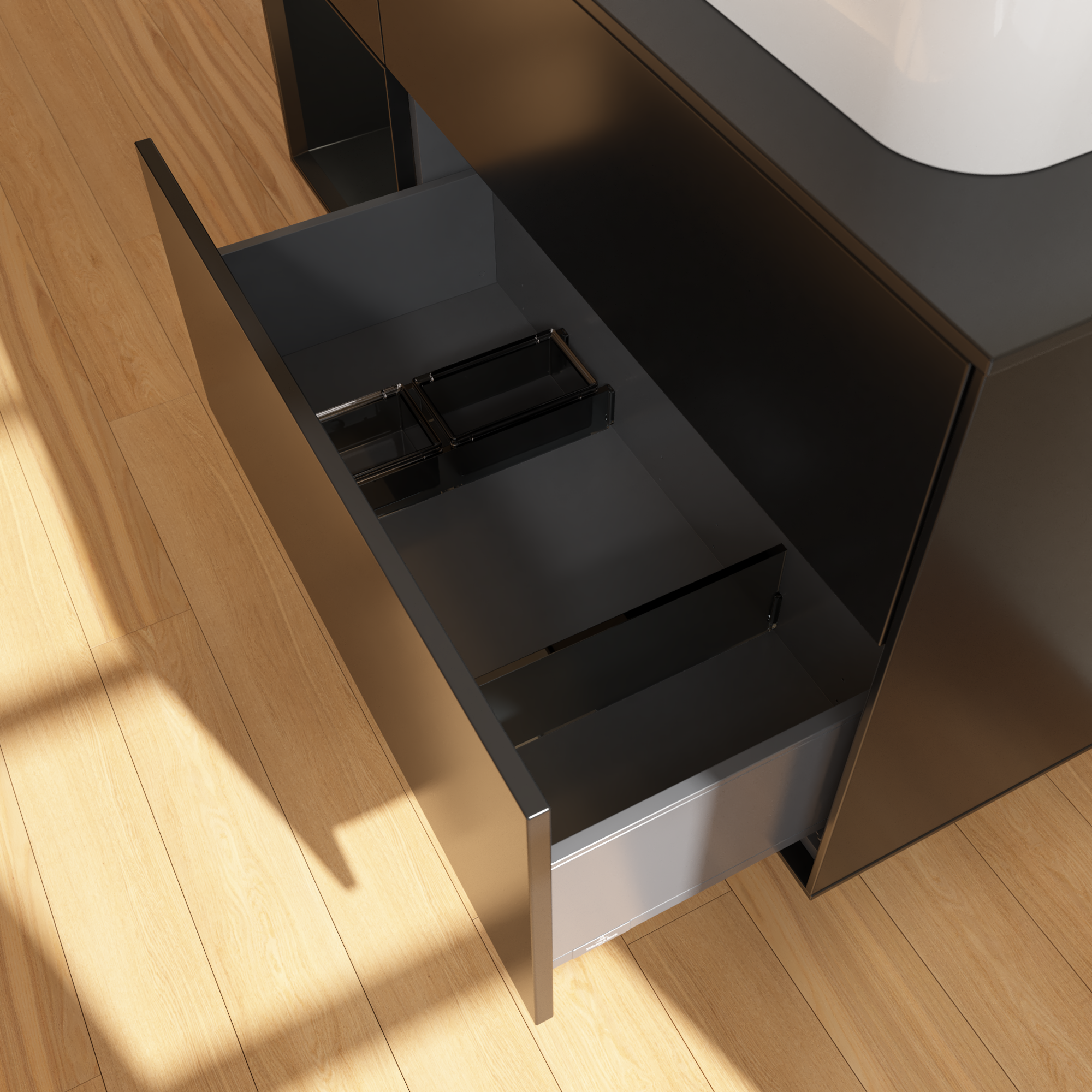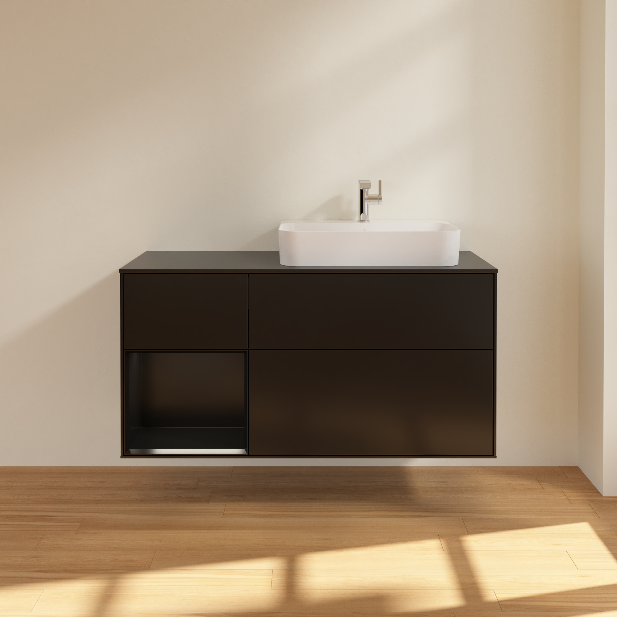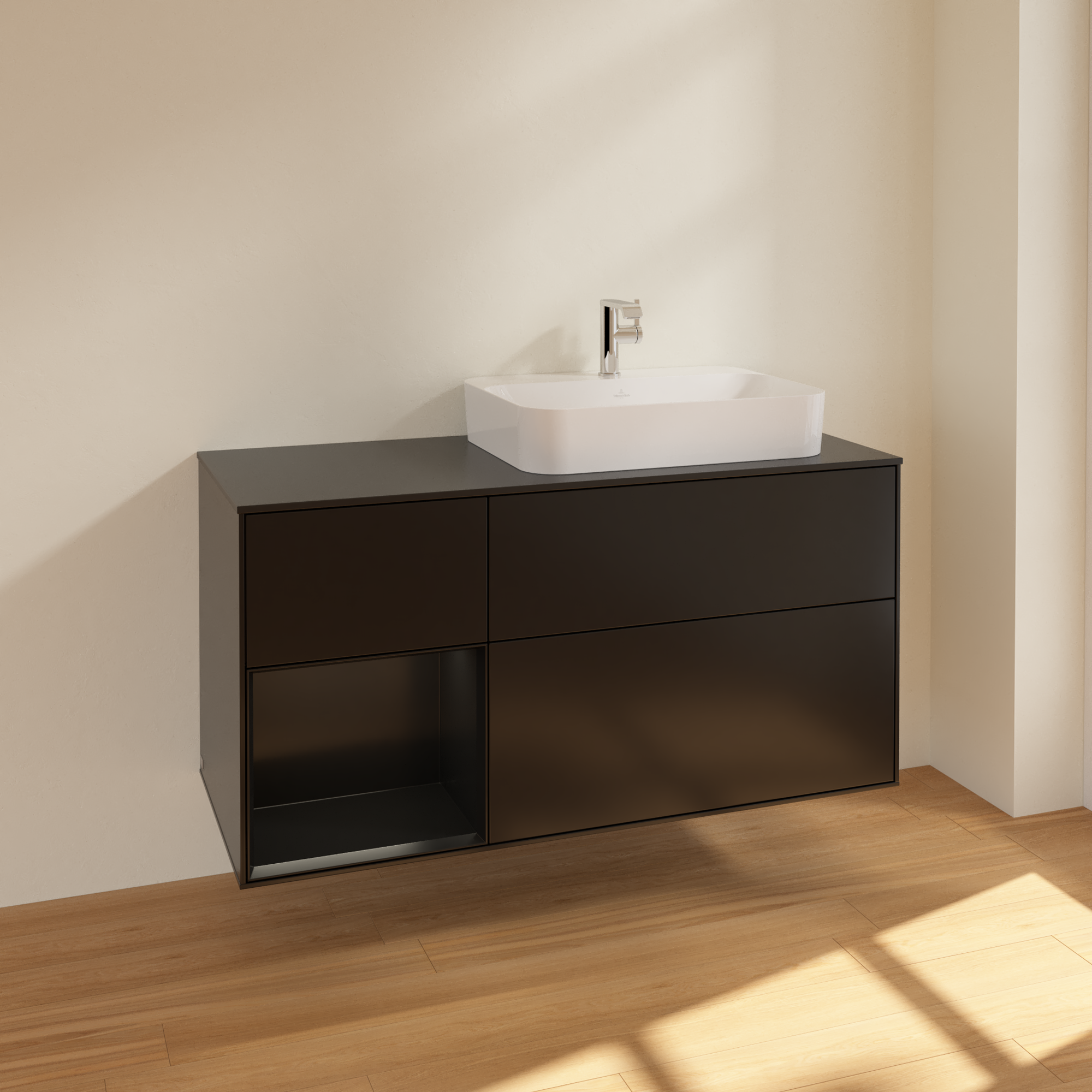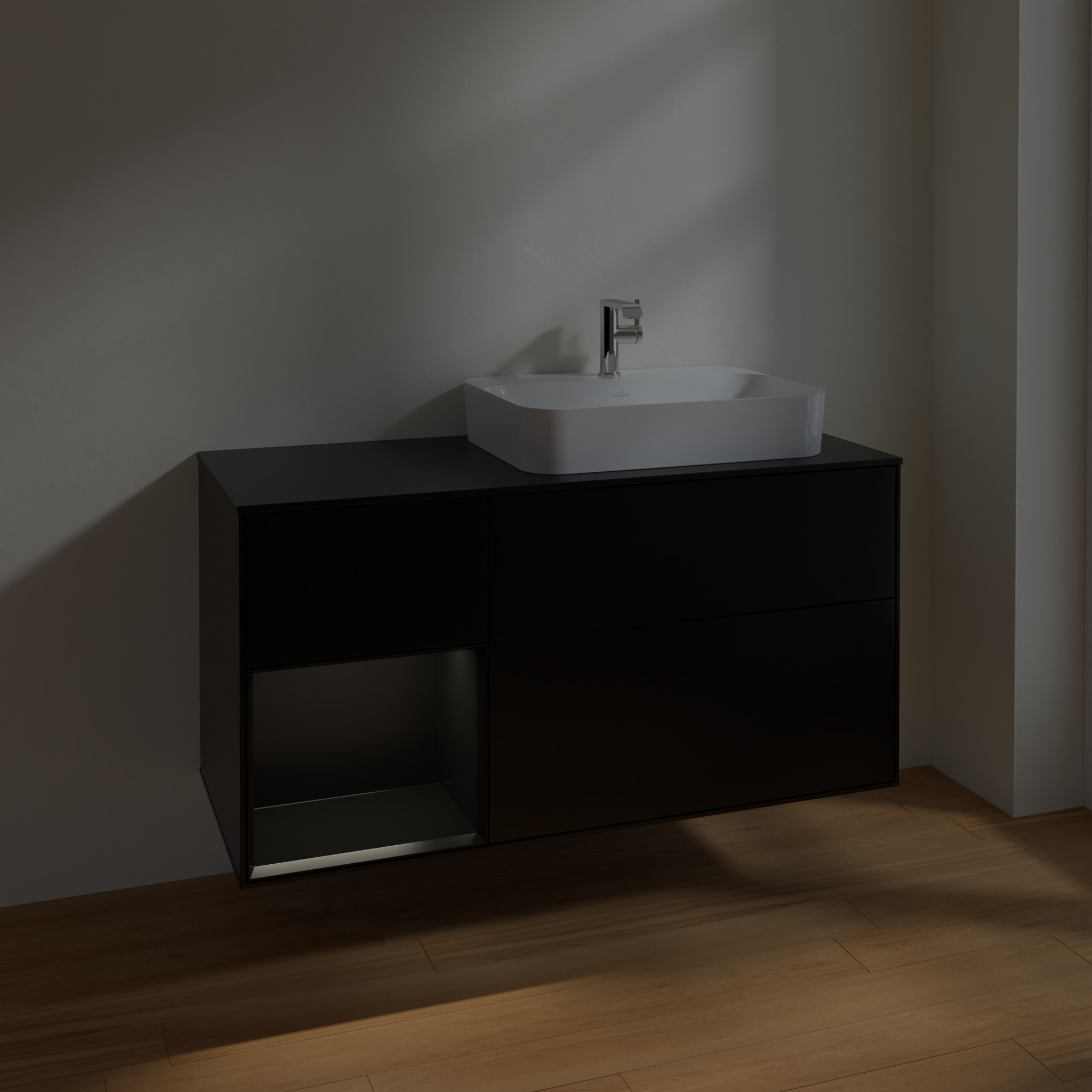 Finion Waschbeckenunterschrank, mit Beleuchtung, 3 Auszüge, 1200x603x501mm, Korpus: Black Matt Lacquer, Front: Black Matt Lacquer, Regalelement: Black Matt Lacquer, Abdeckplatte: Glass Black Matt