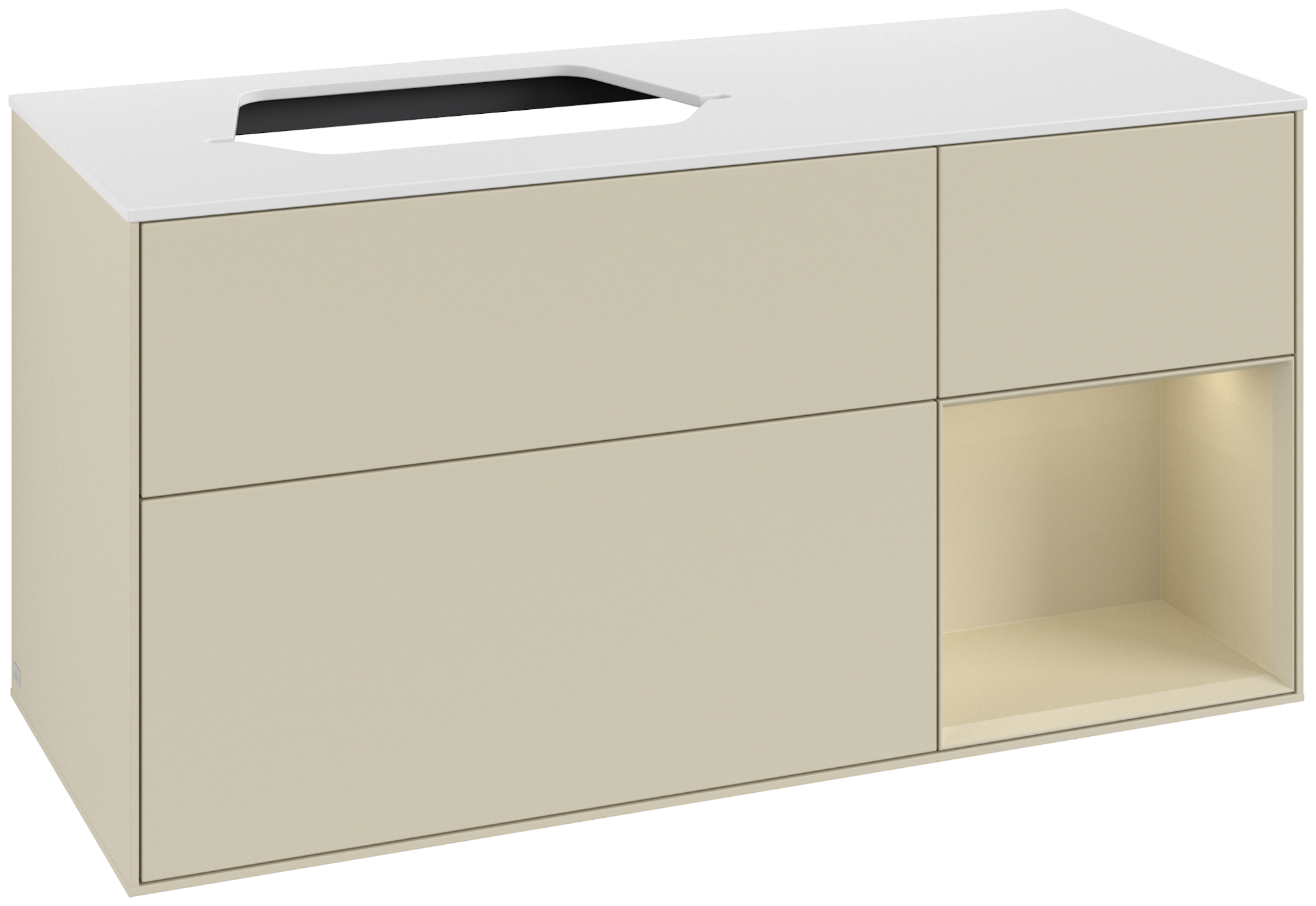 Finion Waschbeckenunterschrank, mit Beleuchtung, 3 Auszüge, 1200x603x501mm, Korpus: Silk Grey Matt Lacquer, Front: Silk Grey Matt Lacquer, Regalelement: Silk Grey Matt Lacquer, Abdeckplatte: Glass White Matt
