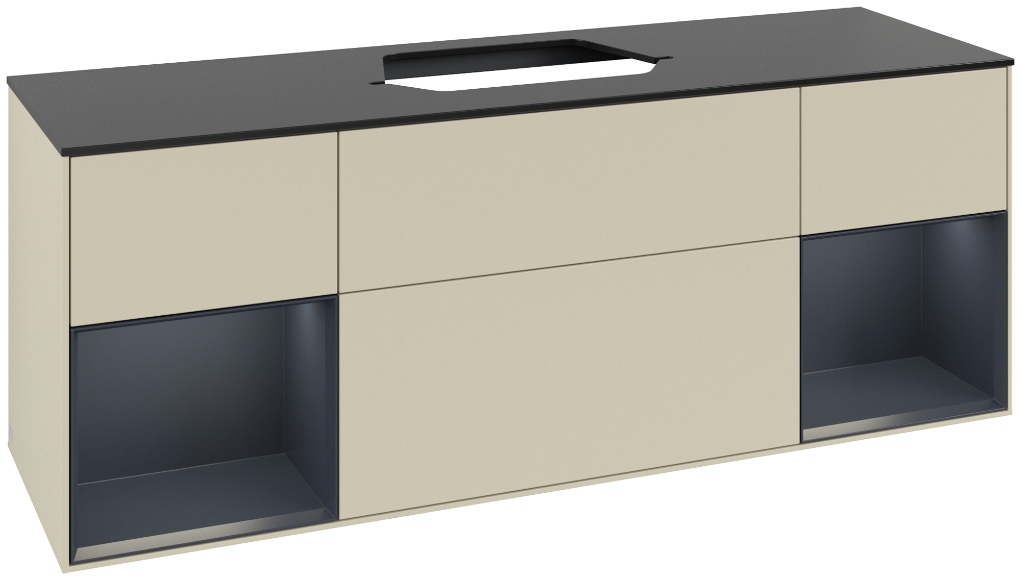 Finion Waschbeckenunterschrank, mit Beleuchtung, 4 Auszüge, 1600x603x501mm, Korpus: Silk Grey Matt Lacquer, Front: Silk Grey Matt Lacquer, Regalelement: Midnight Blue Matt Lacquer, Abdeckplatte: Glass Black Matt