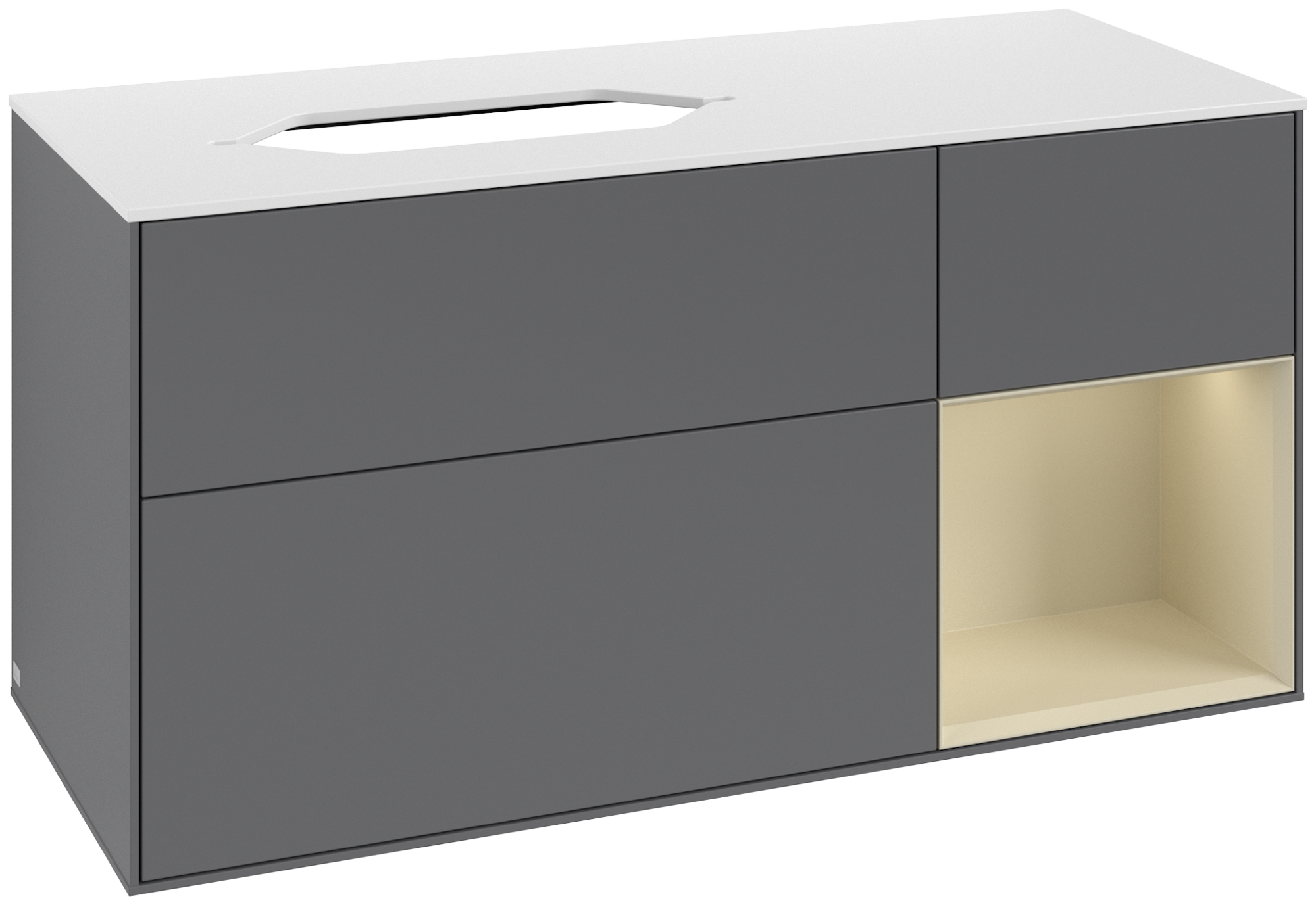 Finion Waschbeckenunterschrank, mit Beleuchtung, 3 Auszüge, 1200x603x501mm, Korpus: Anthracite Matt Lacquer, Front: Anthracite Matt Lacquer, Regalelement: Silk Grey Matt Lacquer, Abdeckplatte: Glass White Matt