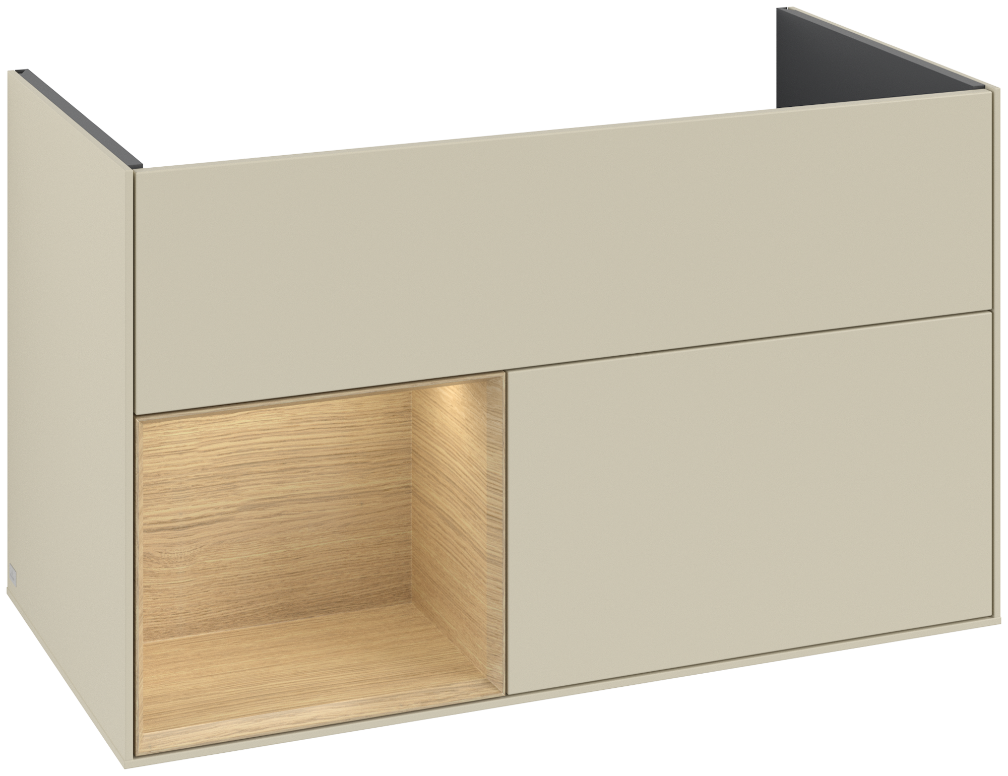 Finion Waschbeckenunterschrank, mit Beleuchtung, 2 Auszüge, 996x591x498mm, Korpus: Silk Grey Matt Lacquer, Front: Silk Grey Matt Lacquer, Regalelement: Oak Veneer
