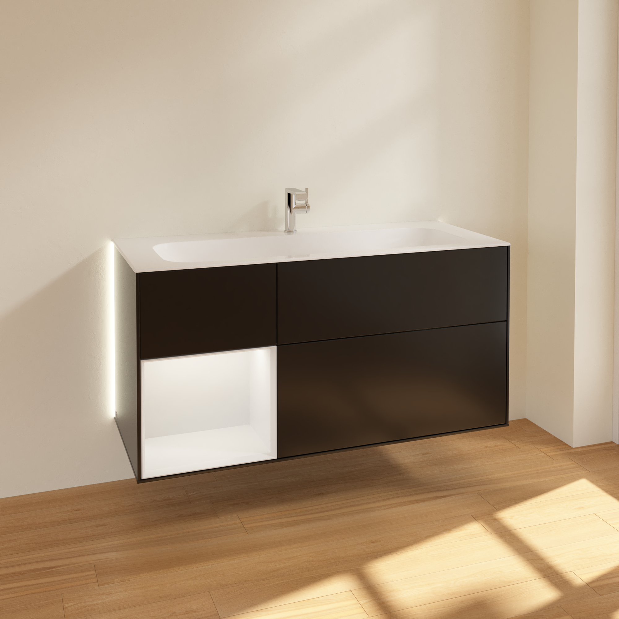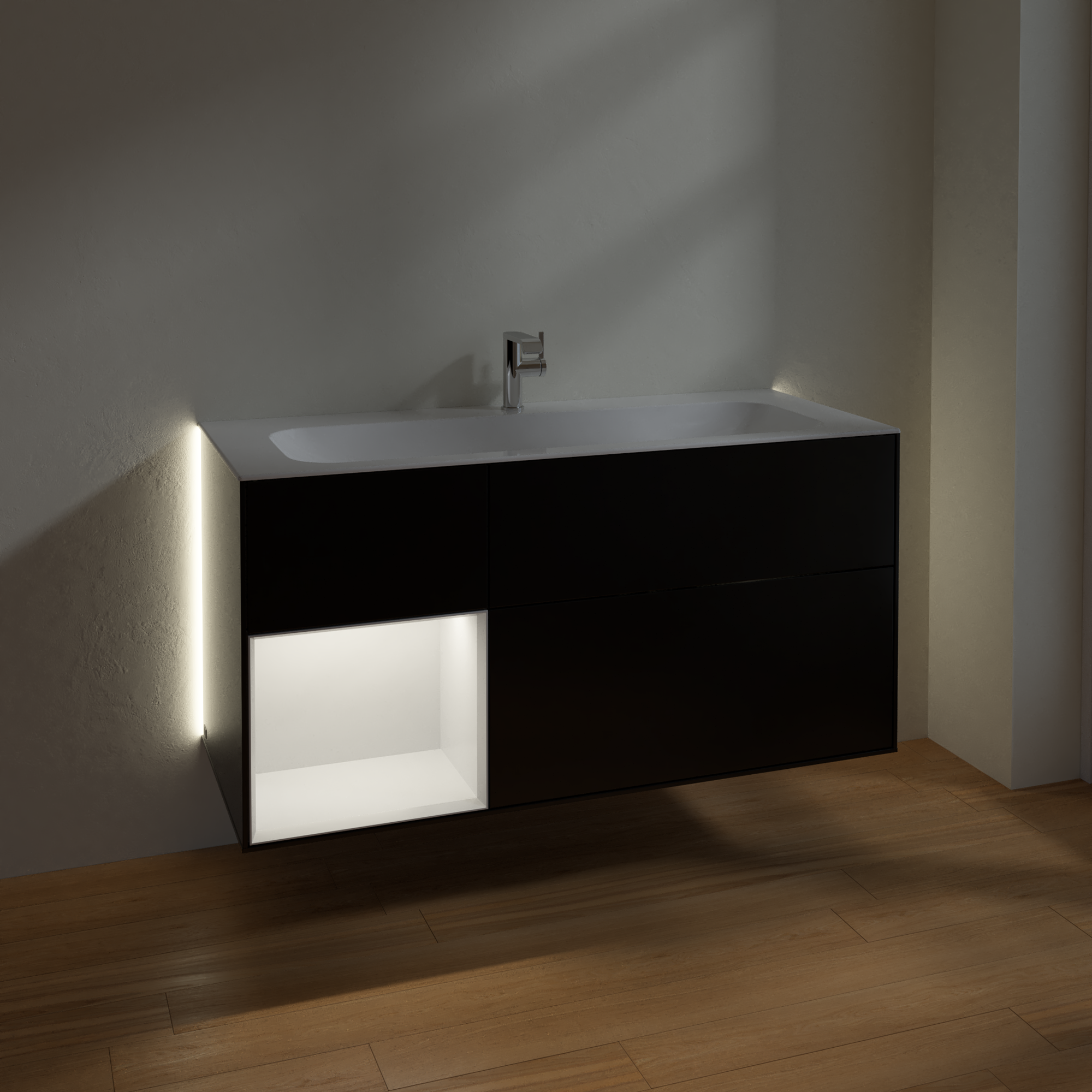 Finion Waschbeckenunterschrank, mit Beleuchtung, 3 Auszüge, 1196x591x498mm, Korpus: Black Matt Lacquer, Front: Black Matt Lacquer, Regalelement: Gold Matt Lacquer