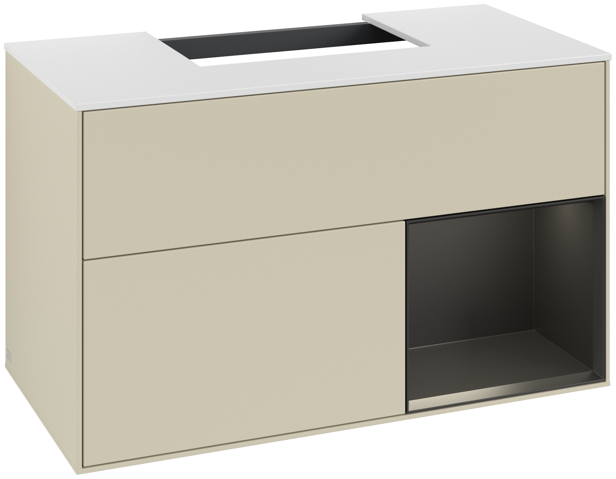 Finion Waschbeckenunterschrank, mit Beleuchtung, 2 Auszüge, 1000x603x501mm, Korpus: Silk Grey Matt Lacquer, Front: Silk Grey Matt Lacquer, Regalelement: Black Matt Lacquer, Abdeckplatte: Glass White Matt
