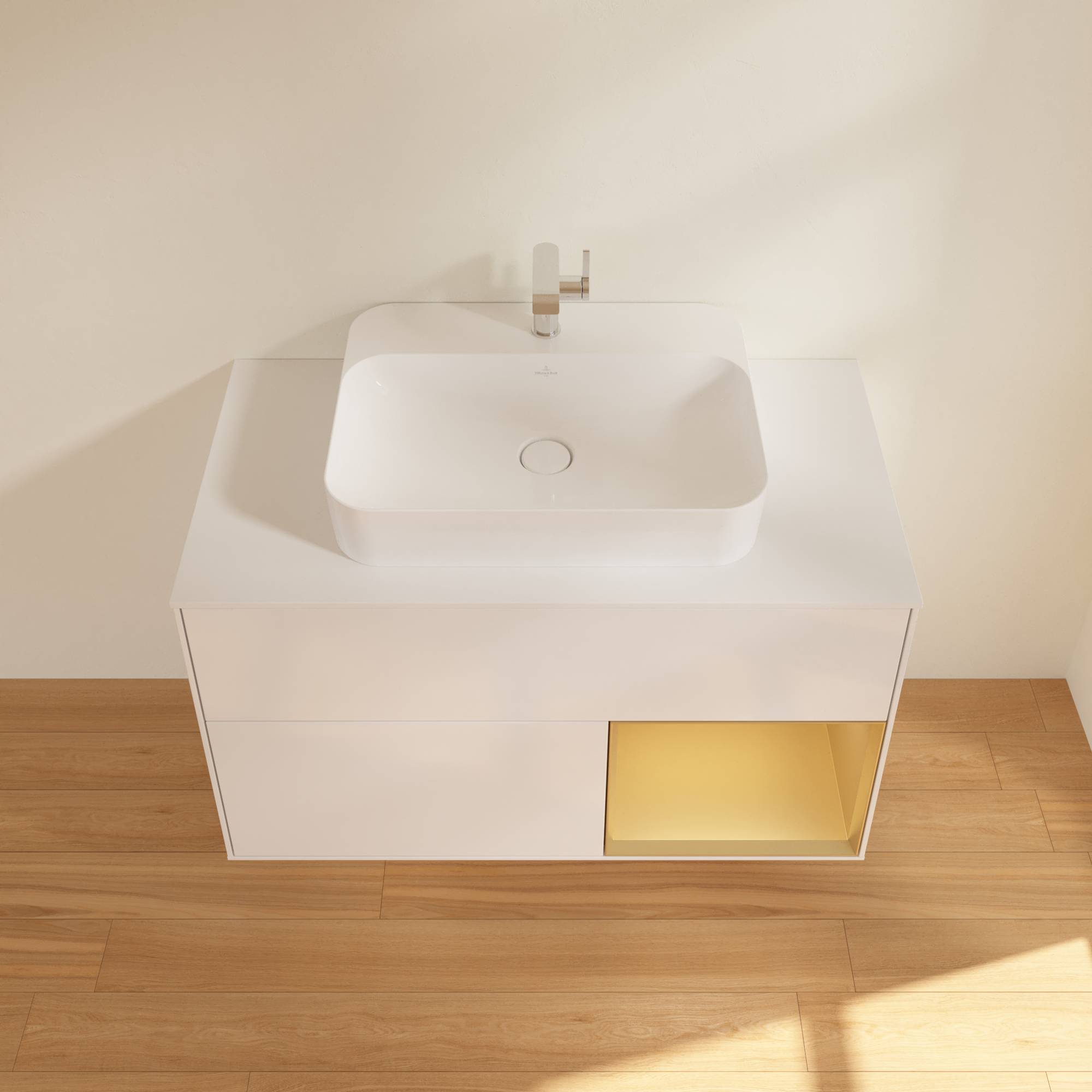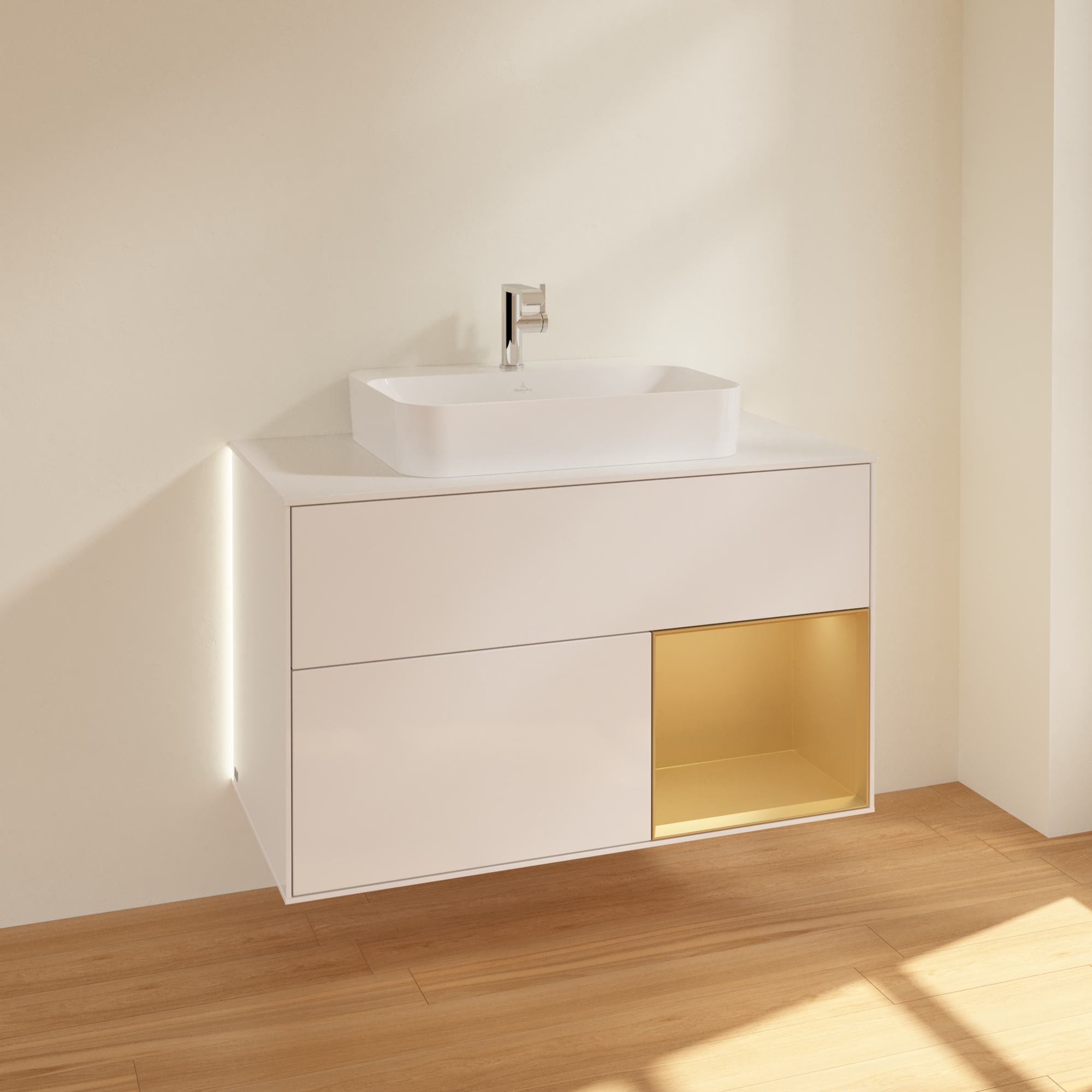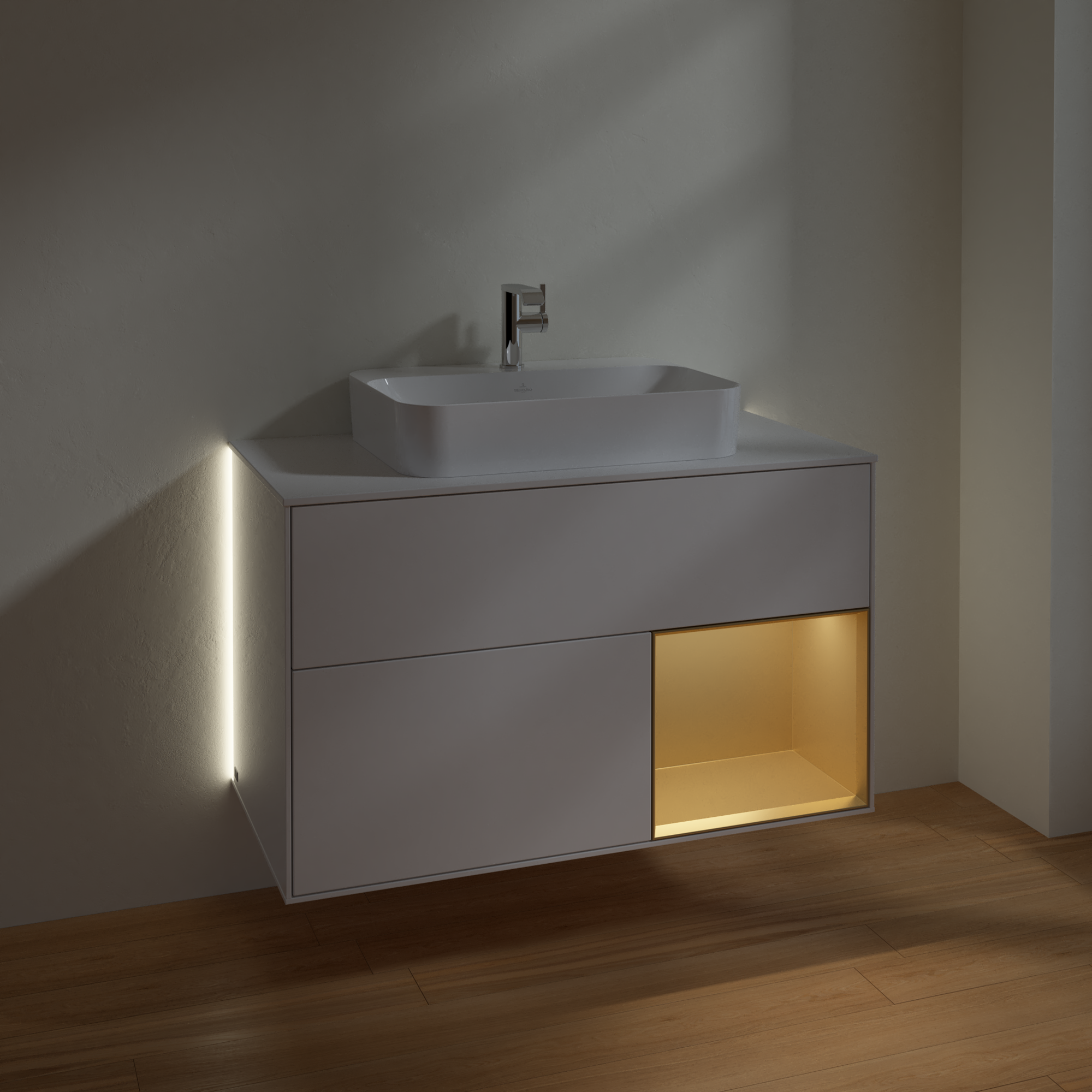 Finion Waschbeckenunterschrank, mit Beleuchtung, 2 Auszüge, 1000x603x501mm, Korpus: Glossy White Lacquer, Front: Glossy White Lacquer, Regalelement: Gold Matt Lacquer, Abdeckplatte: Glass White Matt
