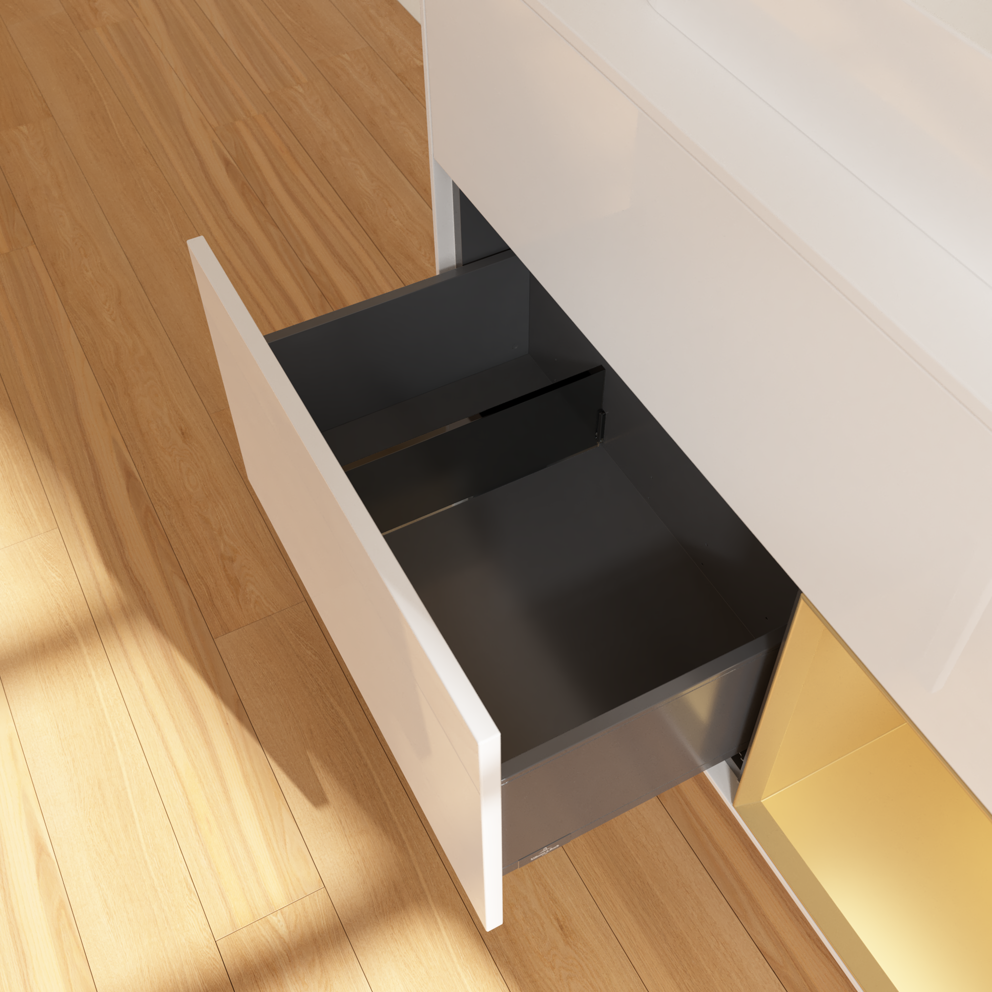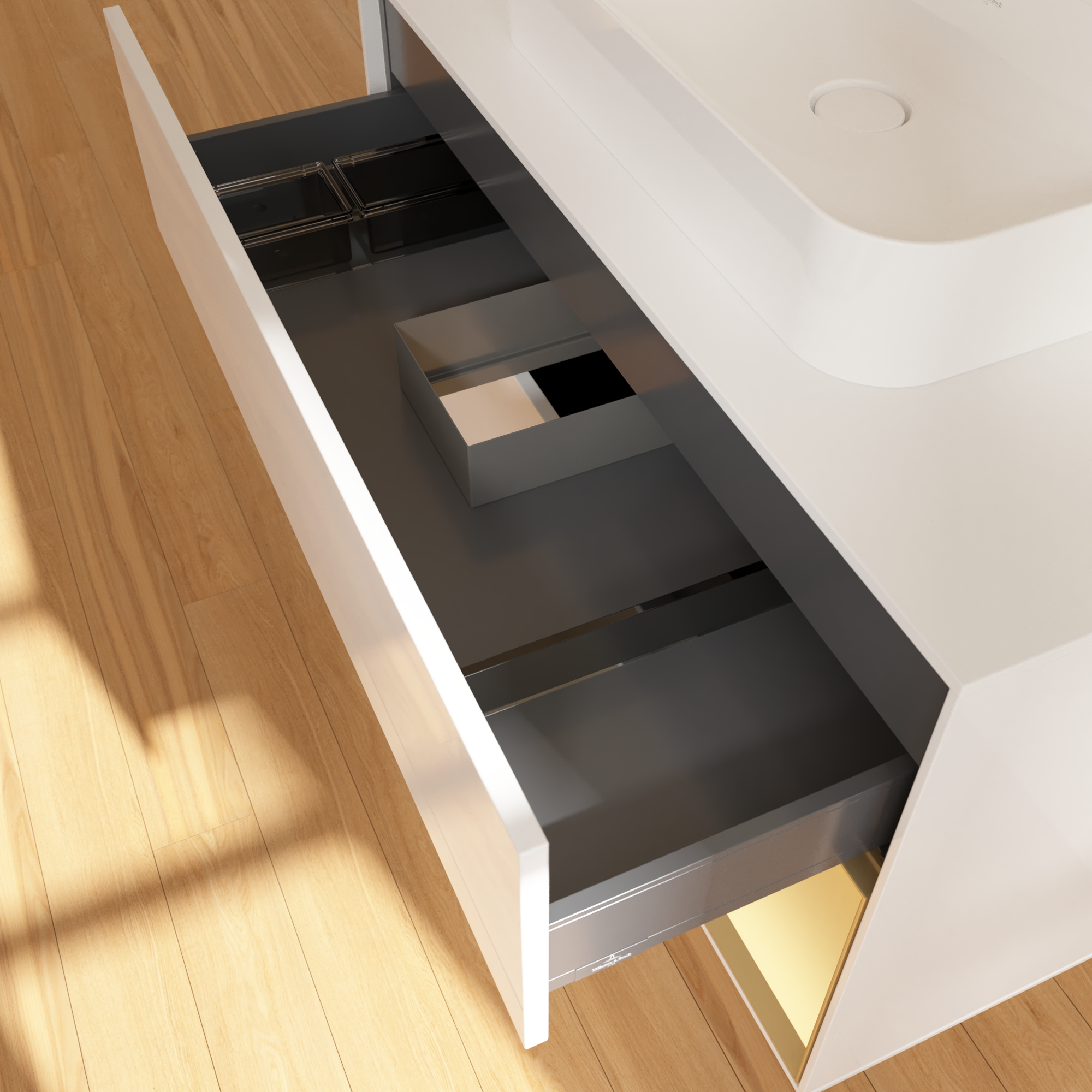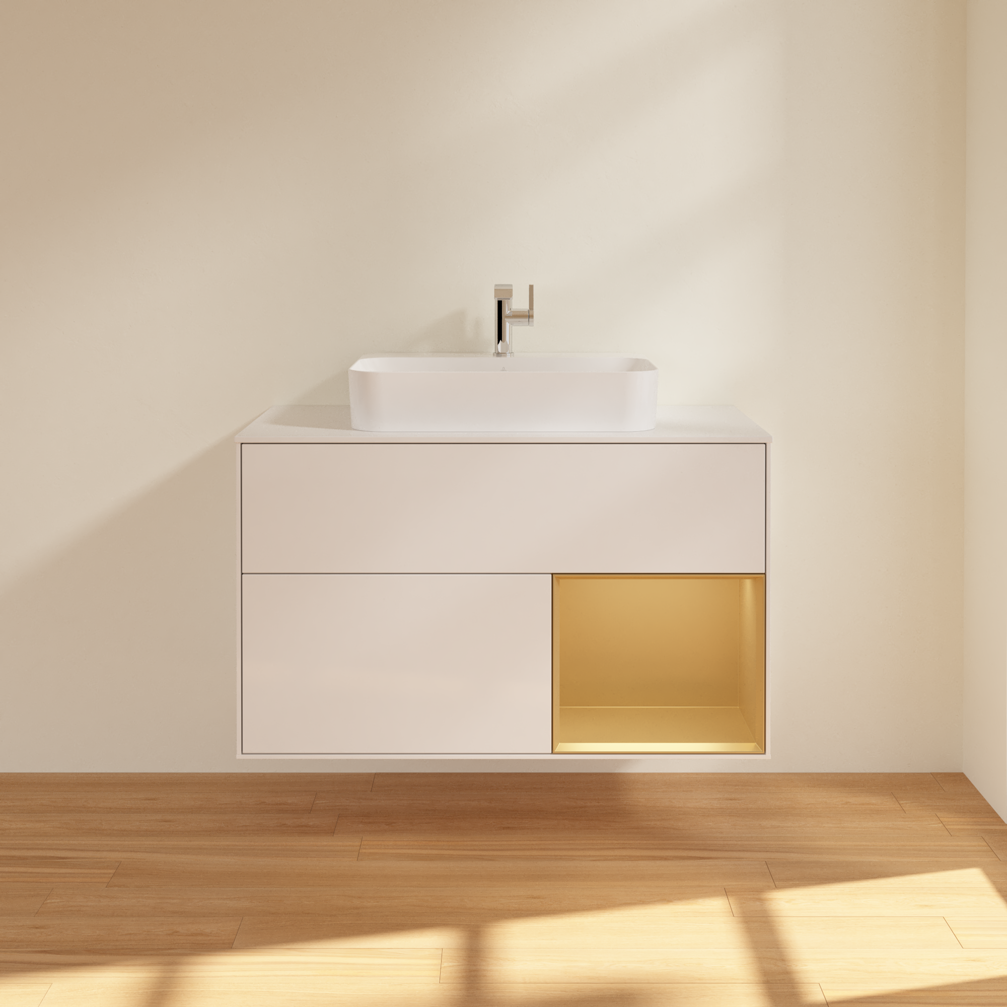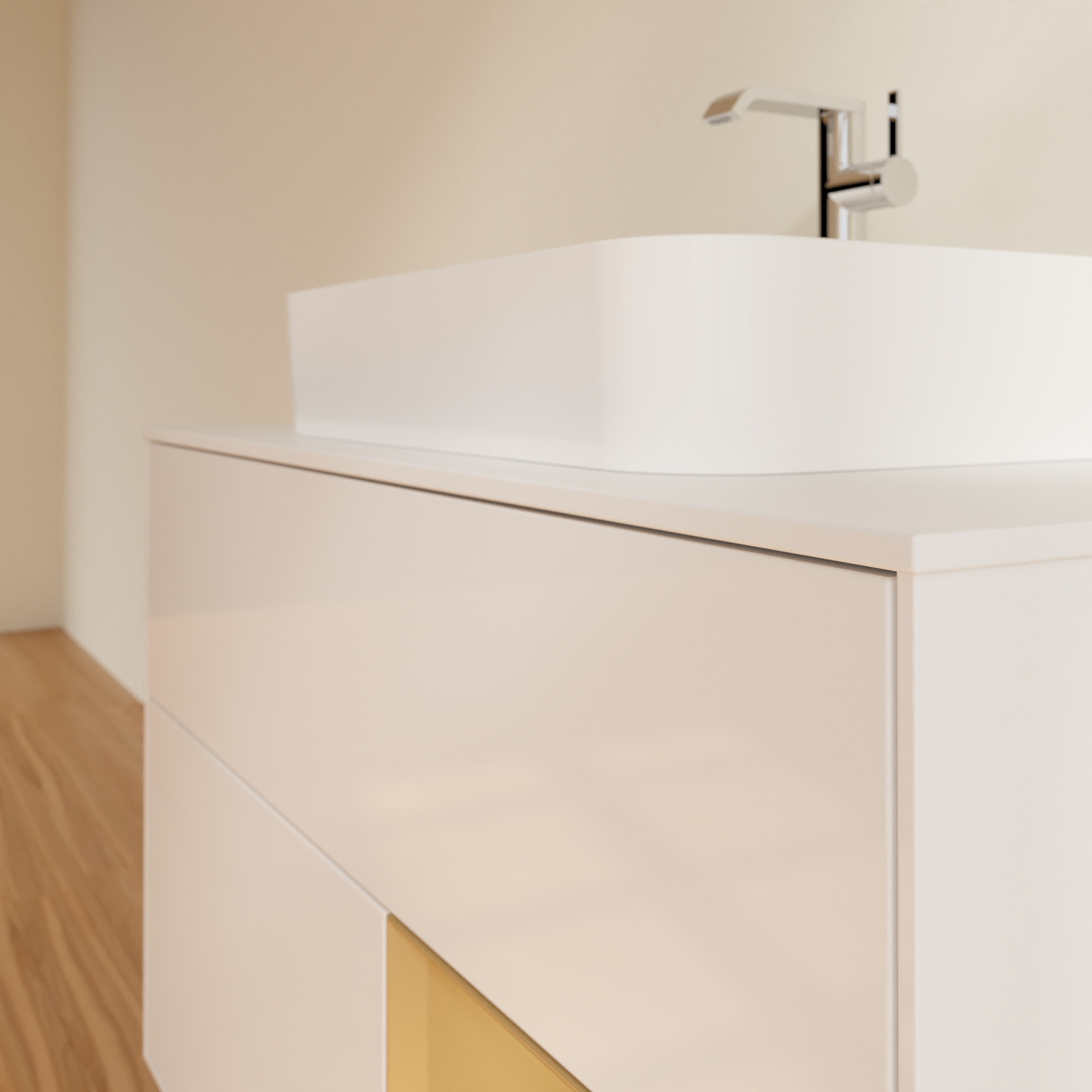 Finion Waschbeckenunterschrank, mit Beleuchtung, 2 Auszüge, 1000x603x501mm, Korpus: Glossy White Lacquer, Front: Glossy White Lacquer, Regalelement: Gold Matt Lacquer, Abdeckplatte: Glass White Matt