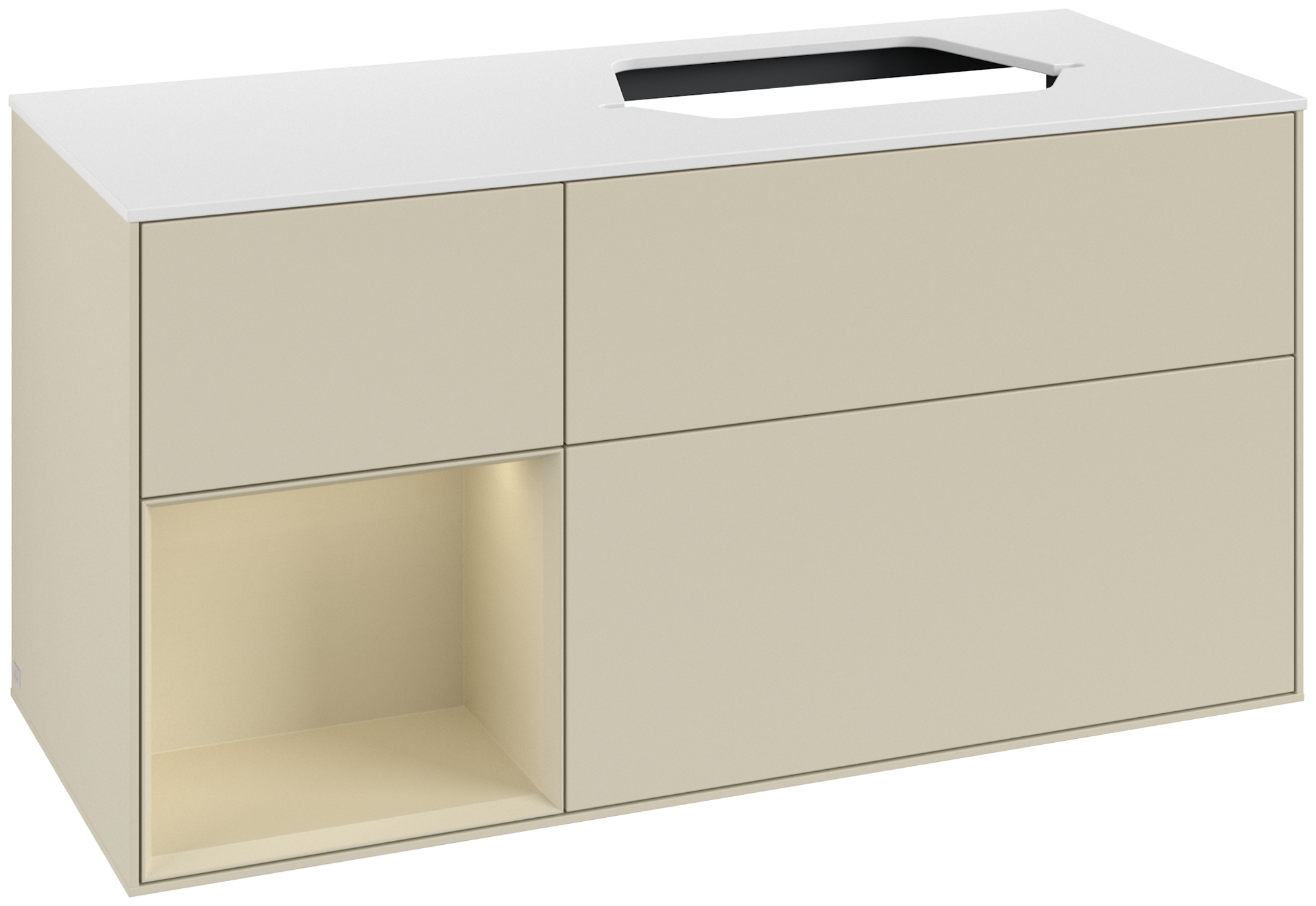 Finion Waschbeckenunterschrank, mit Beleuchtung, 3 Auszüge, 1200x603x501mm, Korpus: Silk Grey Matt Lacquer, Front: Silk Grey Matt Lacquer, Regalelement: Silk Grey Matt Lacquer, Abdeckplatte: Glass White Matt