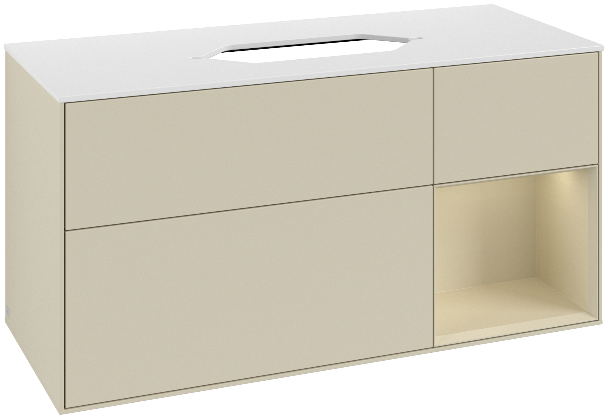 Finion Waschbeckenunterschrank, mit Beleuchtung, 3 Auszüge, 1200x603x501mm, Korpus: Silk Grey Matt Lacquer, Front: Silk Grey Matt Lacquer, Regalelement: Silk Grey Matt Lacquer, Abdeckplatte: Glass White Matt