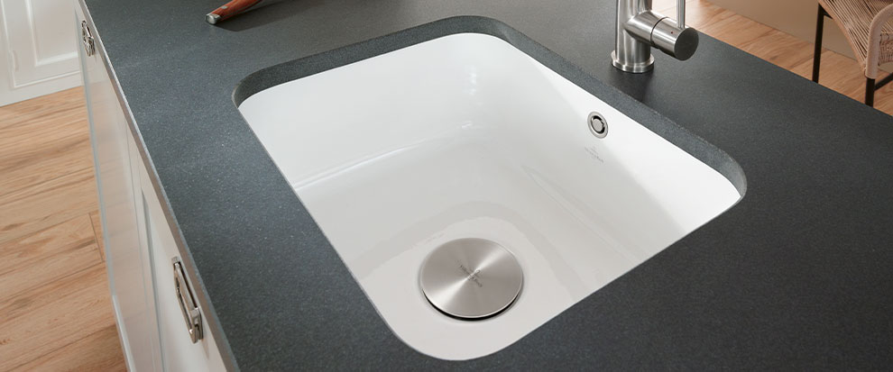 Die Kombination aus edler Arbeitsfläche und elegantem Spülbereich machen Küchen in jeder Größenordnung zu einem attraktiven Blickfang.