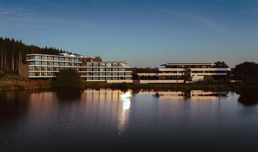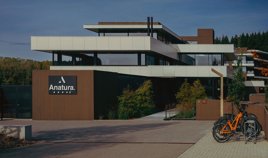 Anatura Luxembourg is a 4-star superior hotel inspired by a new architectural interpretation of sustainable tourism. Situated in the heart of the lake landscape of Weiswampach, the resort combines clear geometries with natural design elements. Large window facades and an open layout create flowing transitions between the outdoor world and indoor spaces. The four-storey structure with 90 bedrooms, a large events area and gourmet dining follows a stringent design concept: minimalism, naturalness and longevity.