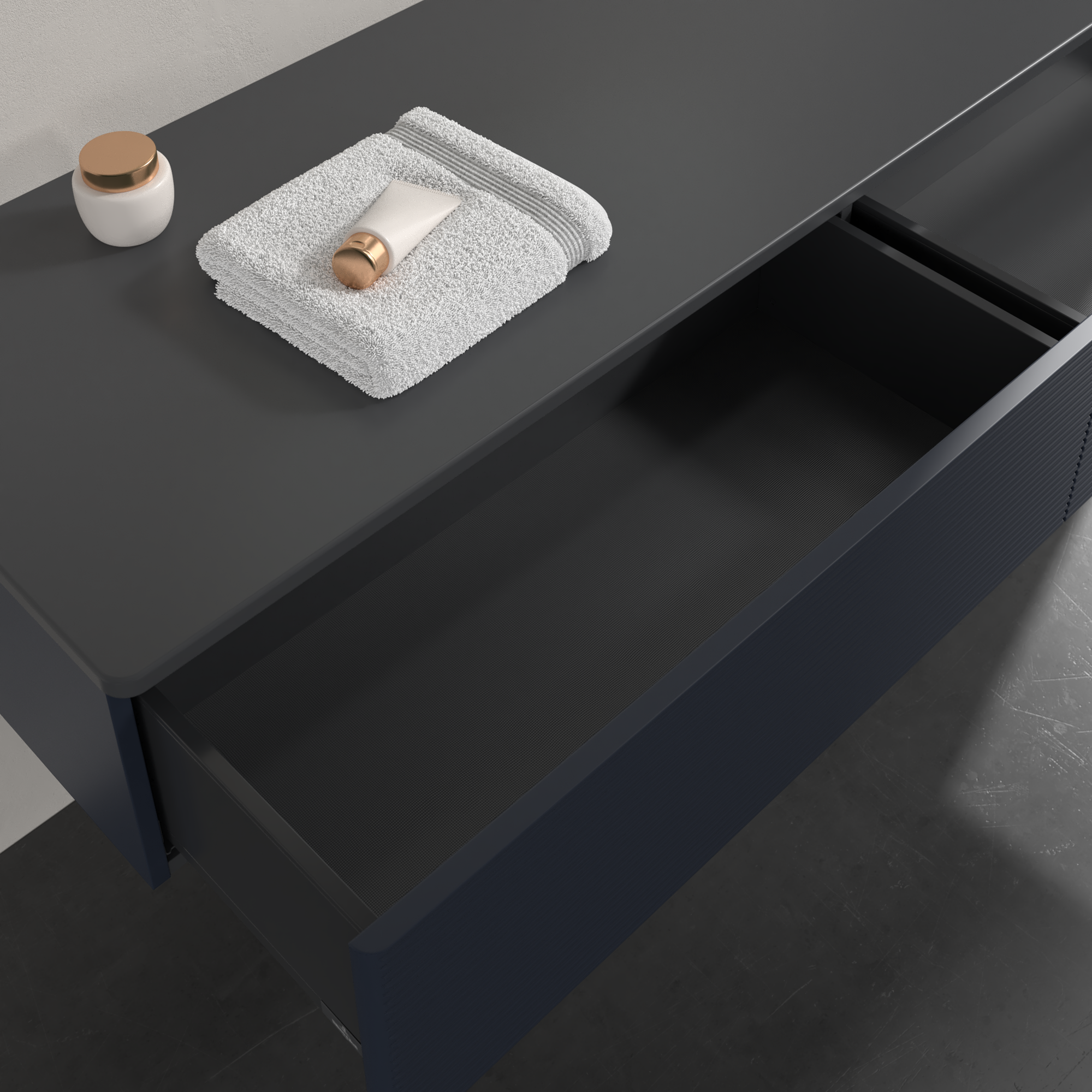 Antao Sideboard, 2 pull-out compartments, 1600x268x500mm, Front with grain texture, Body: Midnight Blue Matt Lacquer, Front: Midnight Blue Matt Lacquer, Cover plate: Honey Oak