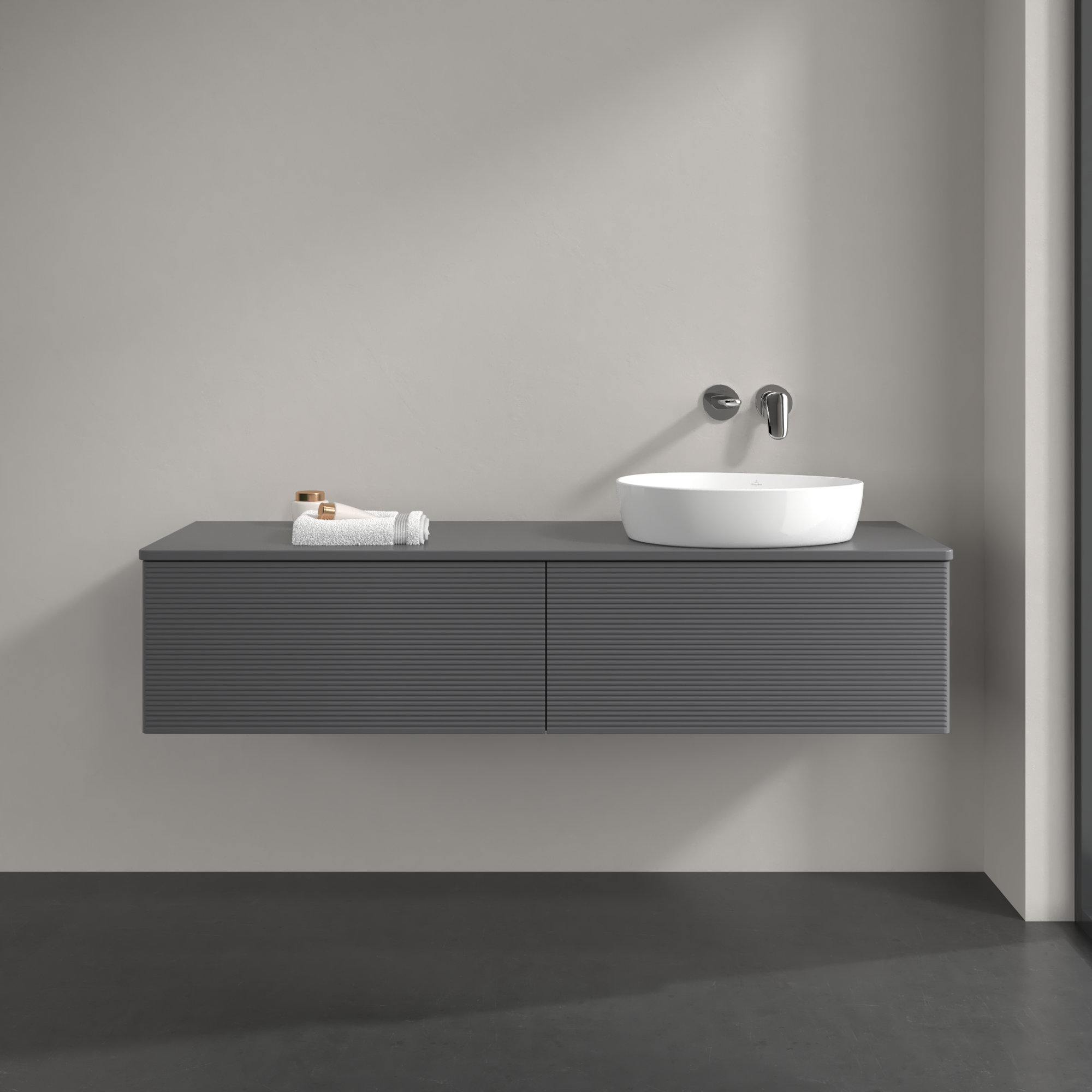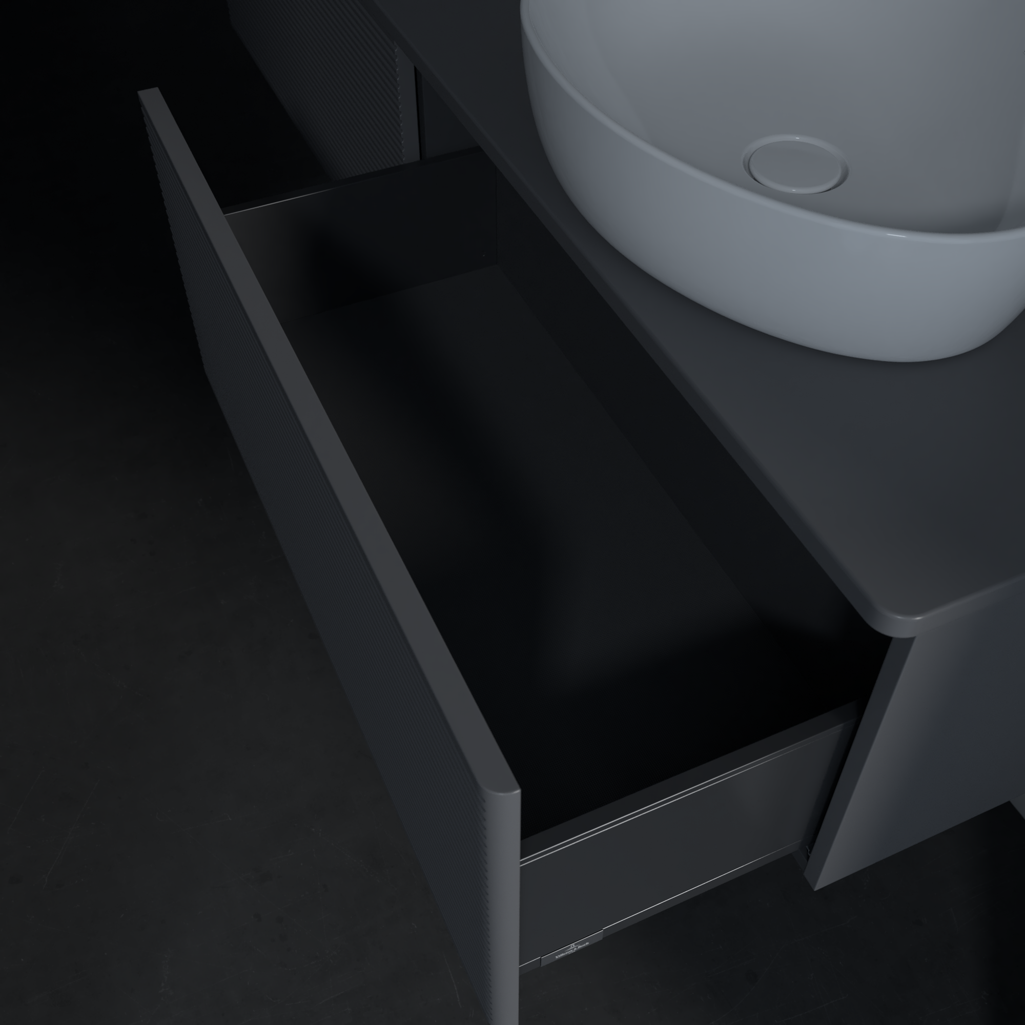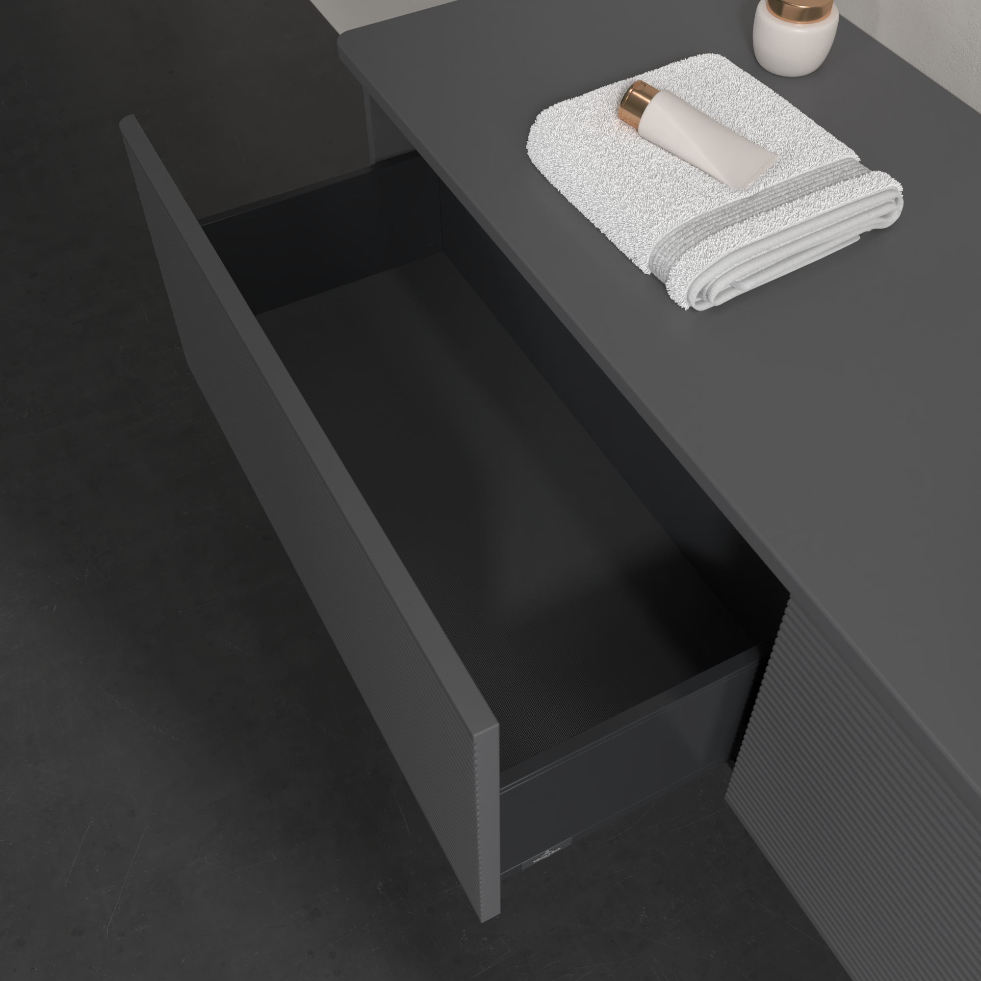 Antao Vanity unit, 2 pull-out compartments, 1600x360x500mm, Front with grain texture, Body: Anthracite Matt Lacquer, Front: Anthracite Matt Lacquer, Cover plate: Anthracite Matt Lacquer