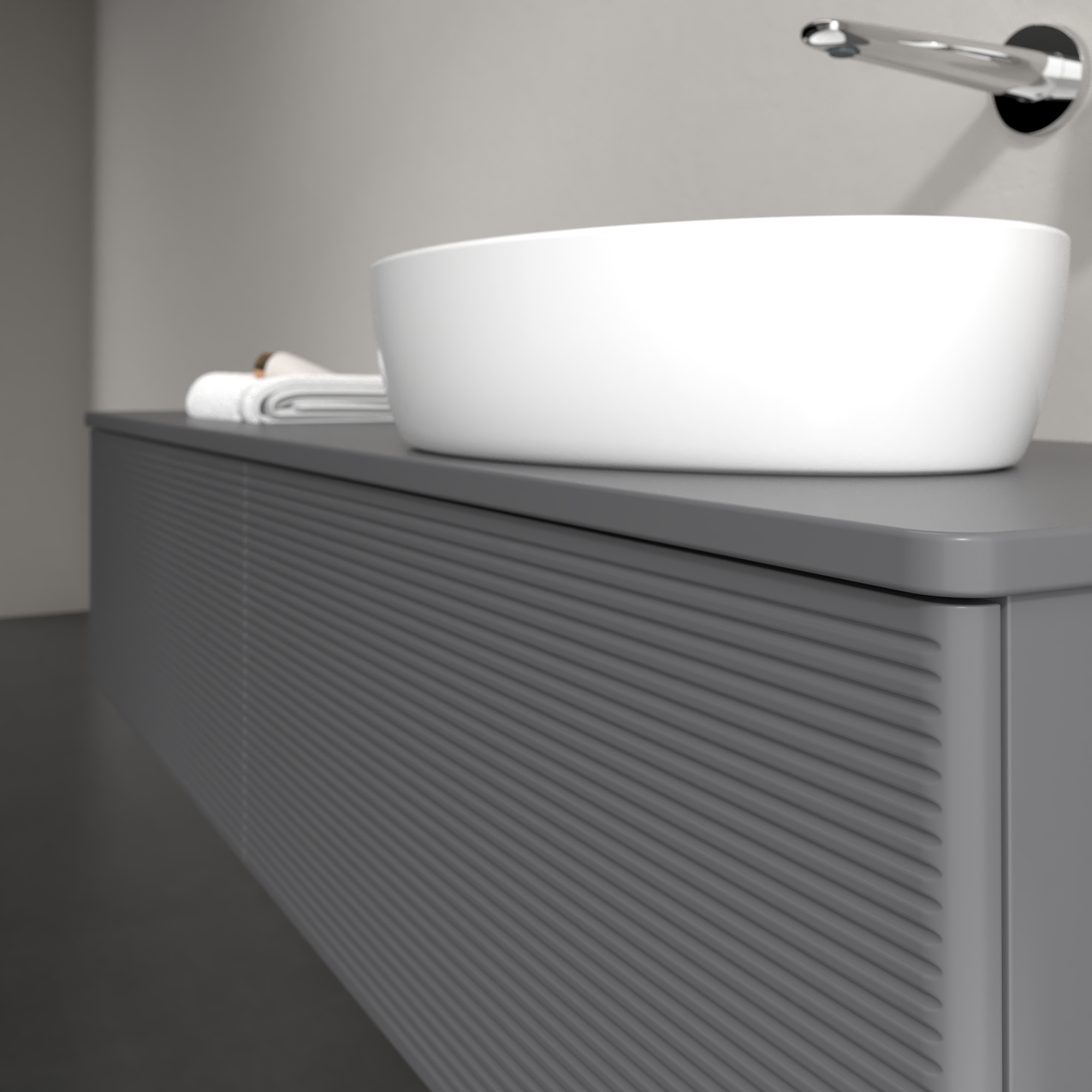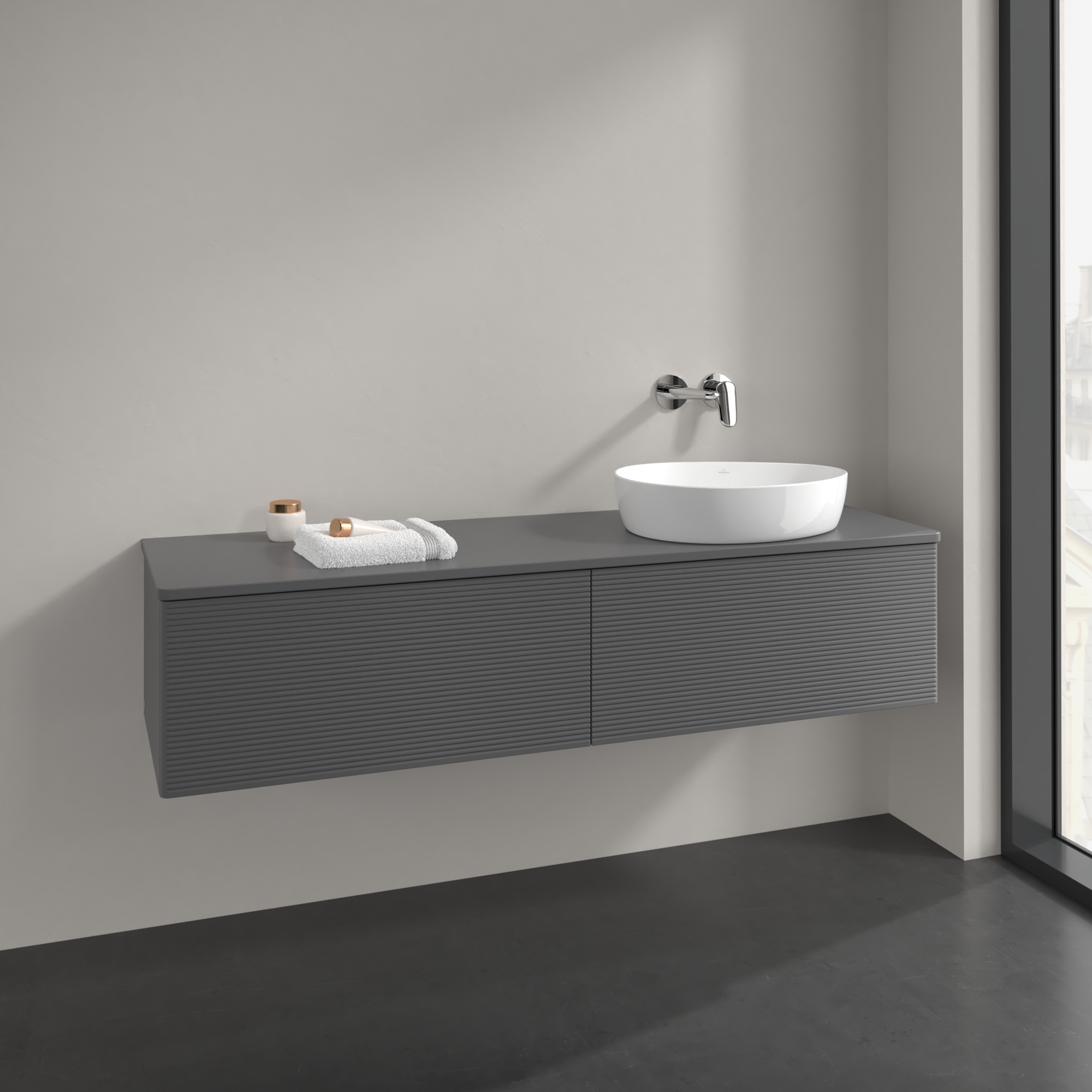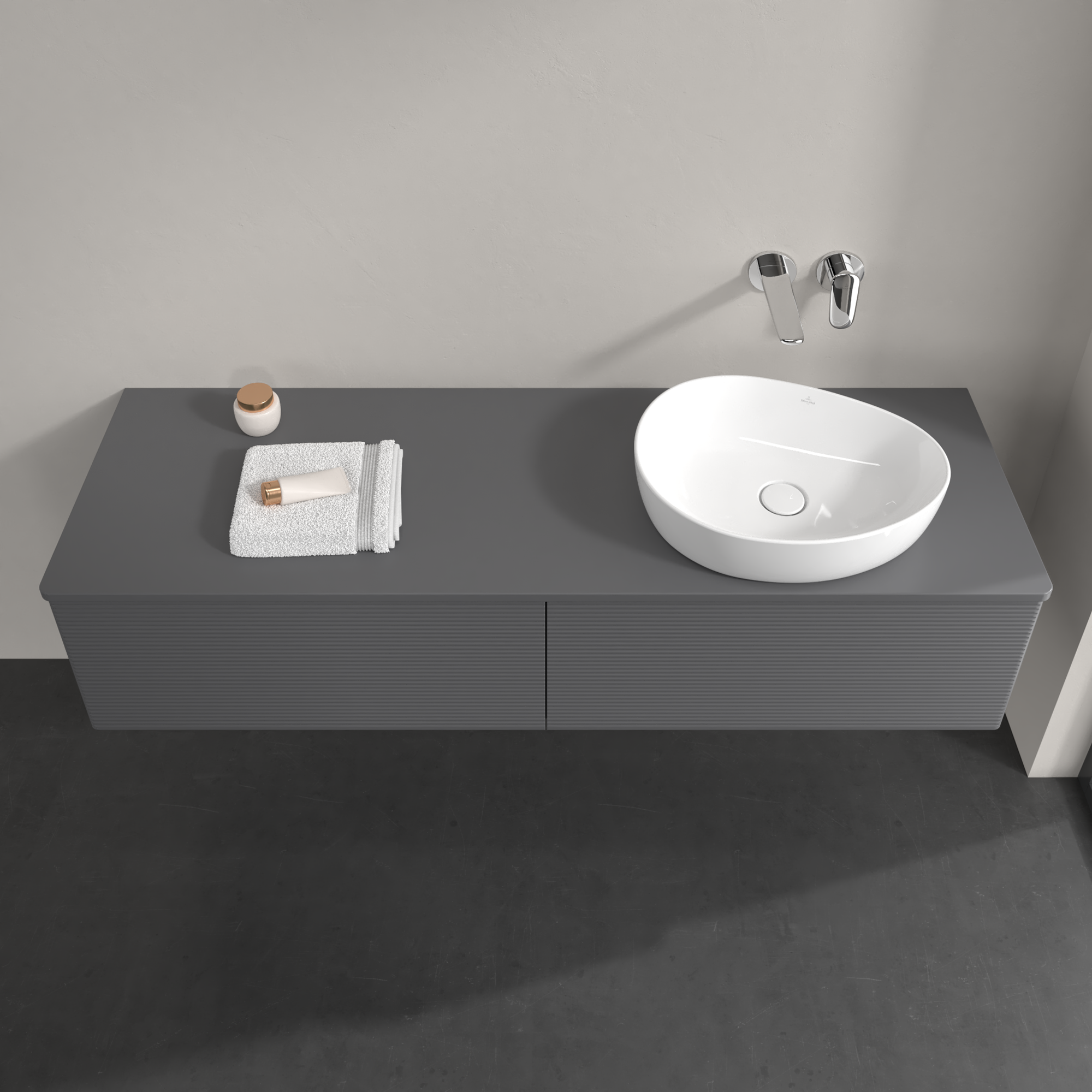 Antao Vanity unit, 2 pull-out compartments, 1600x360x500mm, Front with grain texture, Body: Anthracite Matt Lacquer, Front: Anthracite Matt Lacquer, Cover plate: Anthracite Matt Lacquer