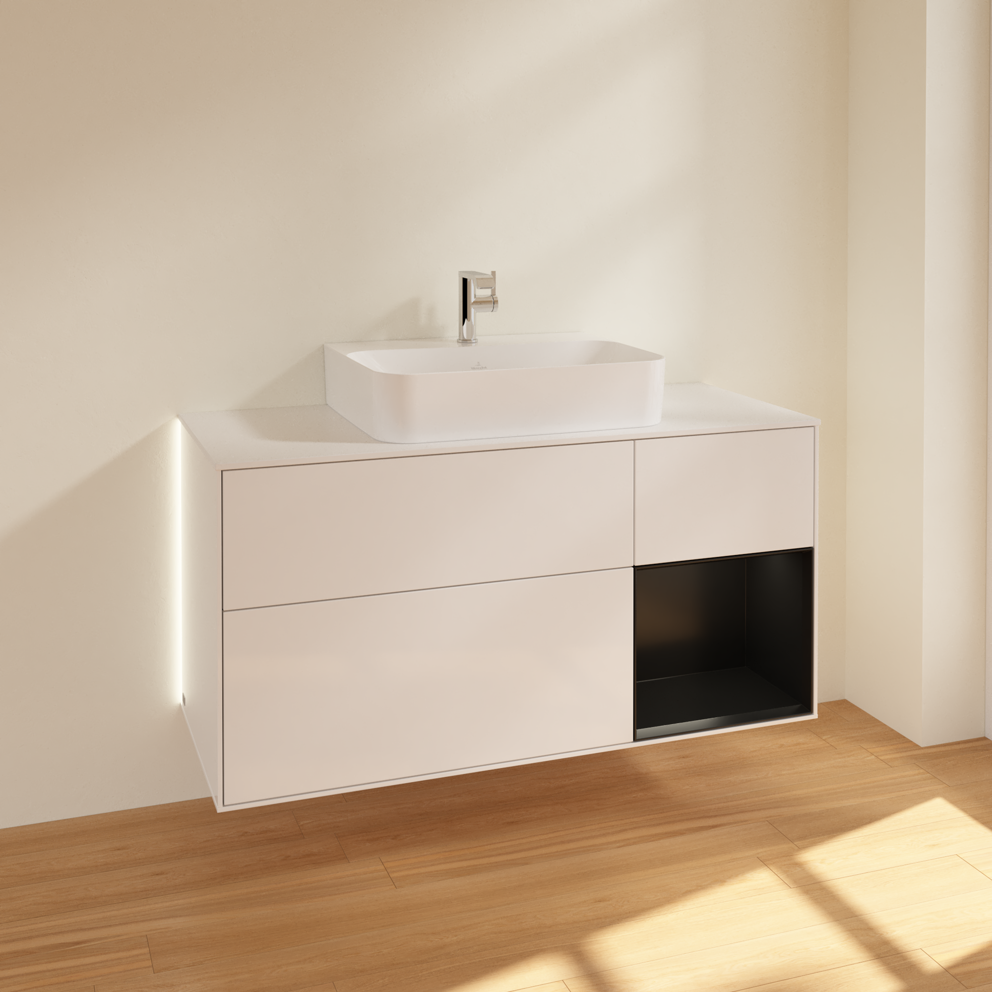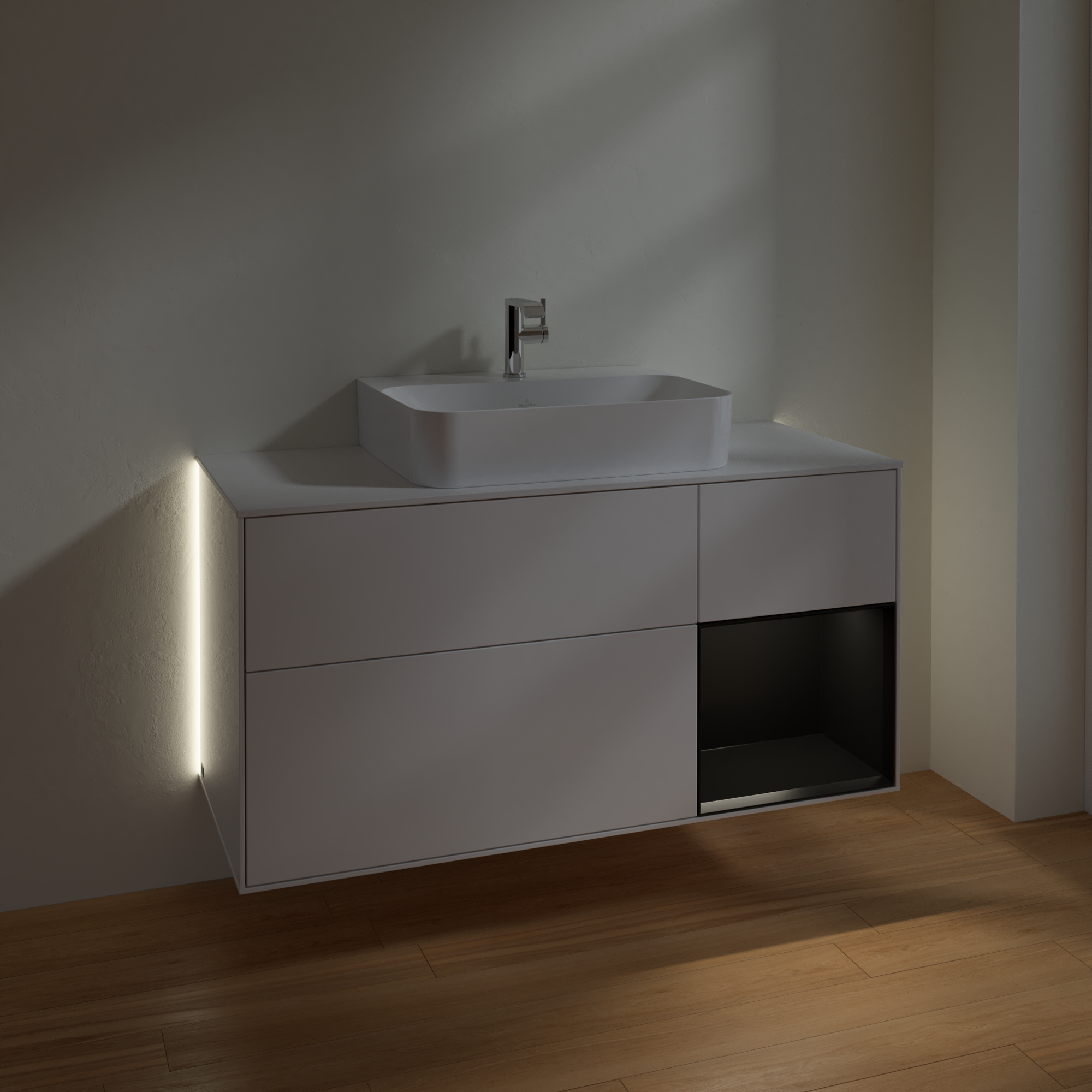 Finion Vanity unit, with lighting, 3 pull-out compartments, 1200x603x501mm, Body: Glossy White Lacquer, Front: Glossy White Lacquer, Shelf: Black Matt Lacquer, Cover plate: Glass White Matt