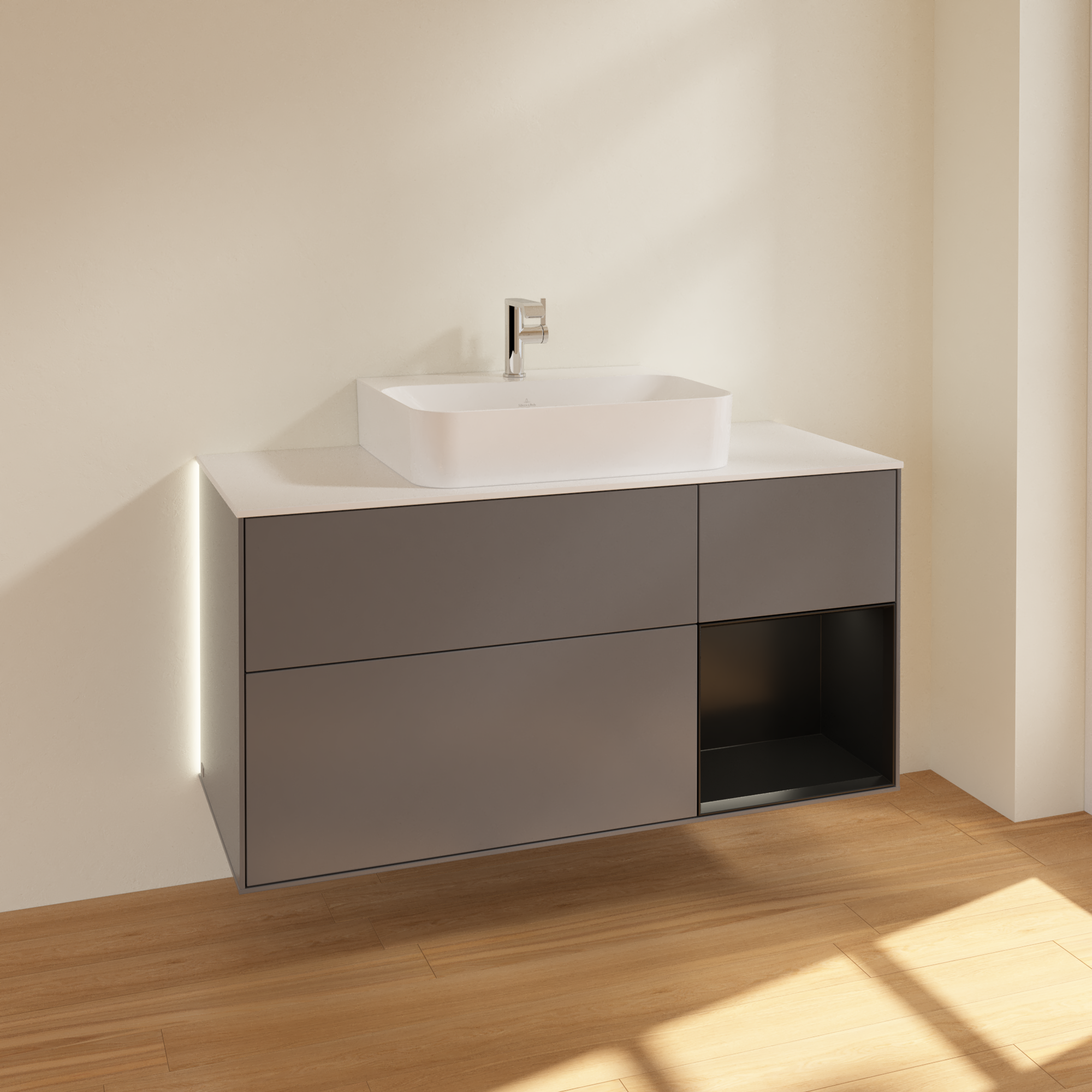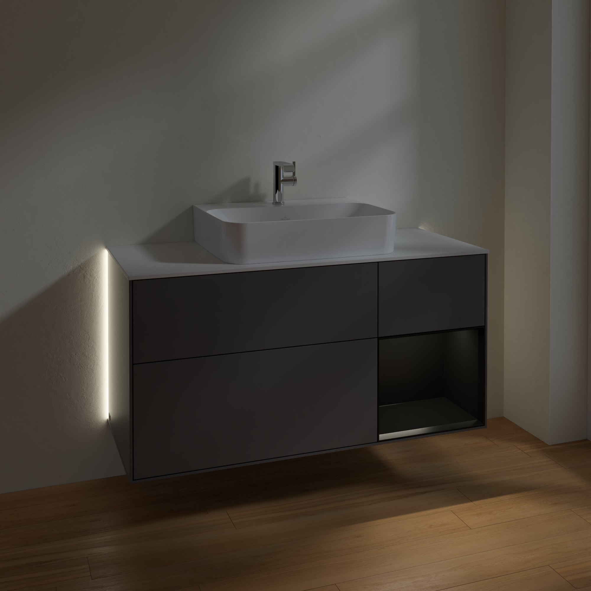 Finion Vanity unit, with lighting, 3 pull-out compartments, 1200x603x501mm, Body: Anthracite Matt Lacquer, Front: Anthracite Matt Lacquer, Shelf: Black Matt Lacquer, Cover plate: Glass White Matt
