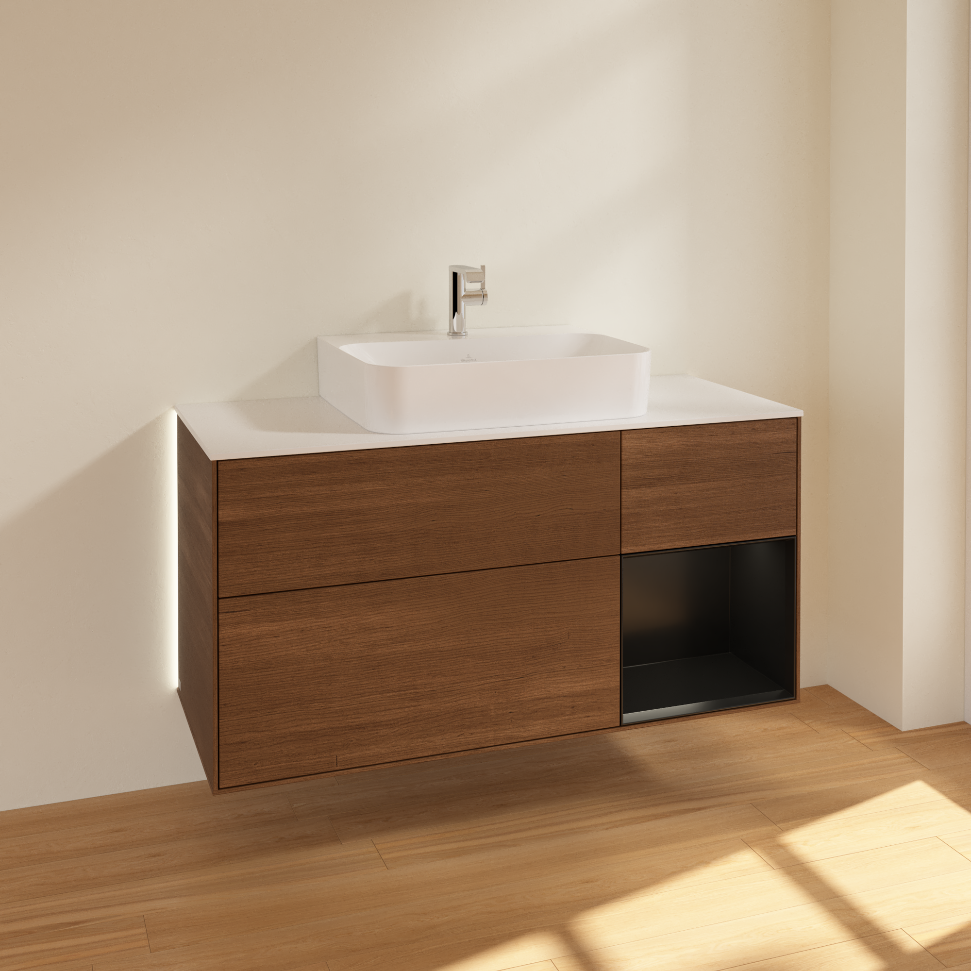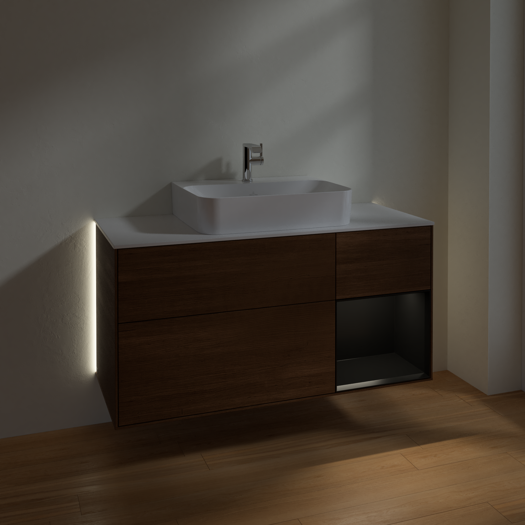 Finion Vanity unit, with lighting, 3 pull-out compartments, 1200x603x501mm, Body: Walnut Veneer, Front: Walnut Veneer, Shelf: Black Matt Lacquer, Cover plate: Glass White Matt
