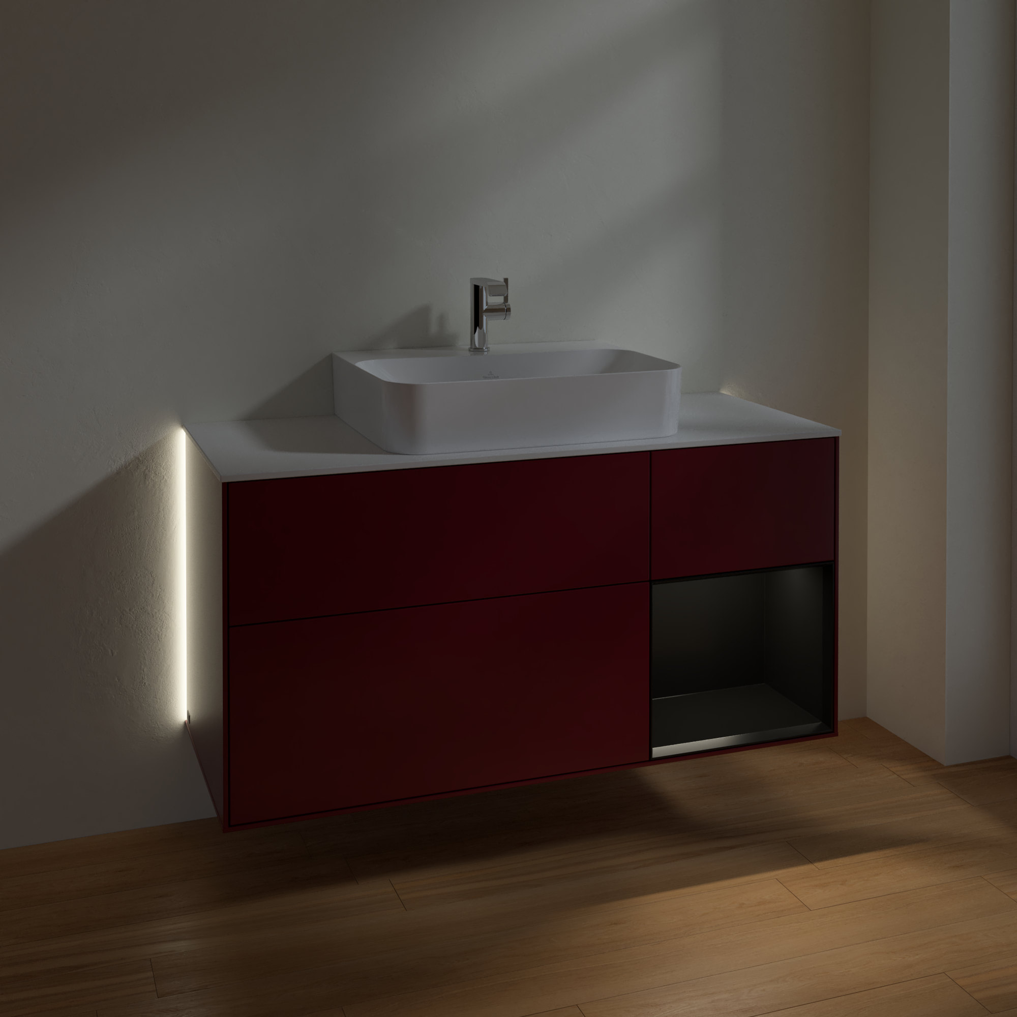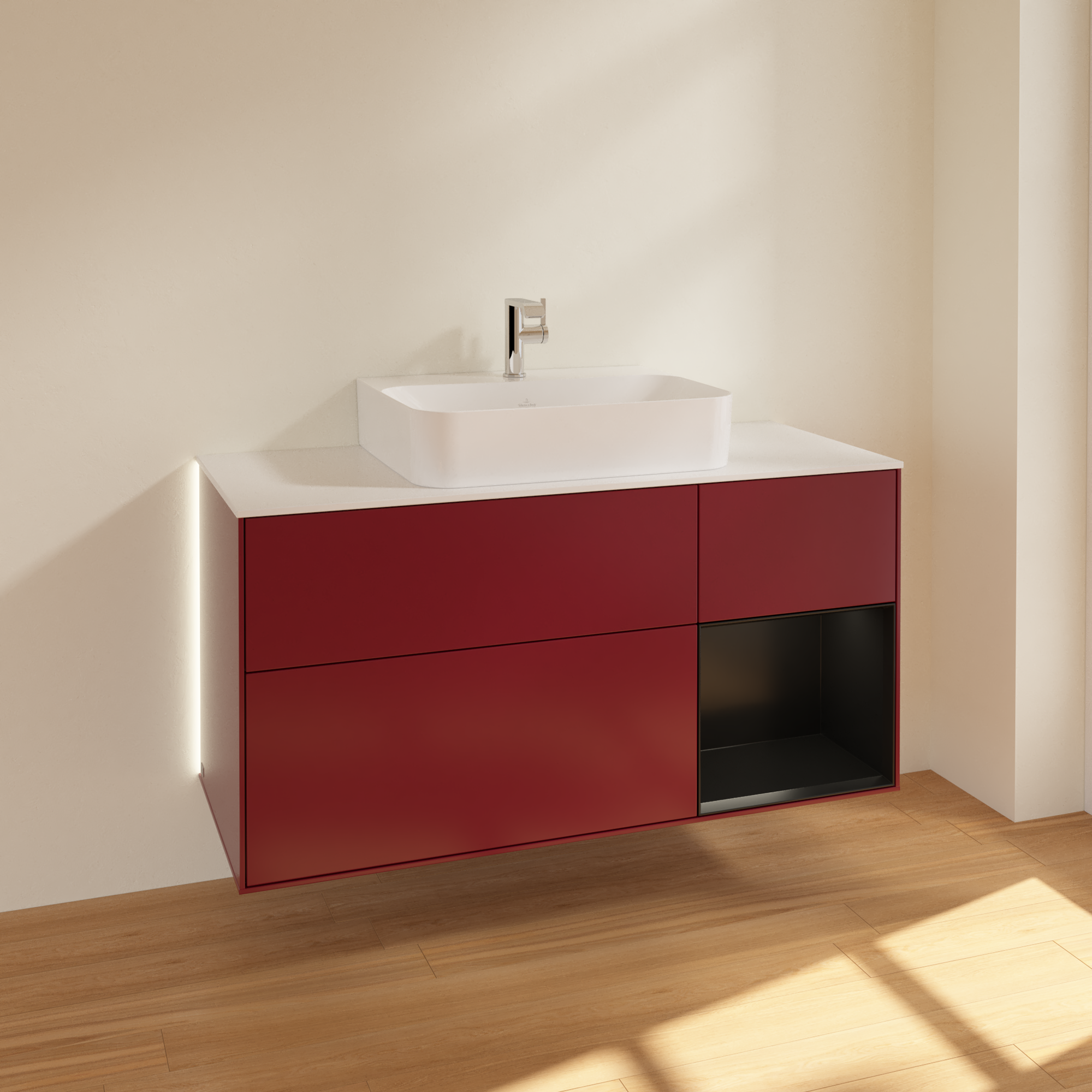 Finion Vanity unit, with lighting, 3 pull-out compartments, 1200x603x501mm, Body: Peony Matt Lacquer, Front: Peony Matt Lacquer, Shelf: Black Matt Lacquer, Cover plate: Glass White Matt