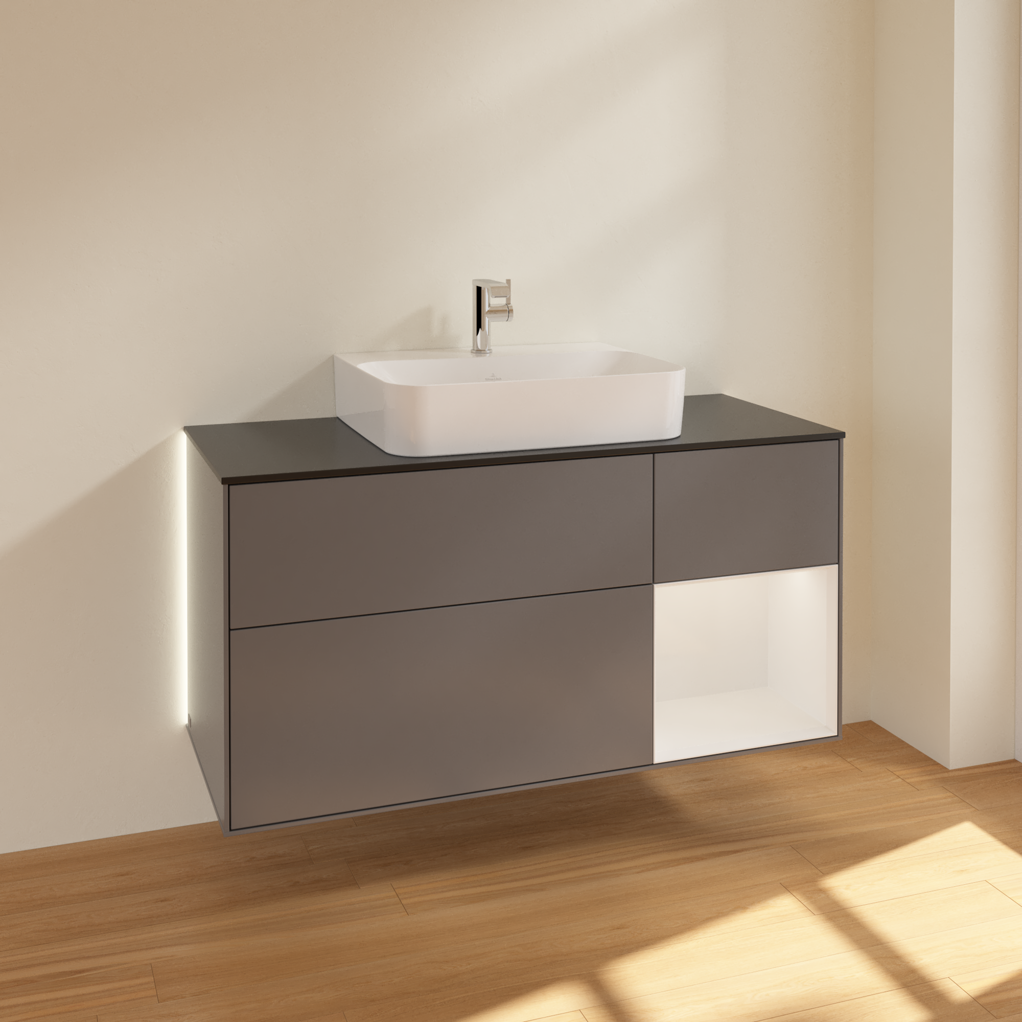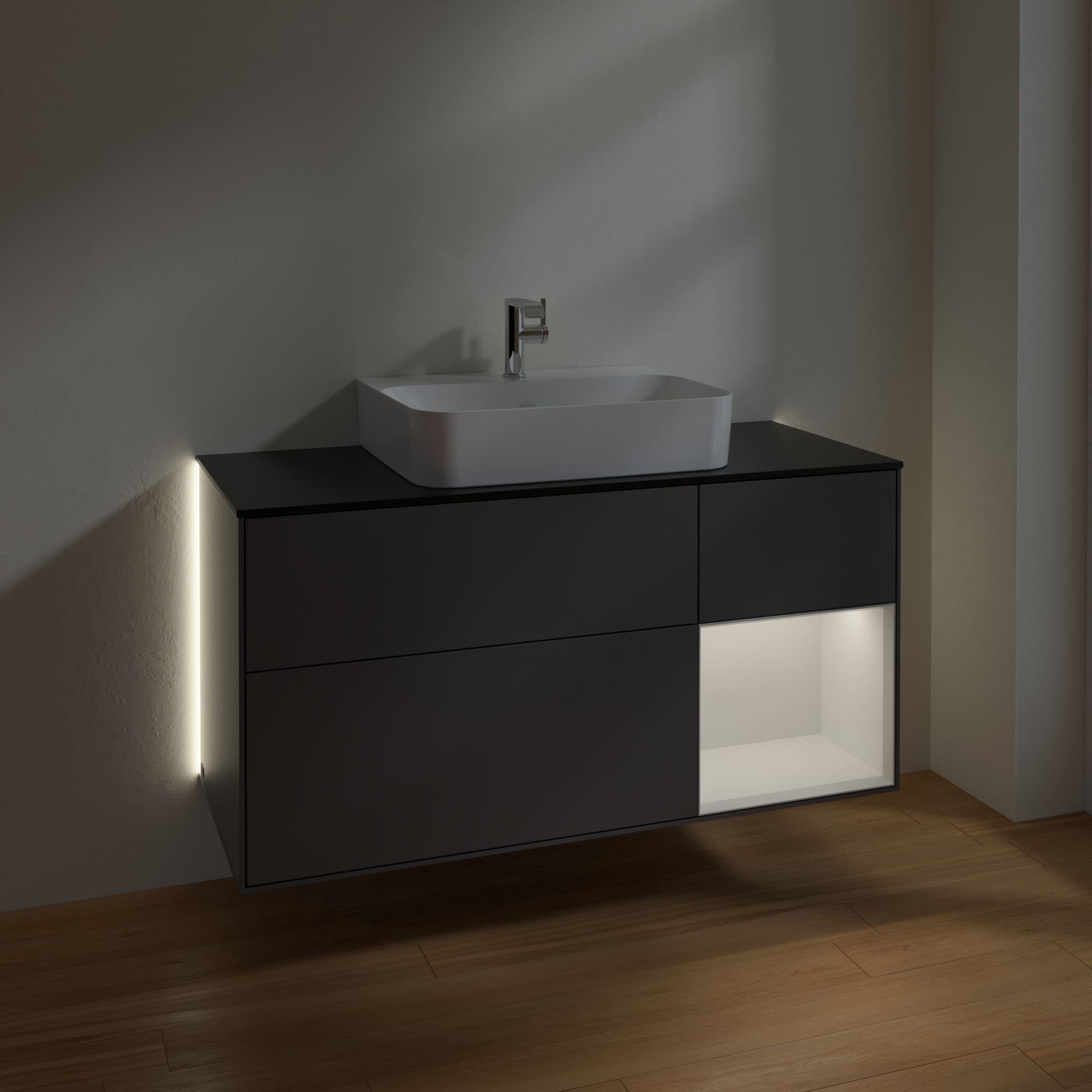 Finion Vanity unit, with lighting, 3 pull-out compartments, 1200x603x501mm, Body: Anthracite Matt Lacquer, Front: Anthracite Matt Lacquer, Shelf: Glossy White Lacquer, Cover plate: Glass Black Matt