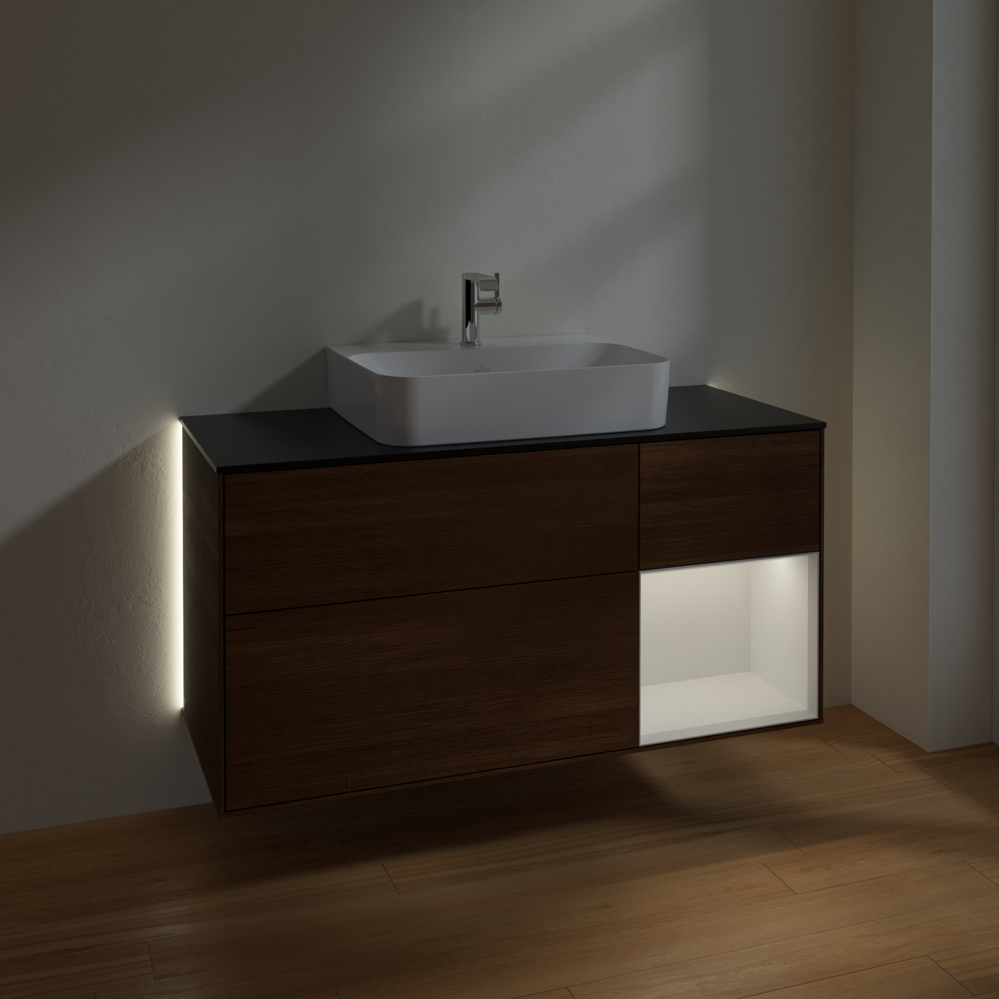 Finion Vanity unit, with lighting, 3 pull-out compartments, 1200x603x501mm, Body: Walnut Veneer, Front: Walnut Veneer, Shelf: Glossy White Lacquer, Cover plate: Glass Black Matt