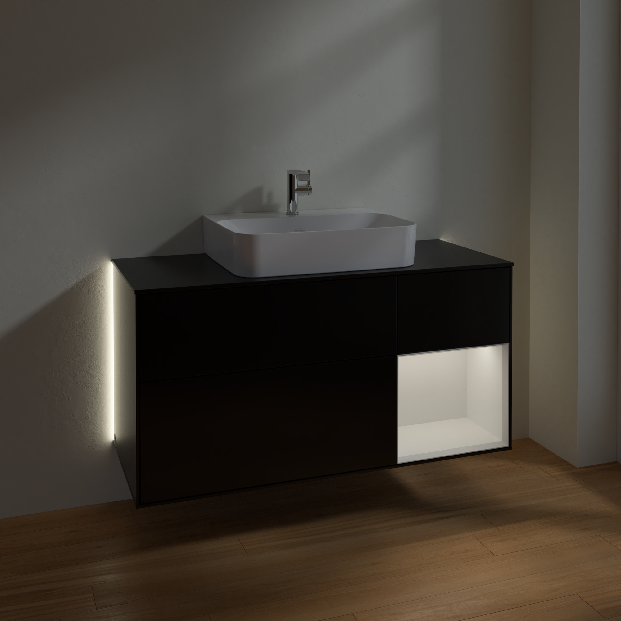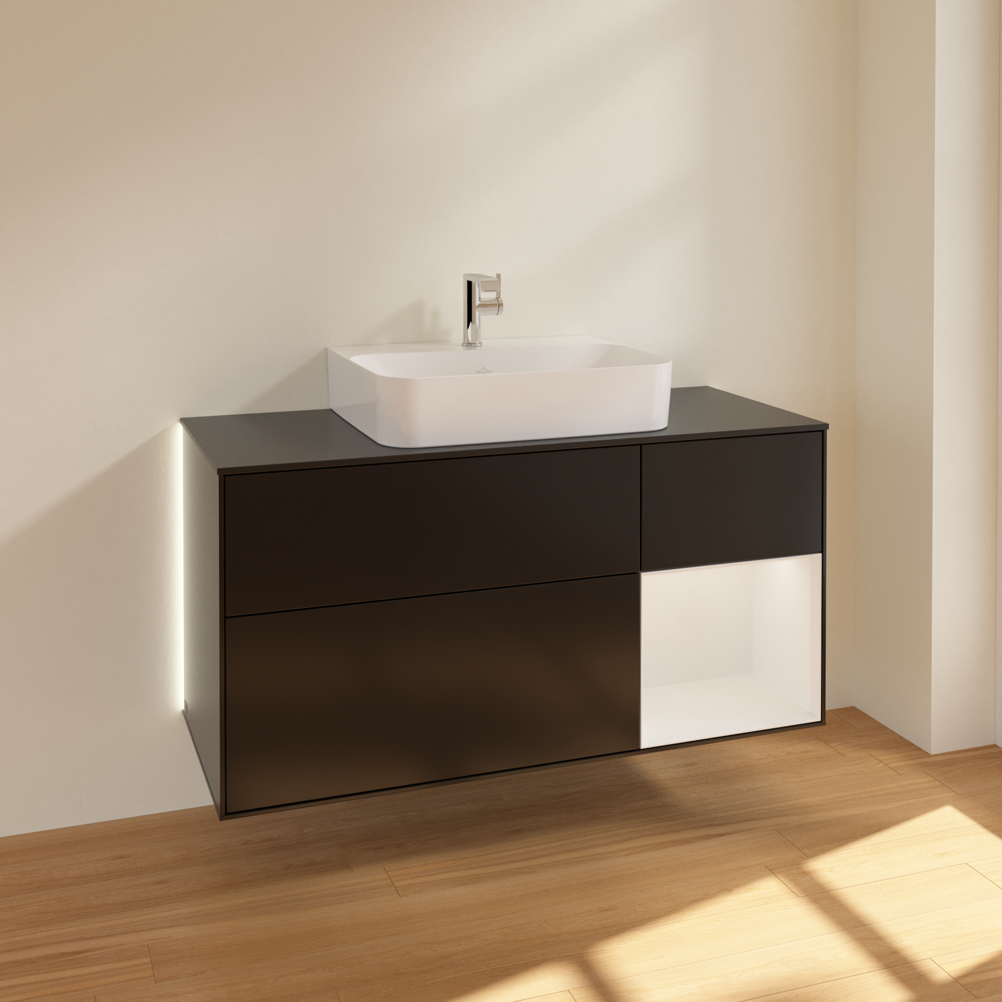 Finion Vanity unit, with lighting, 3 pull-out compartments, 1200x603x501mm, Body: Black Matt Lacquer, Front: Black Matt Lacquer, Shelf: Glossy White Lacquer, Cover plate: Glass Black Matt