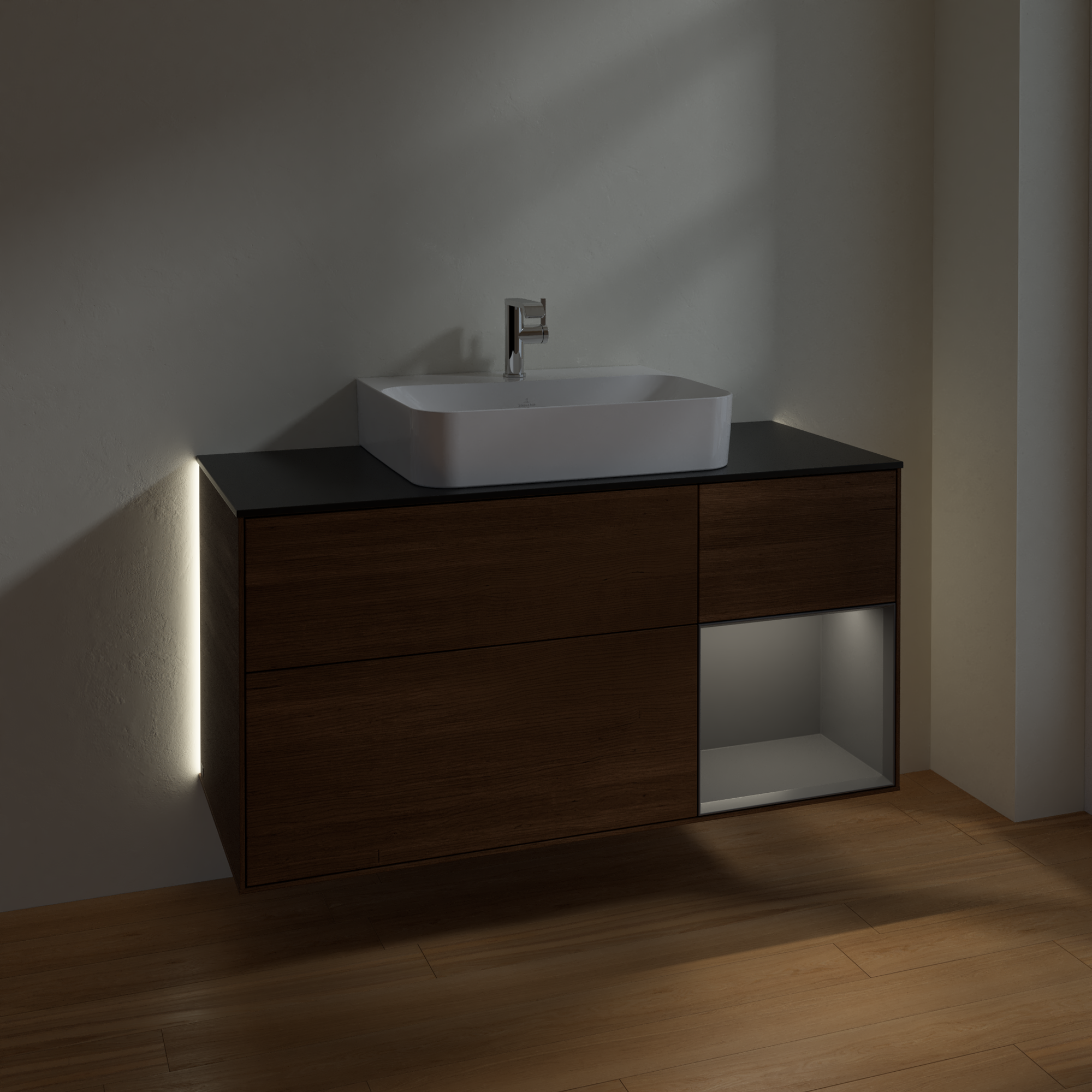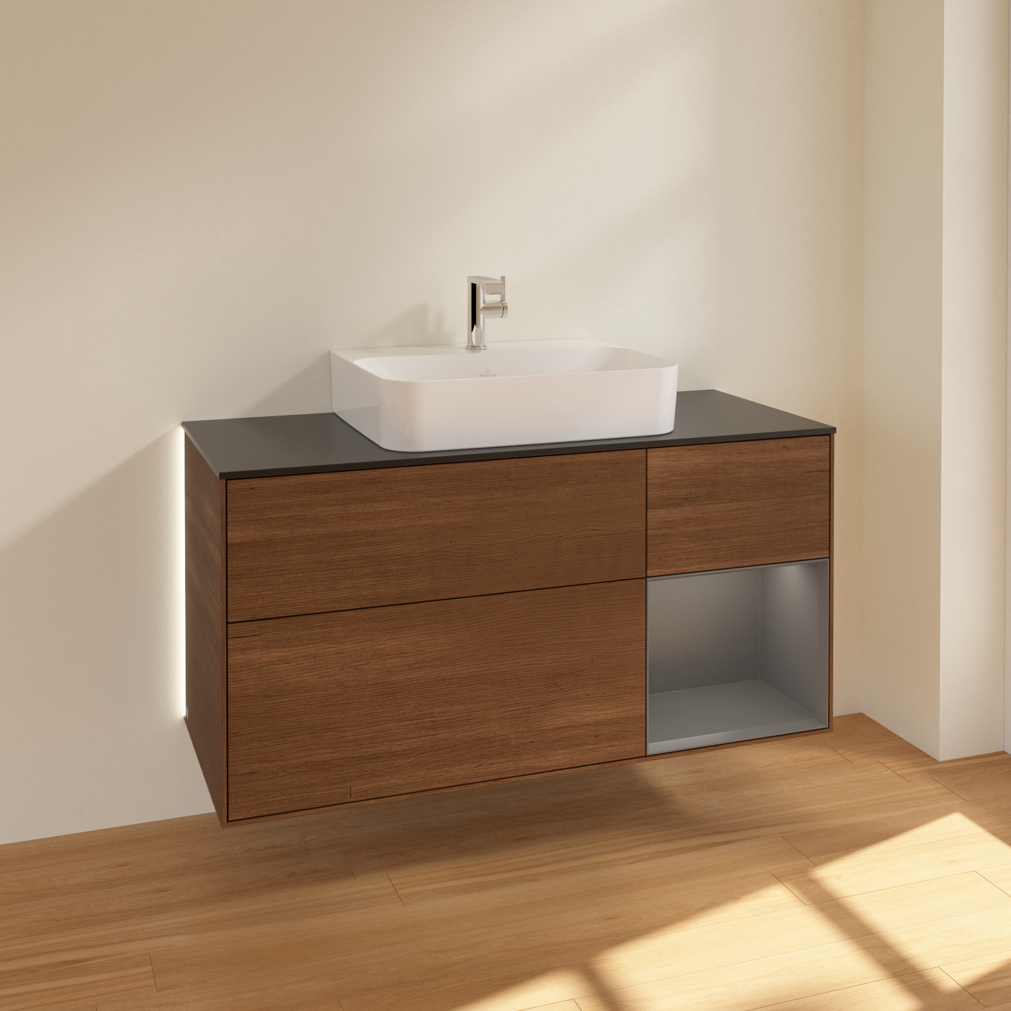 Finion Vanity unit, with lighting, 3 pull-out compartments, 1200x603x501mm, Body: Walnut Veneer, Front: Walnut Veneer, Shelf: Anthracite Matt Lacquer, Cover plate: Glass Black Matt