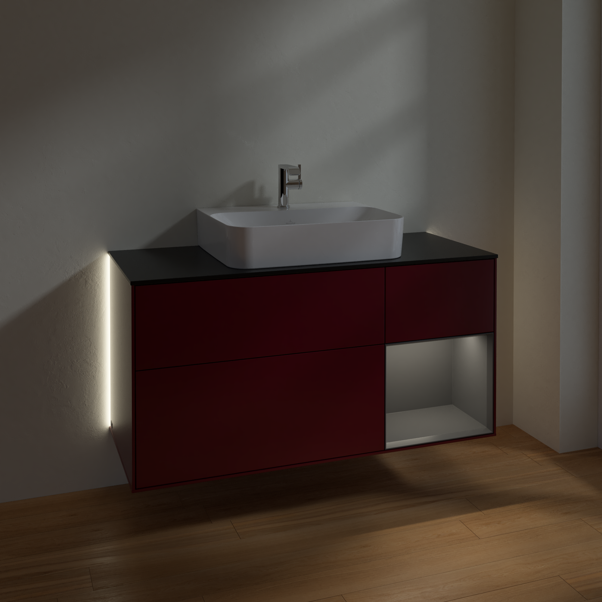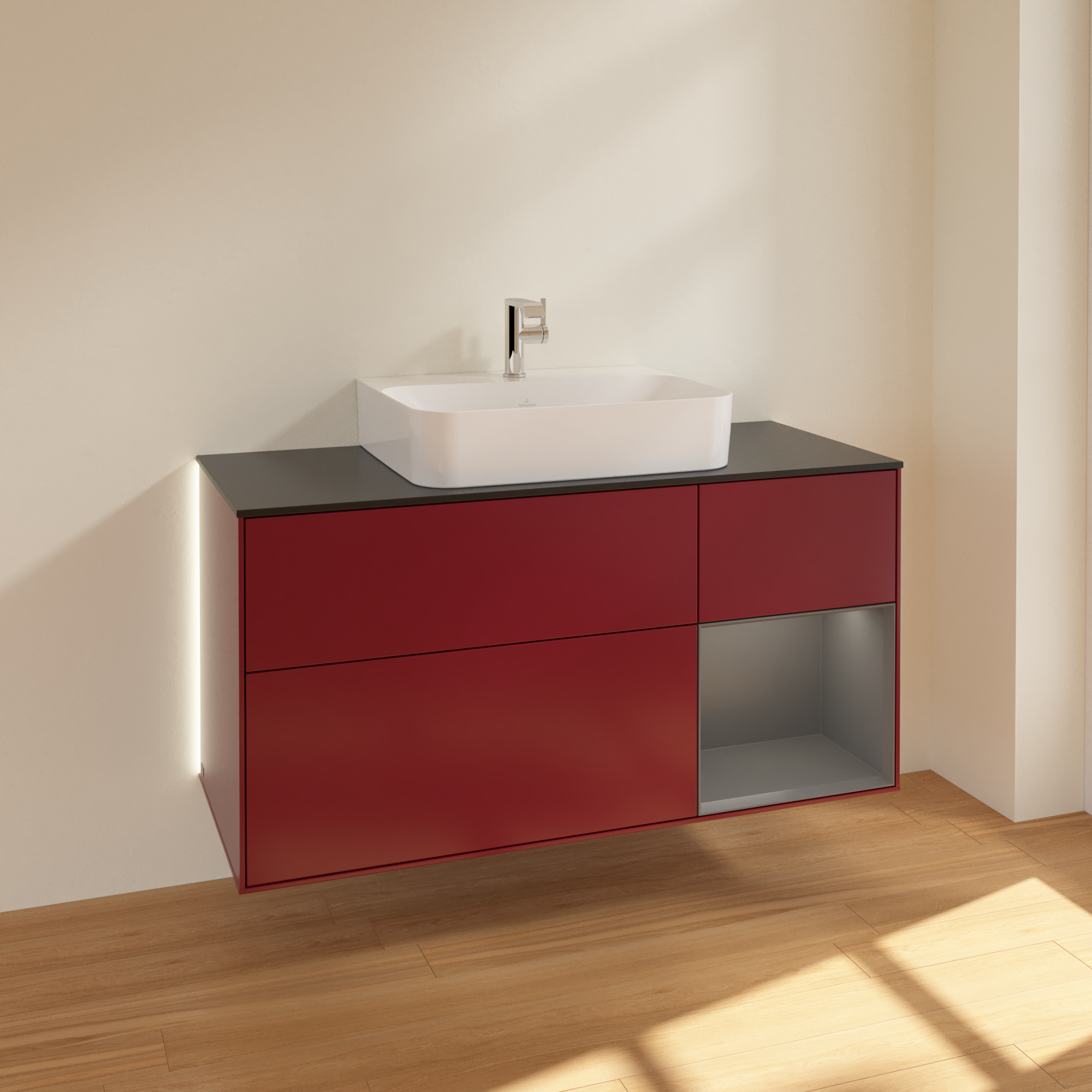 Finion Vanity unit, with lighting, 3 pull-out compartments, 1200x603x501mm, Body: Peony Matt Lacquer, Front: Peony Matt Lacquer, Shelf: Anthracite Matt Lacquer, Cover plate: Glass Black Matt