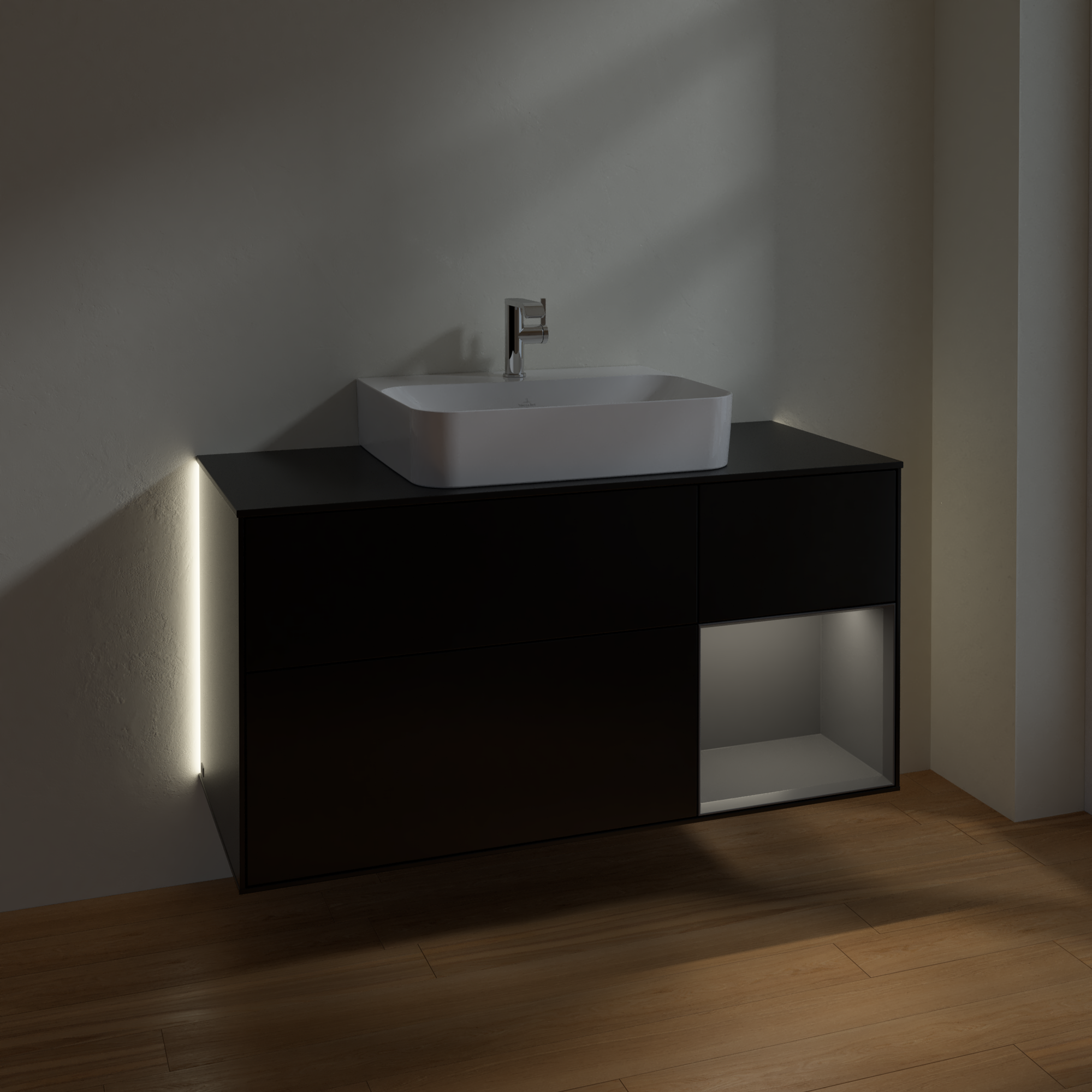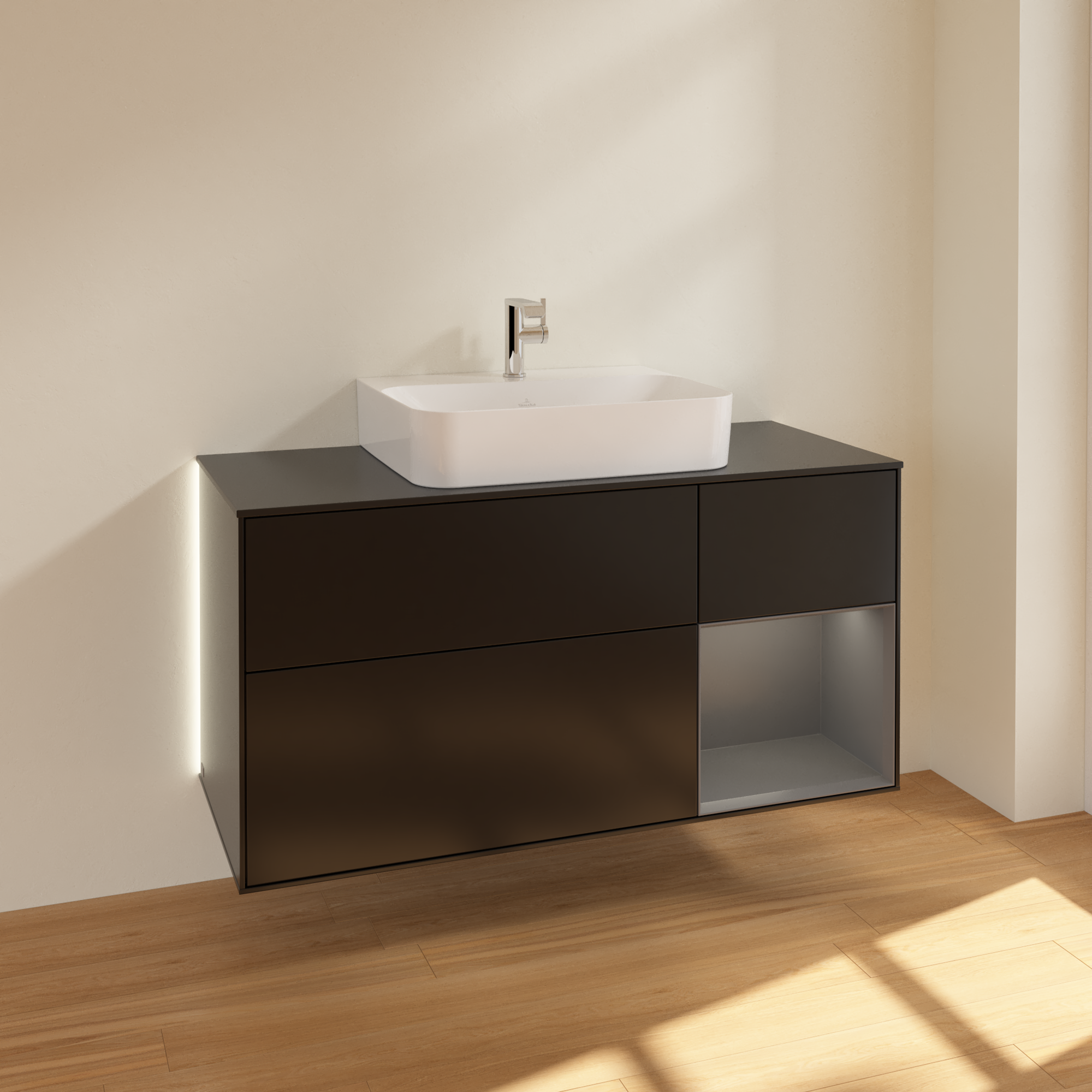 Finion Vanity unit, with lighting, 3 pull-out compartments, 1200x603x501mm, Body: Black Matt Lacquer, Front: Black Matt Lacquer, Shelf: Anthracite Matt Lacquer, Cover plate: Glass Black Matt