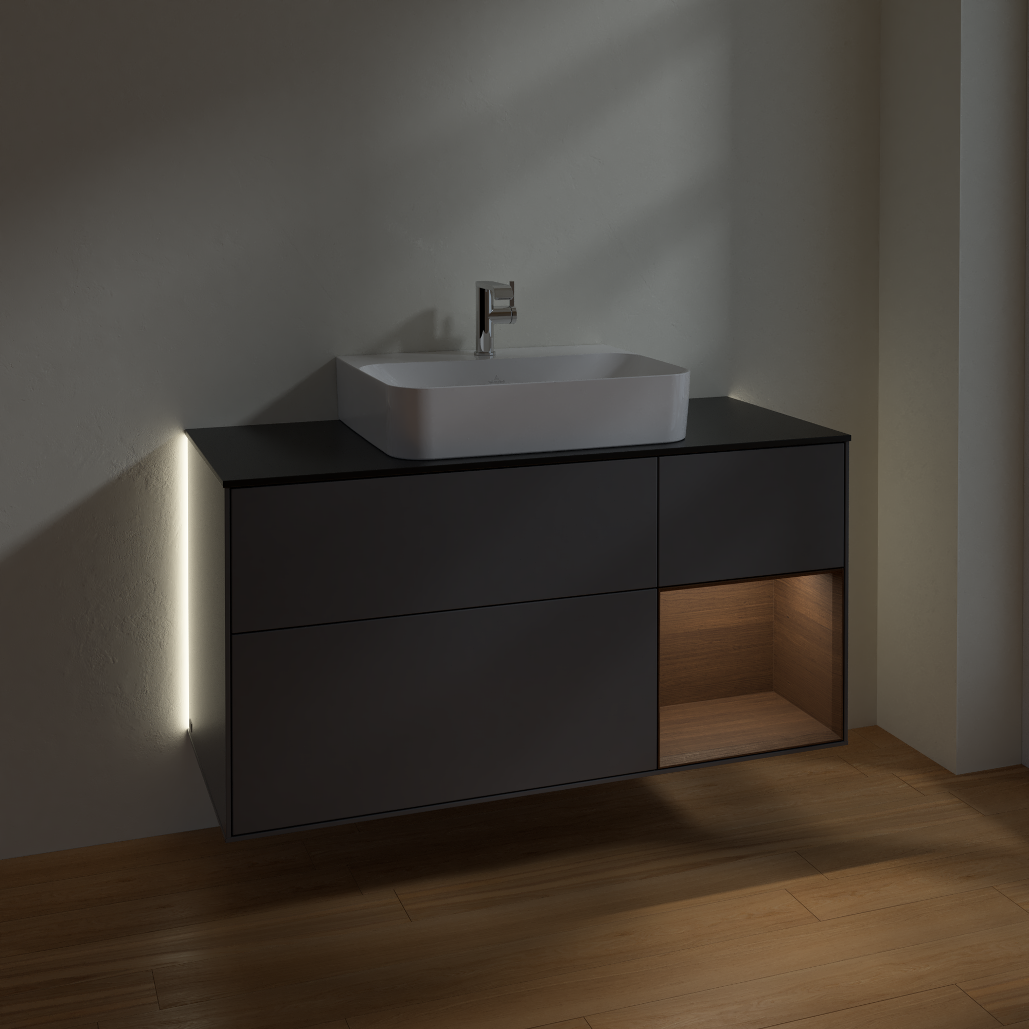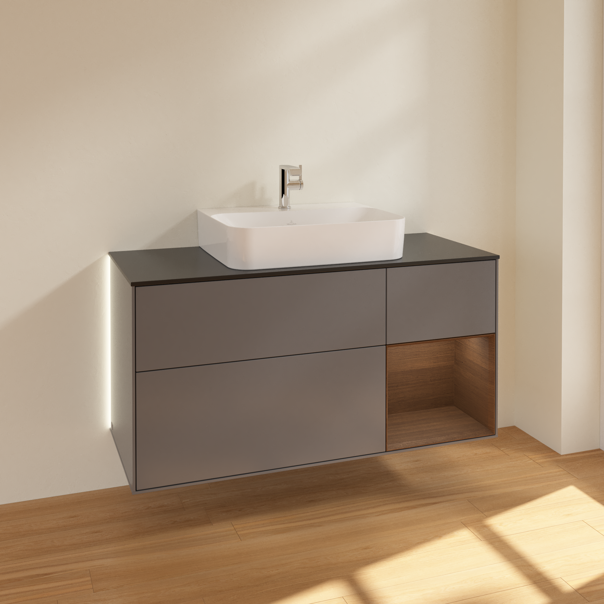 Finion Vanity unit, with lighting, 3 pull-out compartments, 1200x603x501mm, Body: Anthracite Matt Lacquer, Front: Anthracite Matt Lacquer, Shelf: Walnut Veneer, Cover plate: Glass Black Matt