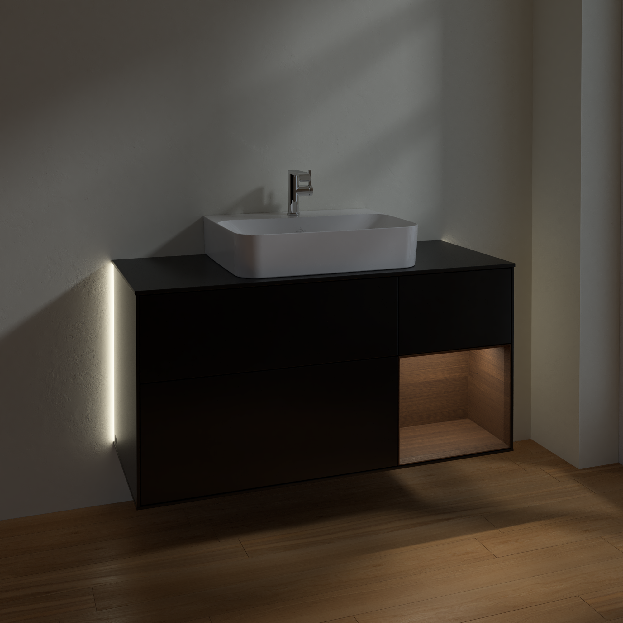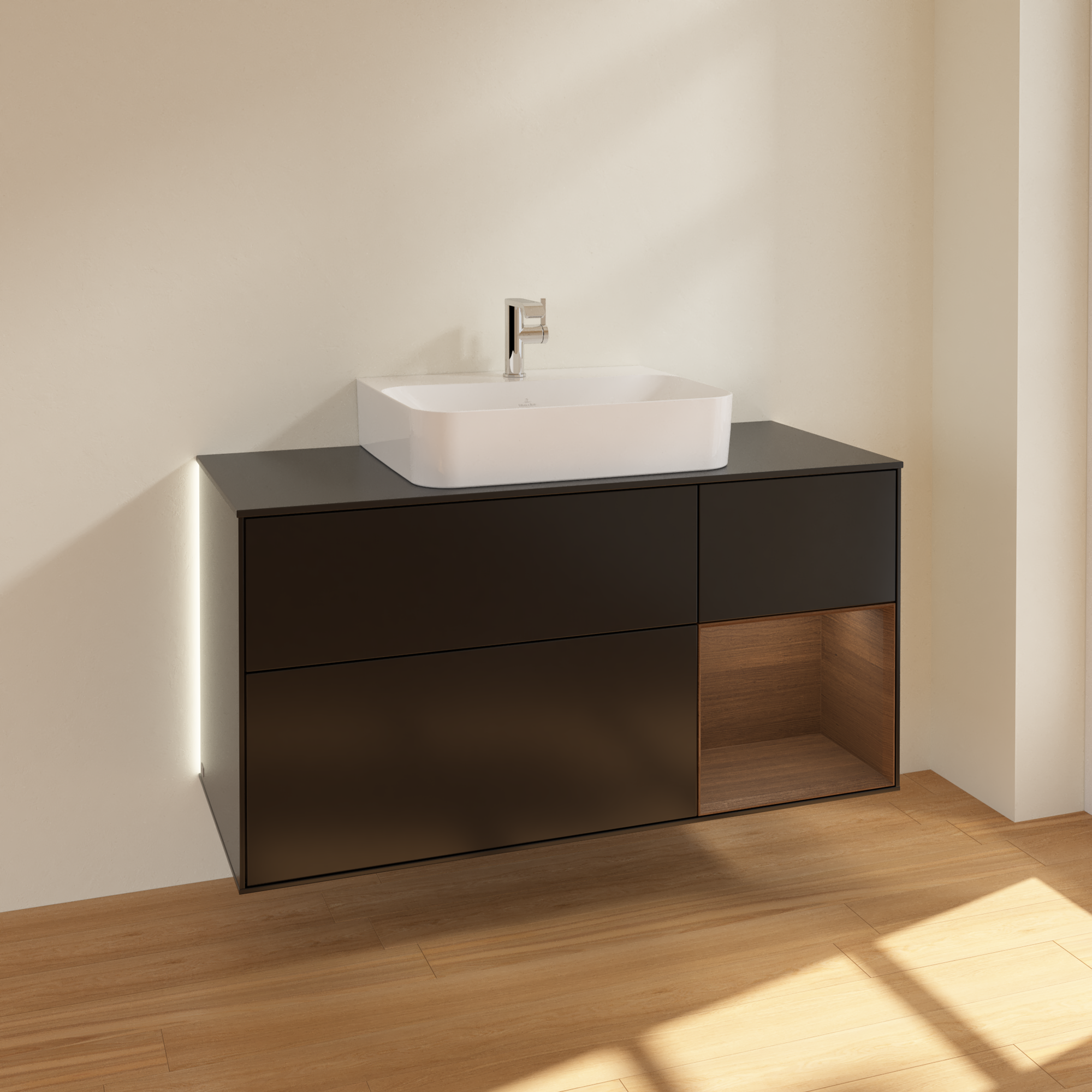 Finion Vanity unit, with lighting, 3 pull-out compartments, 1200x603x501mm, Body: Black Matt Lacquer, Front: Black Matt Lacquer, Shelf: Walnut Veneer, Cover plate: Glass Black Matt