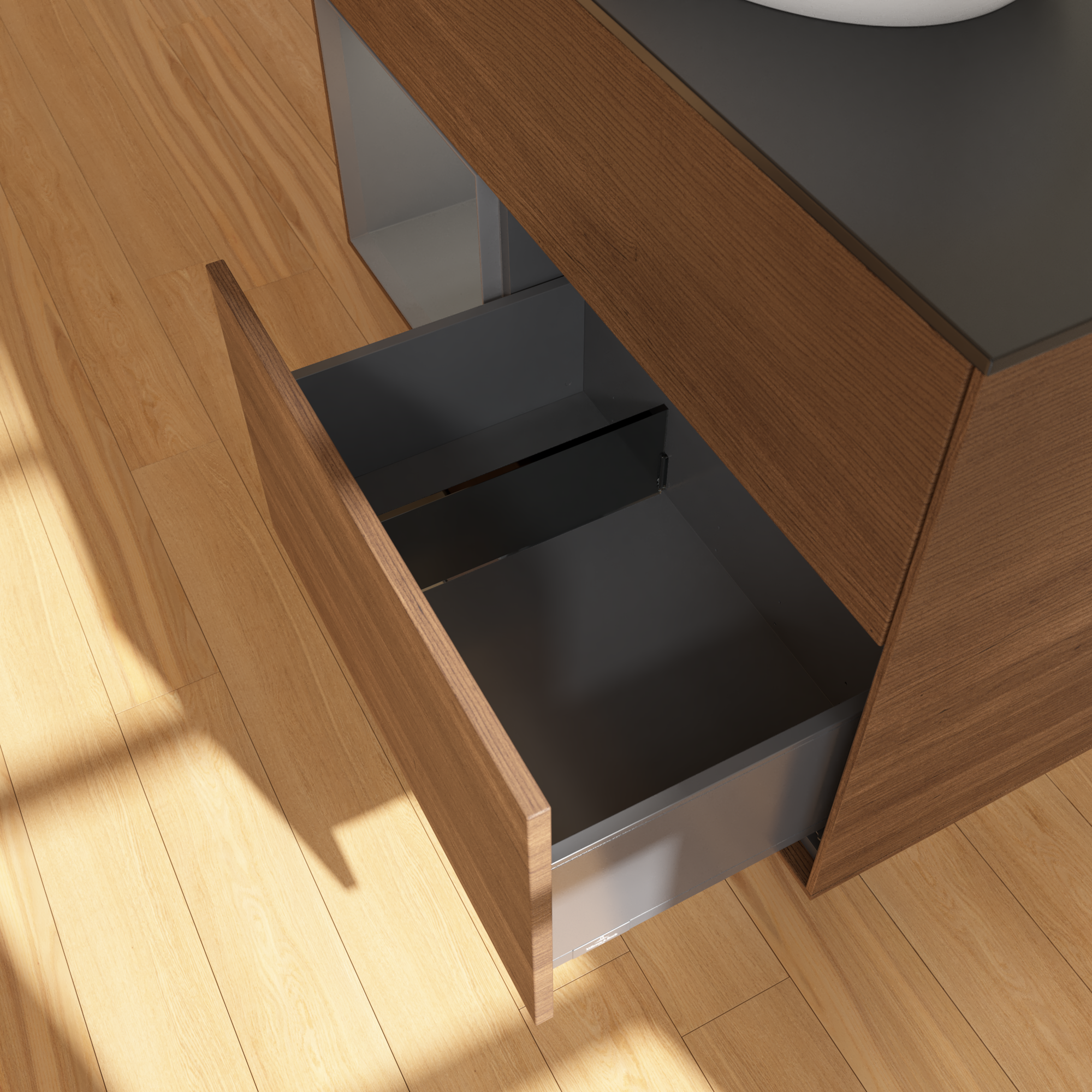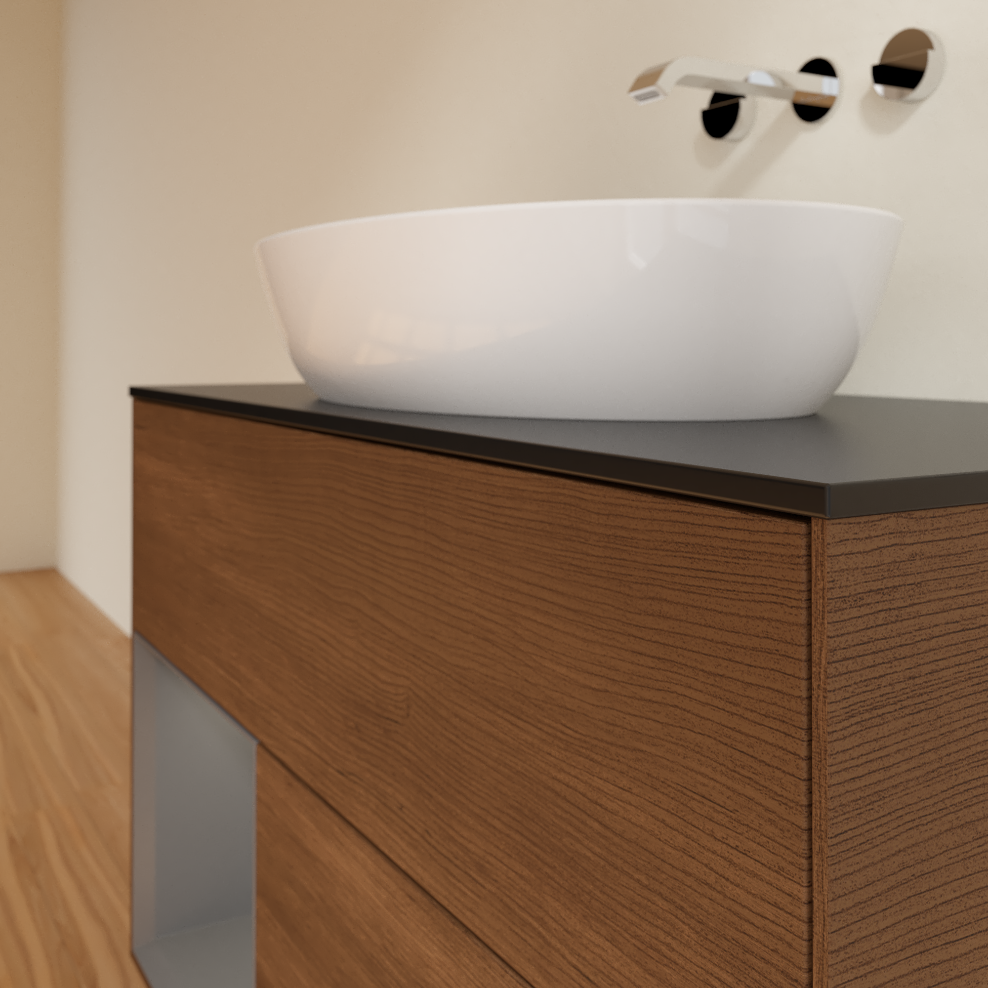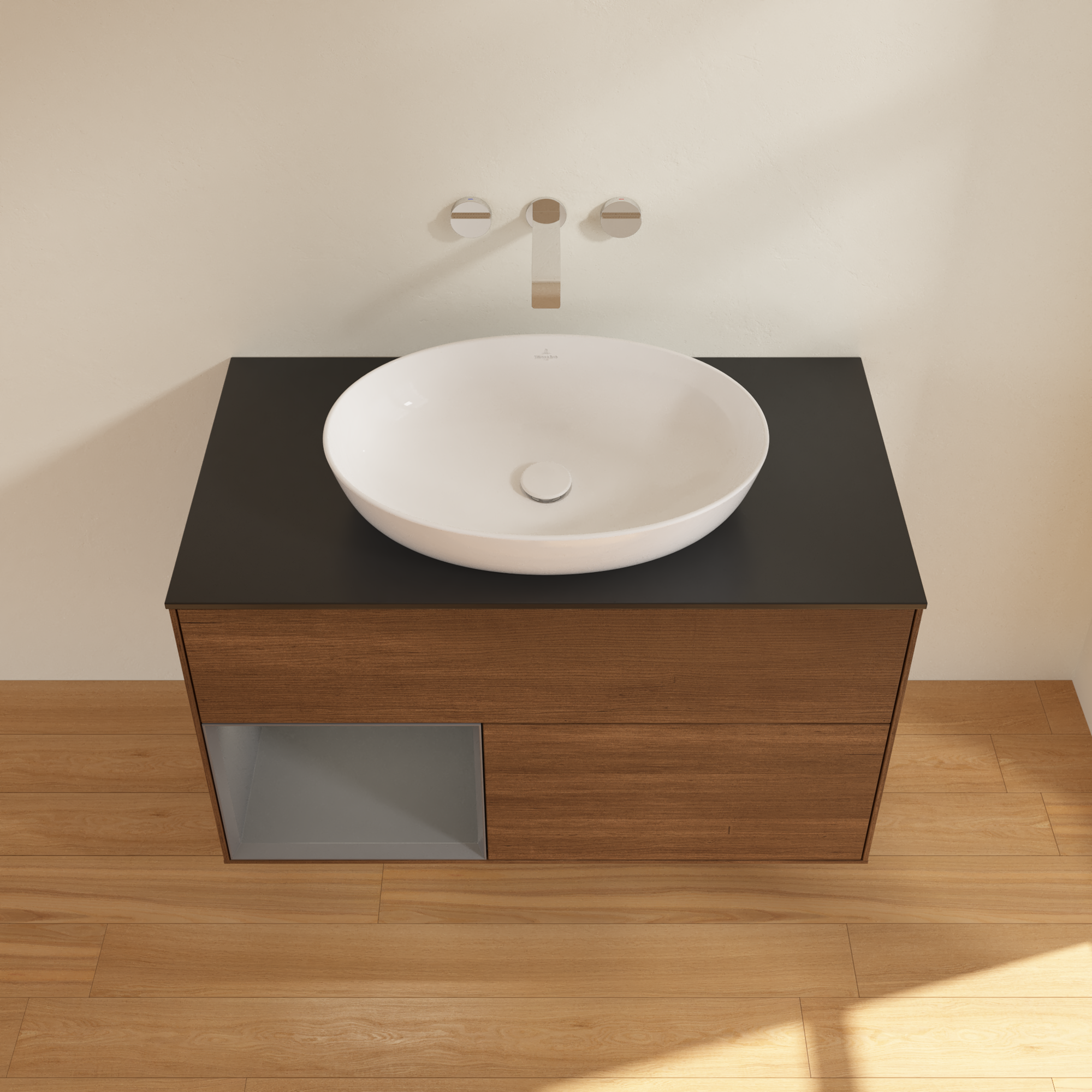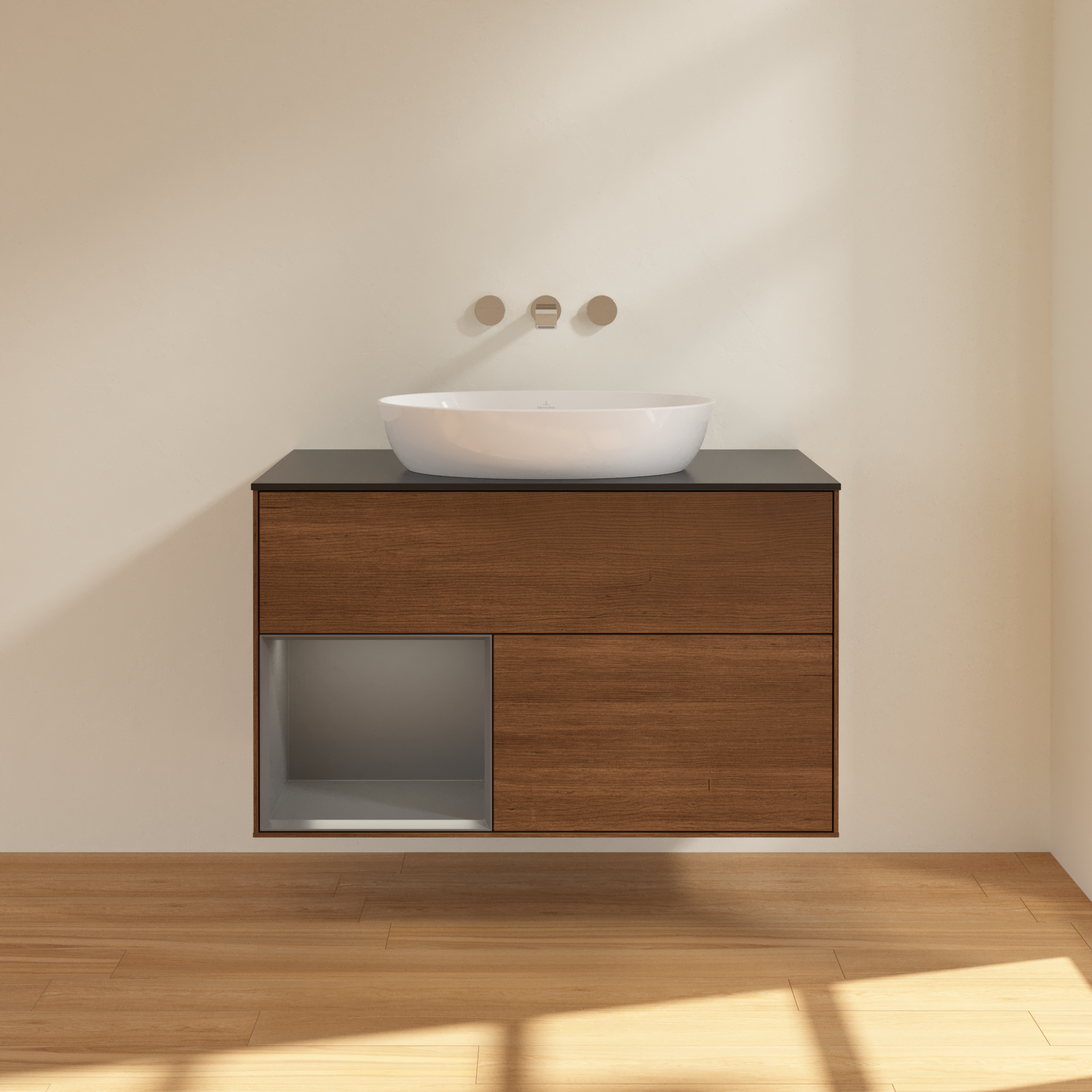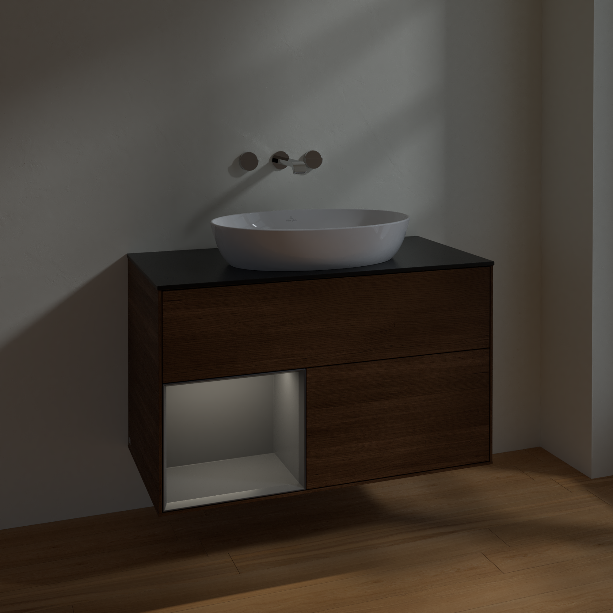 Finion Vanity unit, with lighting, 2 pull-out compartments, 1000x603x501mm, Body: Walnut Veneer, Front: Walnut Veneer, Shelf: Anthracite Matt Lacquer, Cover plate: Glass Black Matt