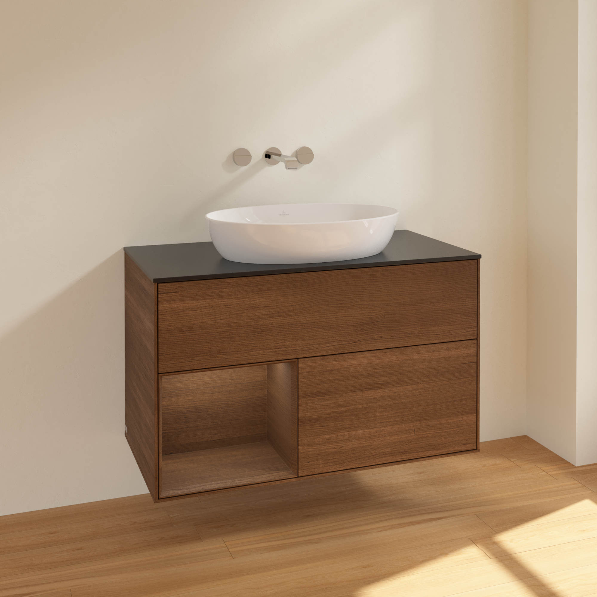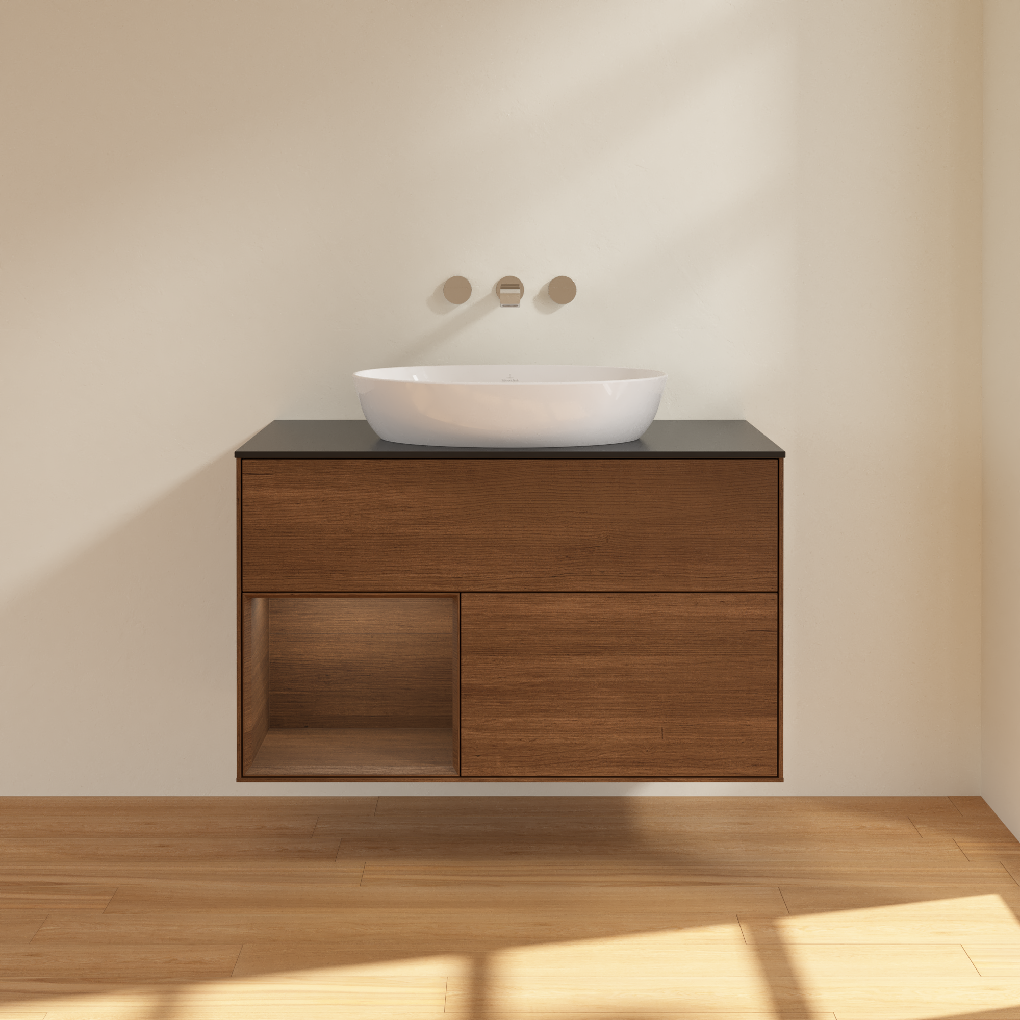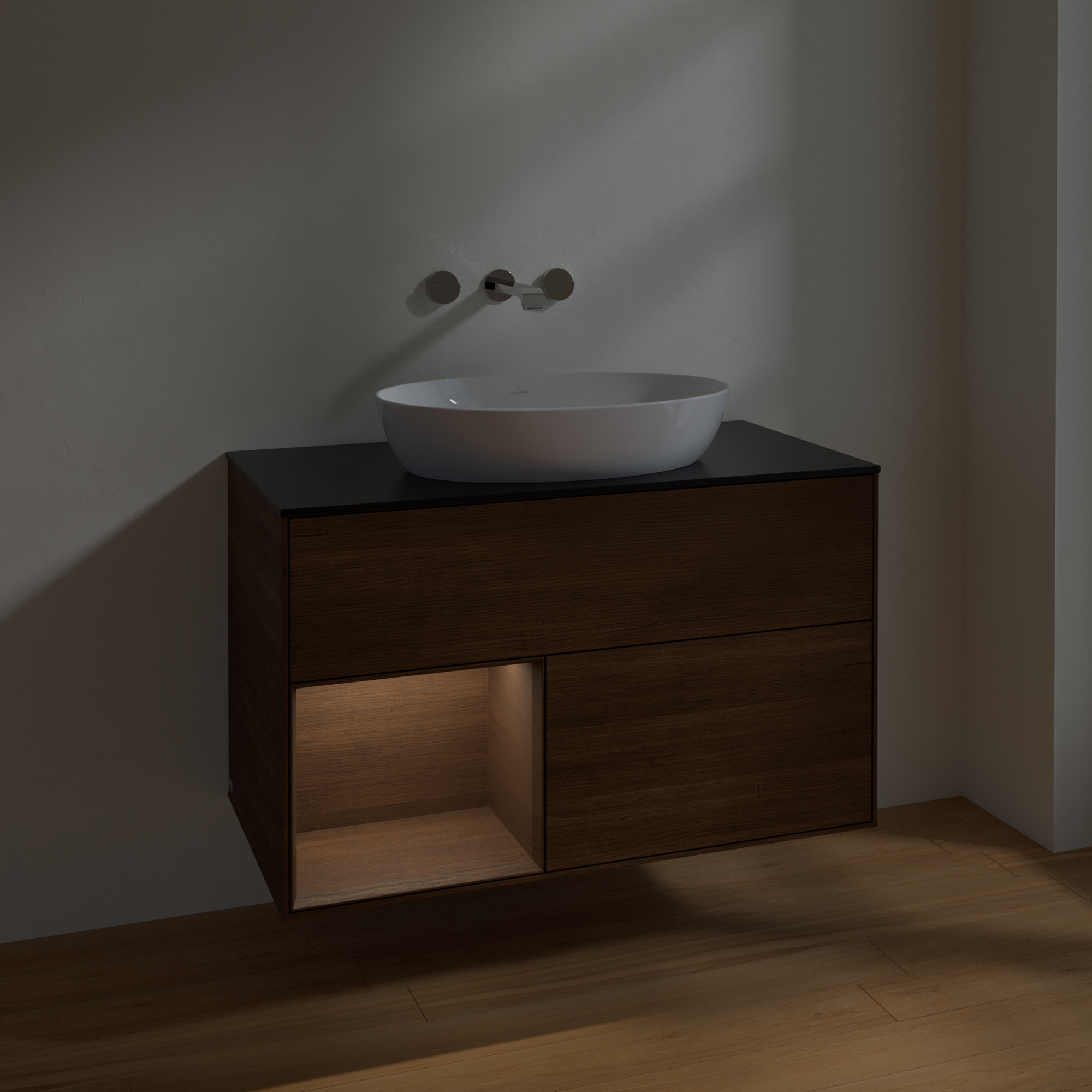 Finion Vanity unit, with lighting, 2 pull-out compartments, 1000x603x501mm, Body: Walnut Veneer, Front: Walnut Veneer, Shelf: Walnut Veneer, Cover plate: Glass Black Matt