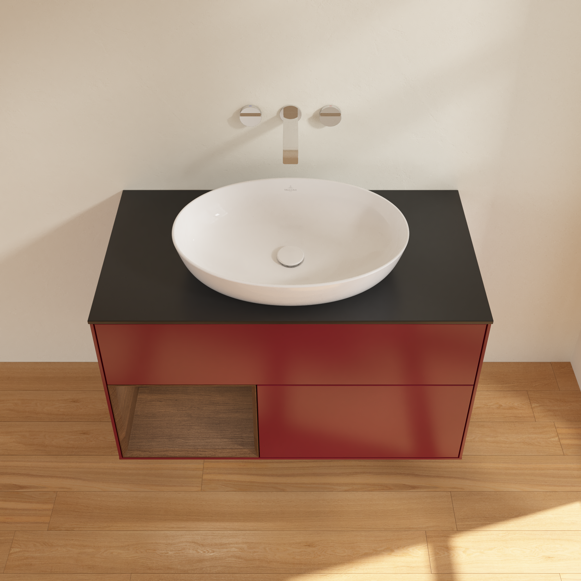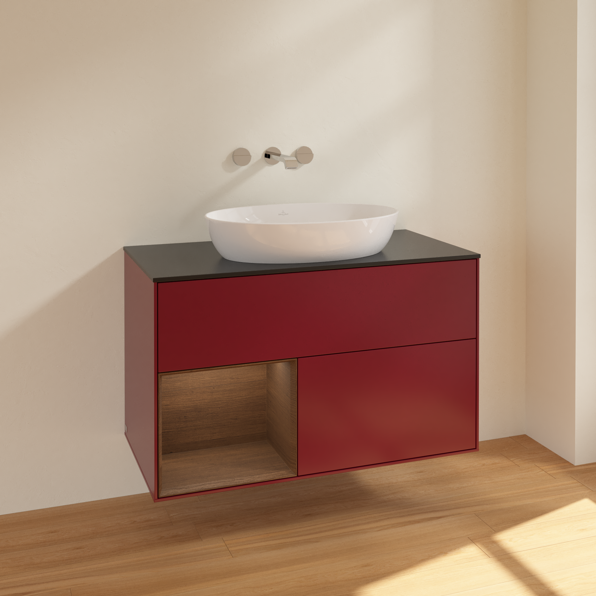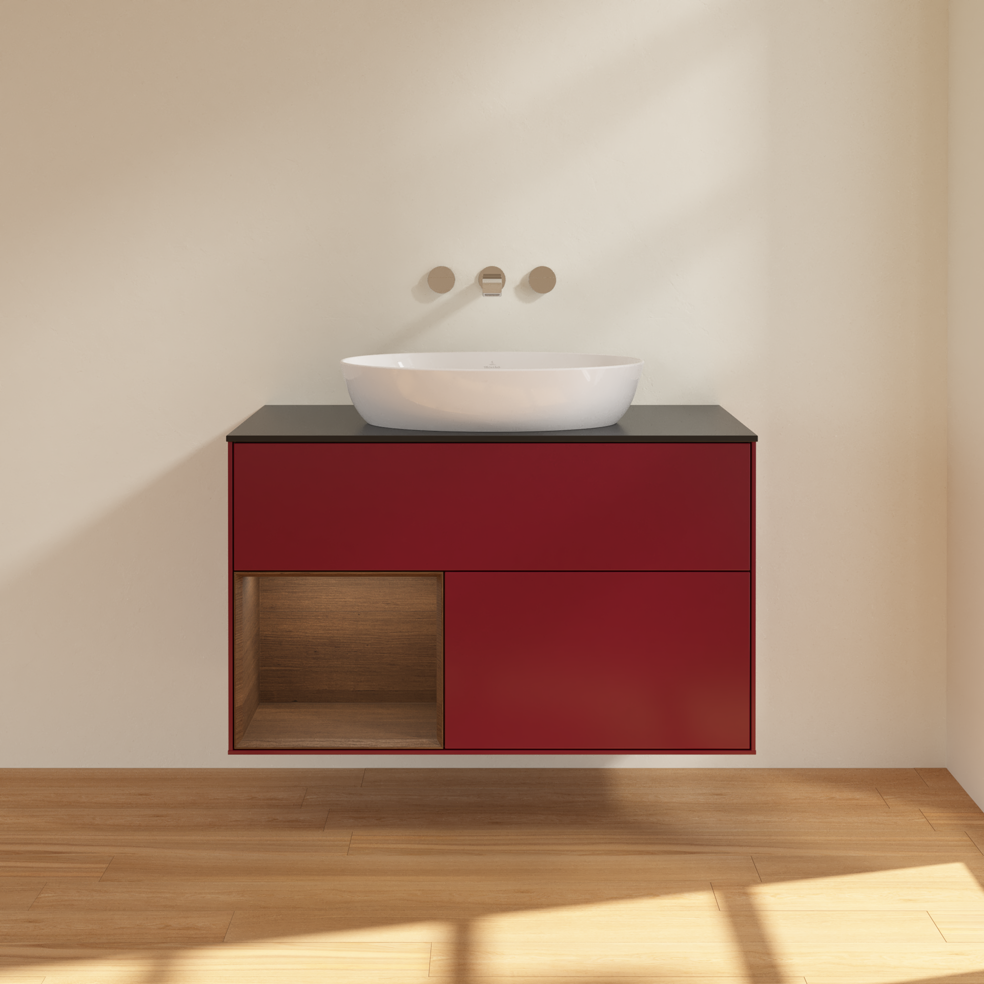 Finion Vanity unit, with lighting, 2 pull-out compartments, 1000x603x501mm, Body: Peony Matt Lacquer, Front: Peony Matt Lacquer, Shelf: Walnut Veneer, Cover plate: Glass Black Matt