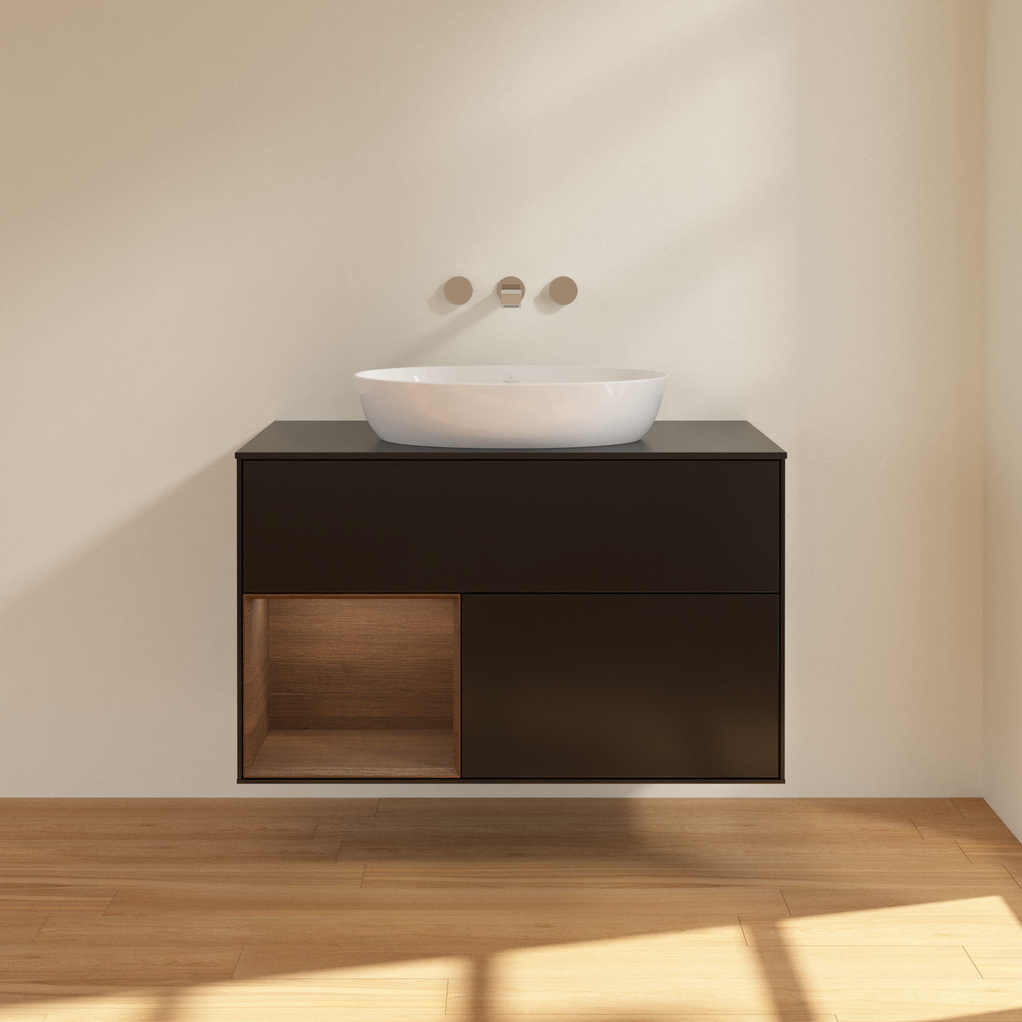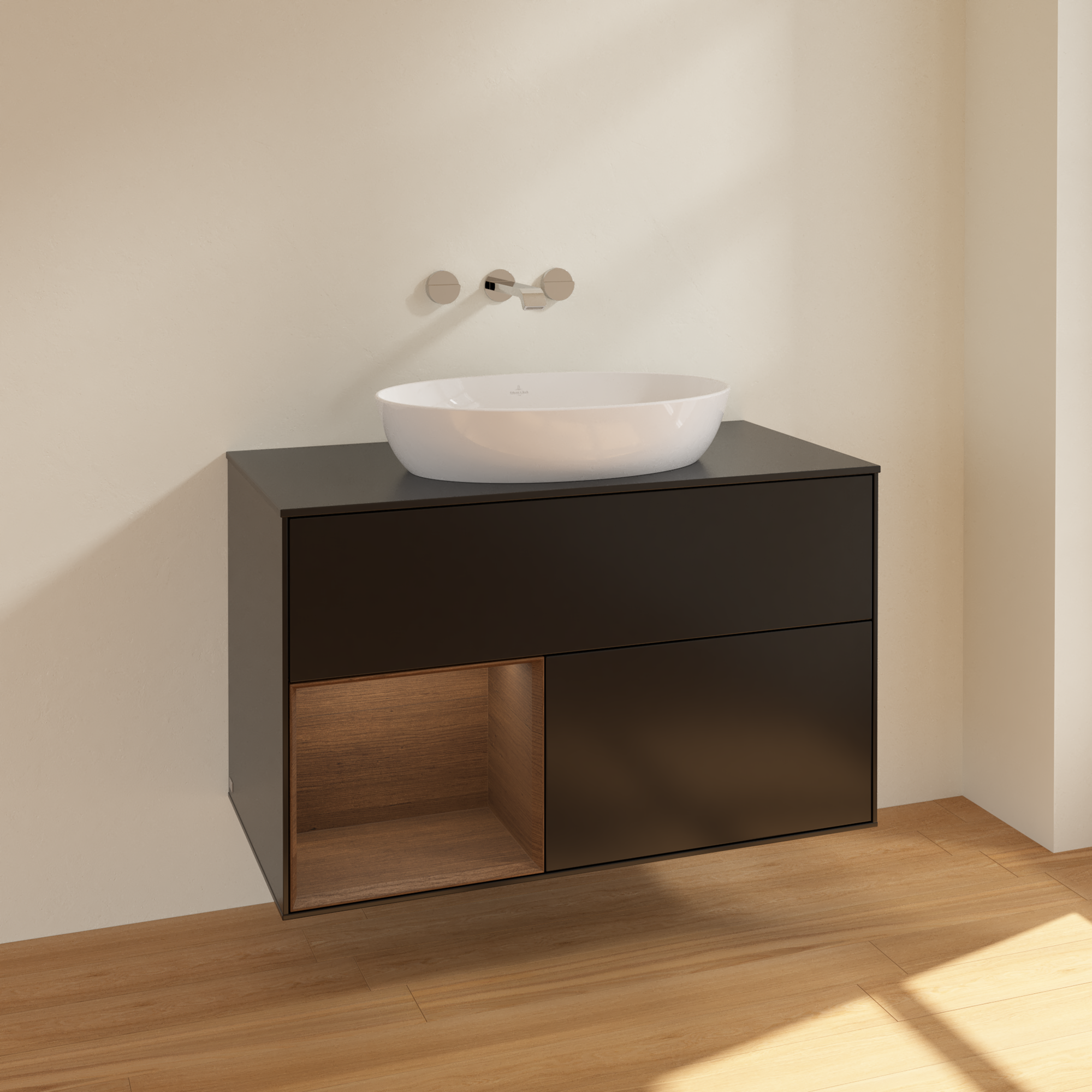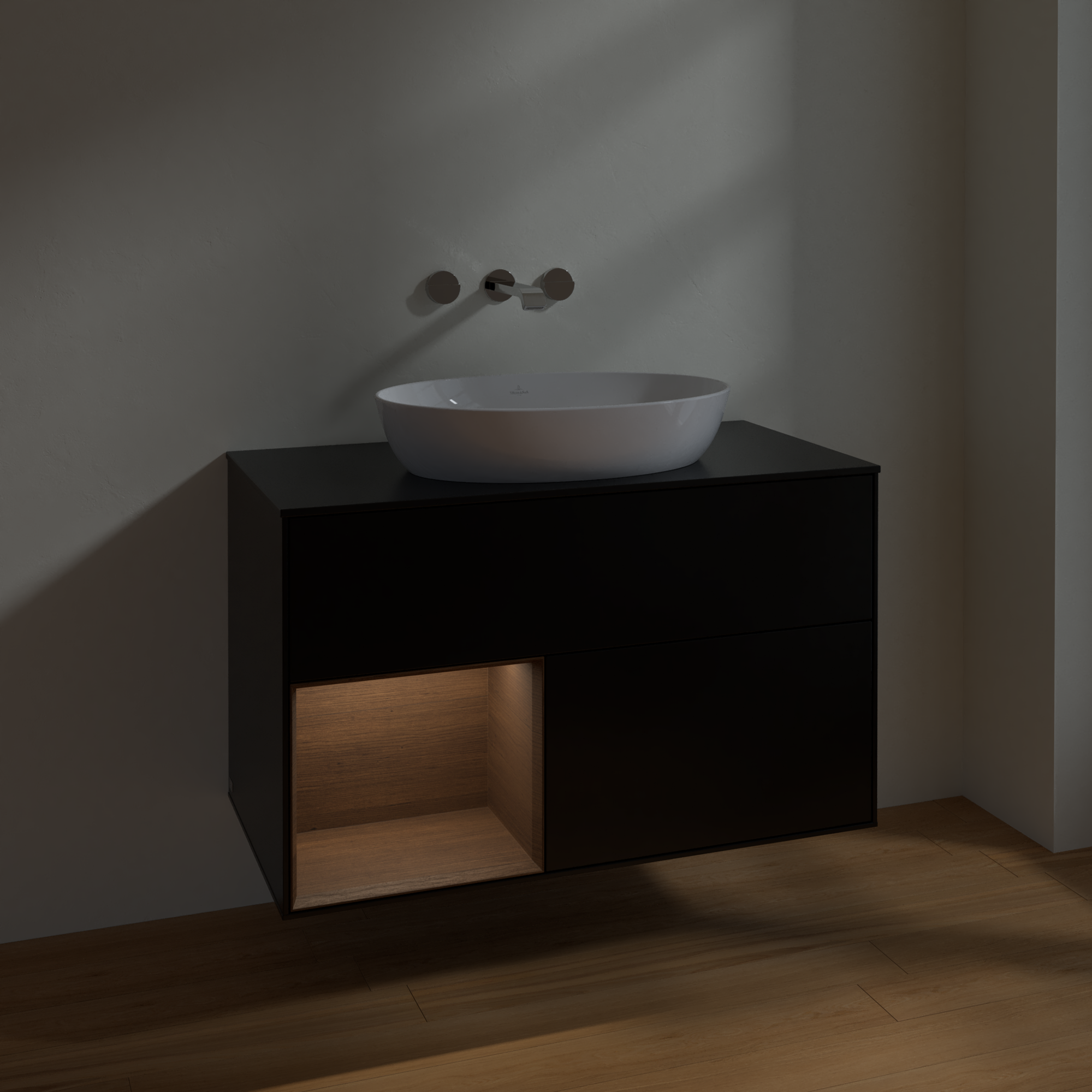 Finion Vanity unit, with lighting, 2 pull-out compartments, 1000x603x501mm, Body: Black Matt Lacquer, Front: Black Matt Lacquer, Shelf: Walnut Veneer, Cover plate: Glass Black Matt