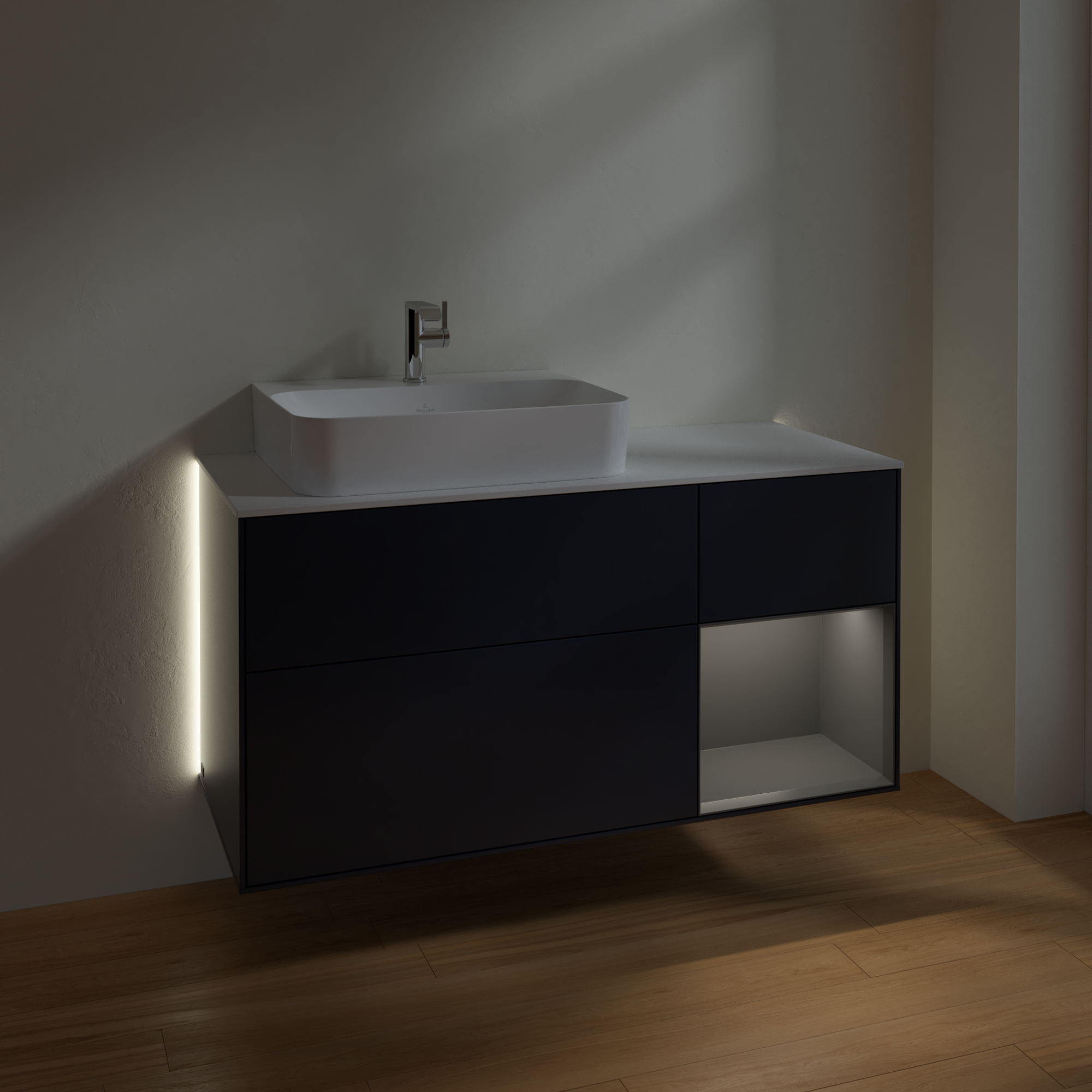 Finion Vanity unit, with lighting, 3 pull-out compartments, 1200x603x501mm, Body: Midnight Blue Matt Lacquer, Front: Midnight Blue Matt Lacquer, Shelf: Anthracite Matt Lacquer, Cover plate: Glass White Matt