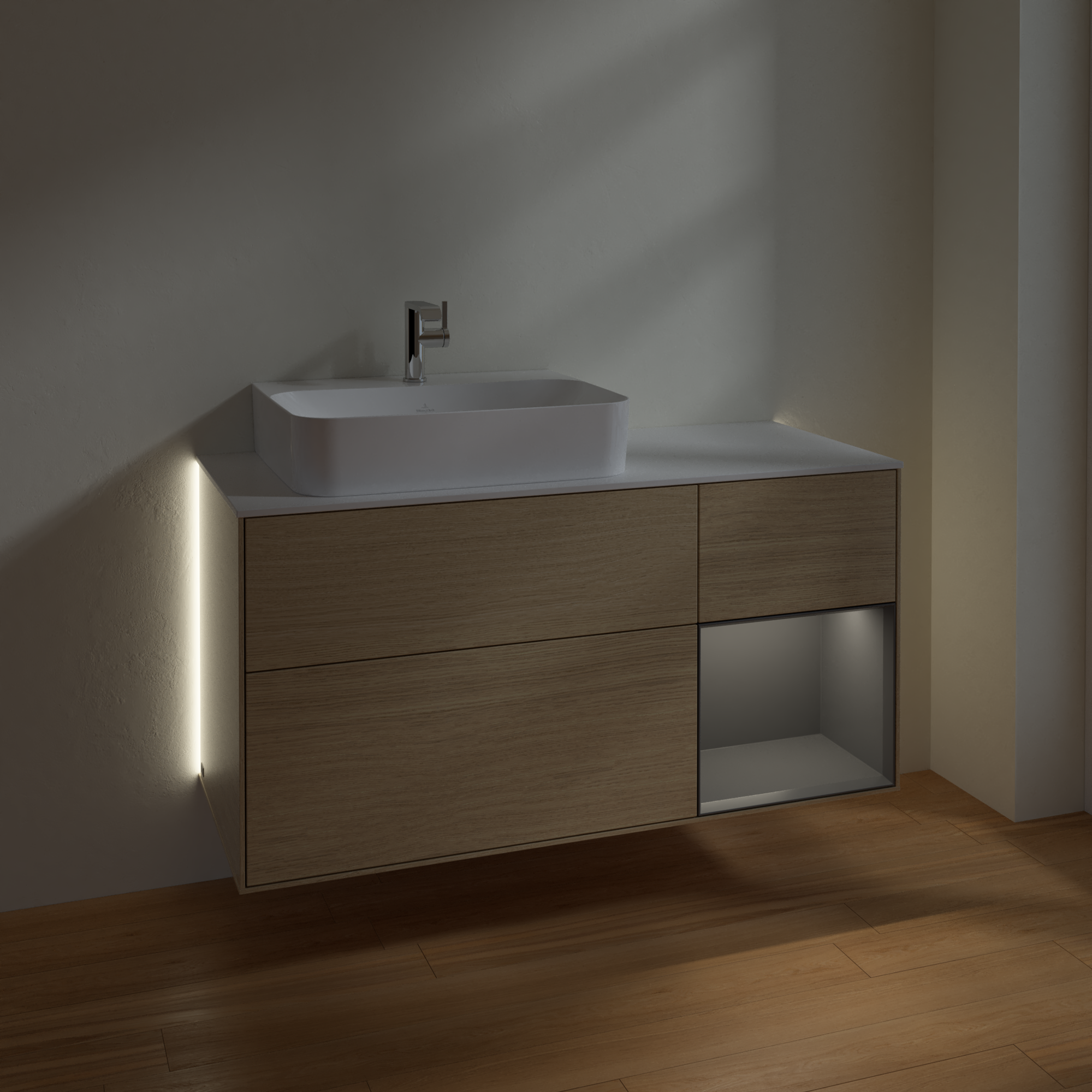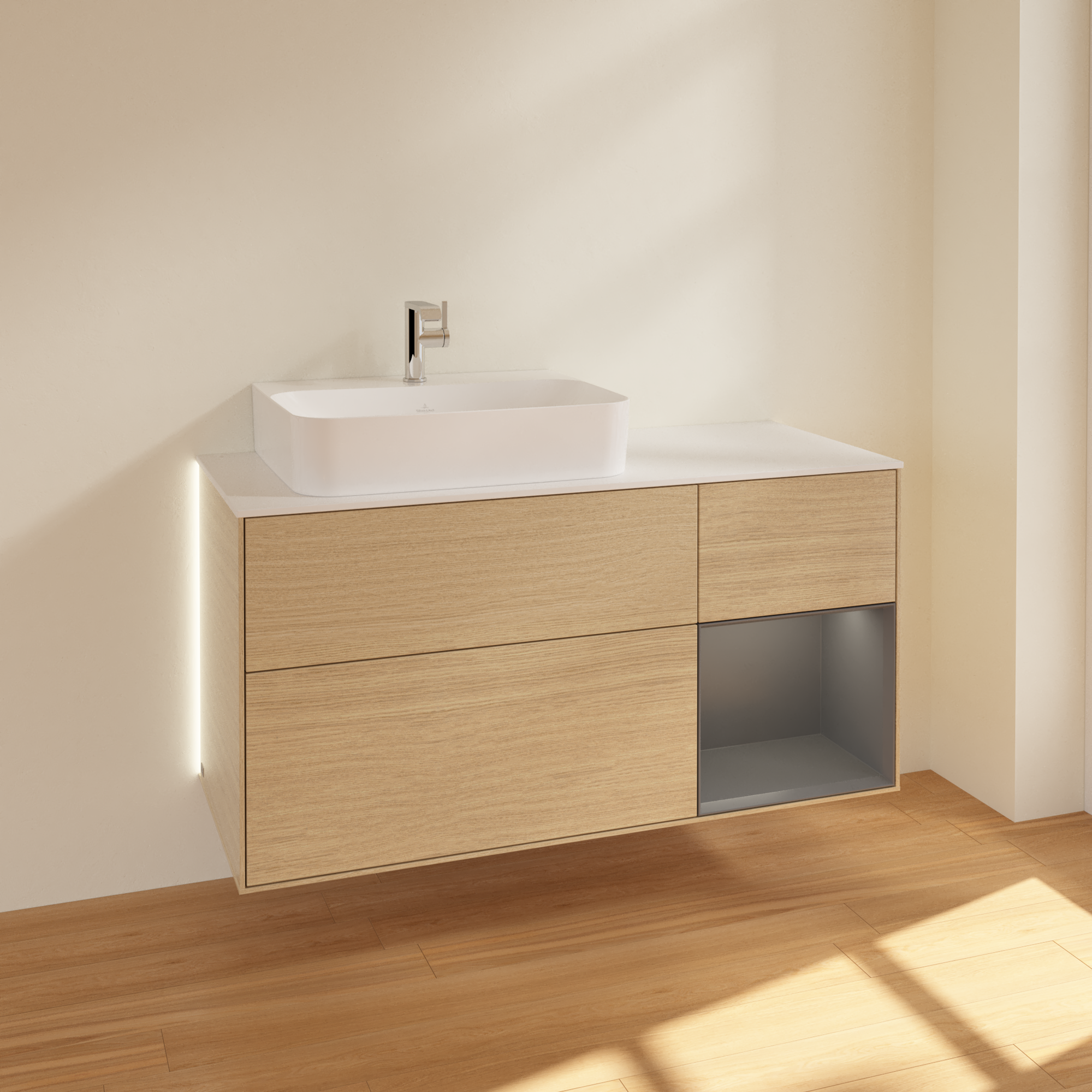 Finion Vanity unit, with lighting, 3 pull-out compartments, 1200x603x501mm, Body: Oak Veneer, Front: Oak Veneer, Shelf: Anthracite Matt Lacquer, Cover plate: Glass White Matt