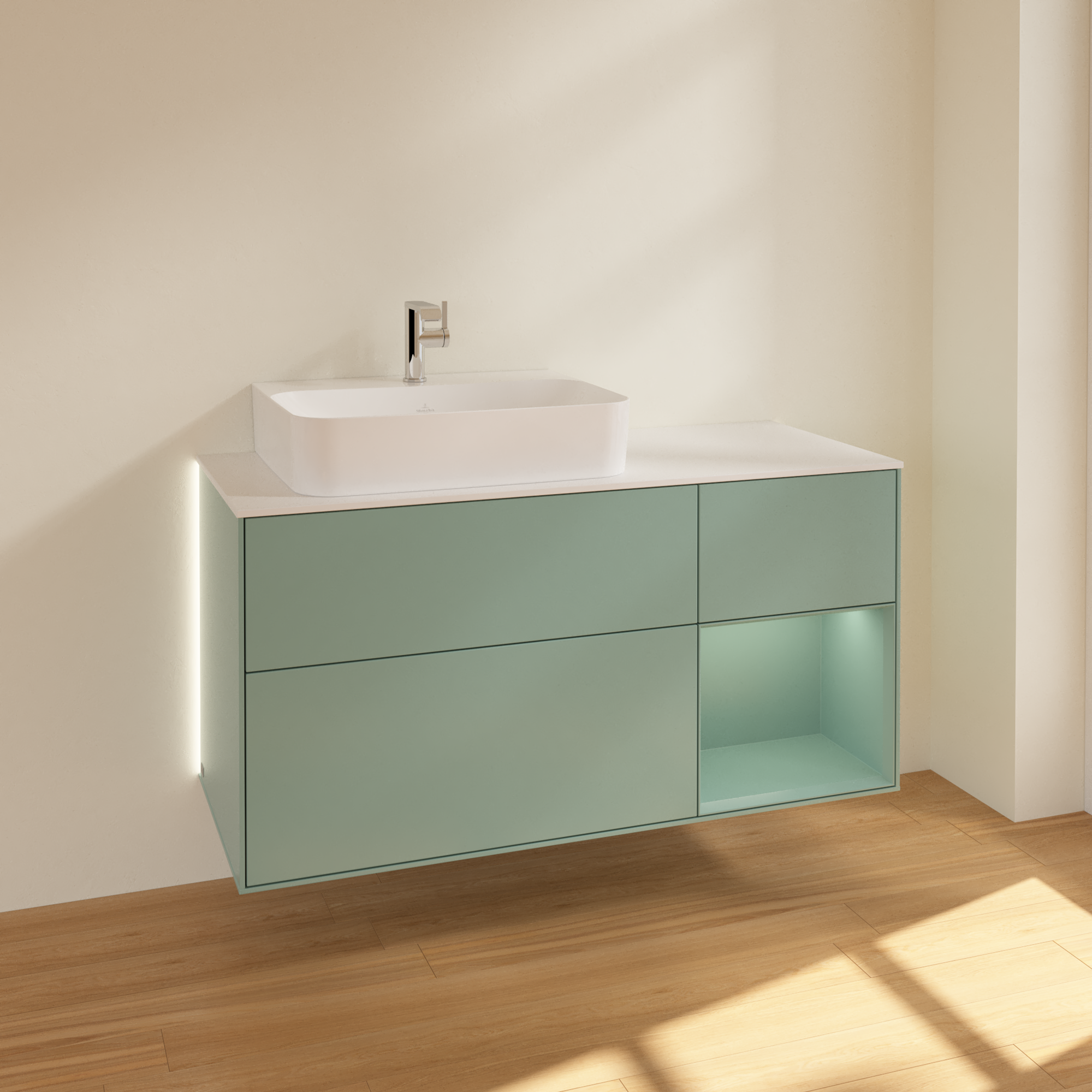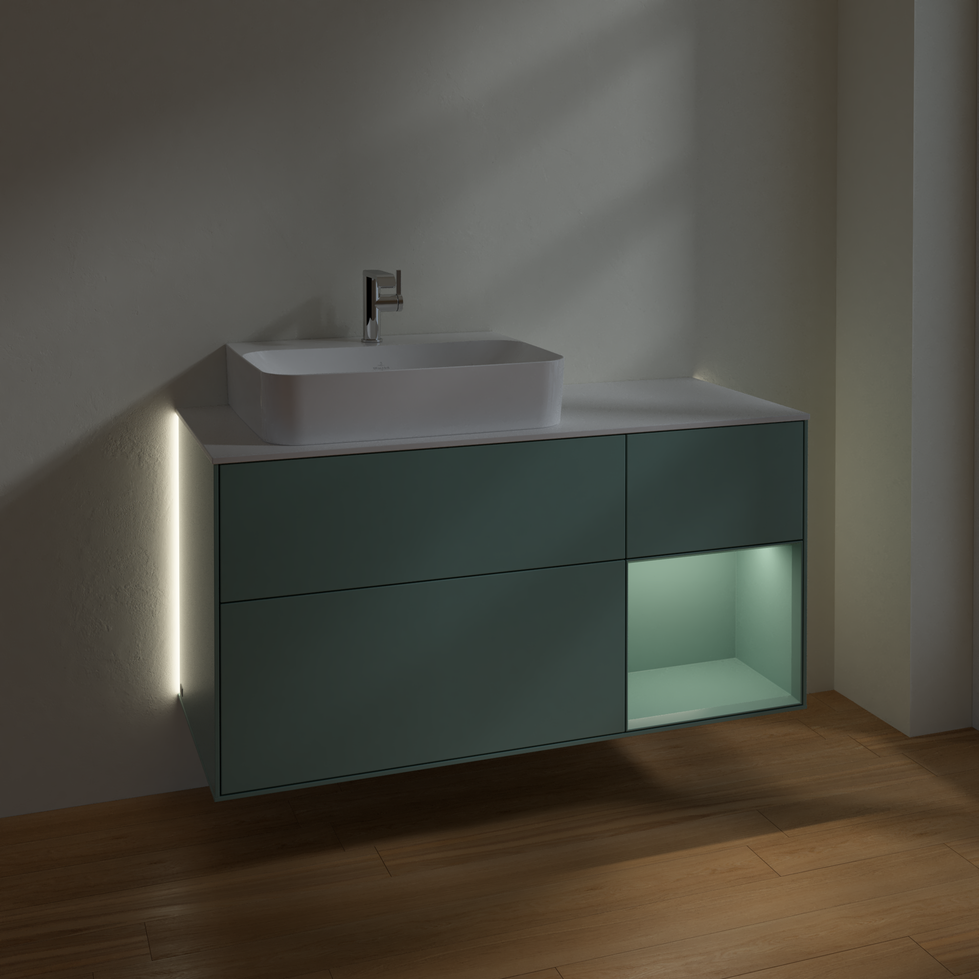Finion Vanity unit, with lighting, 3 pull-out compartments, 1200x603x501mm, Body: Olive Matt Lacquer, Front: Olive Matt Lacquer, Shelf: Olive Matt Lacquer, Cover plate: Glass White Matt