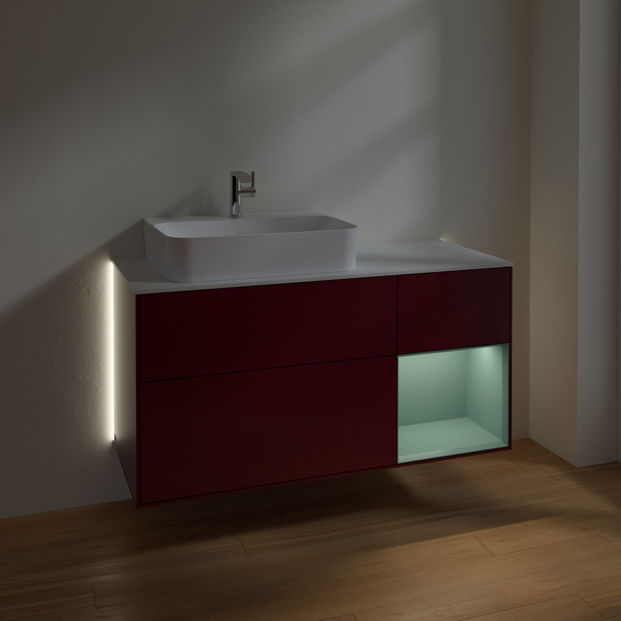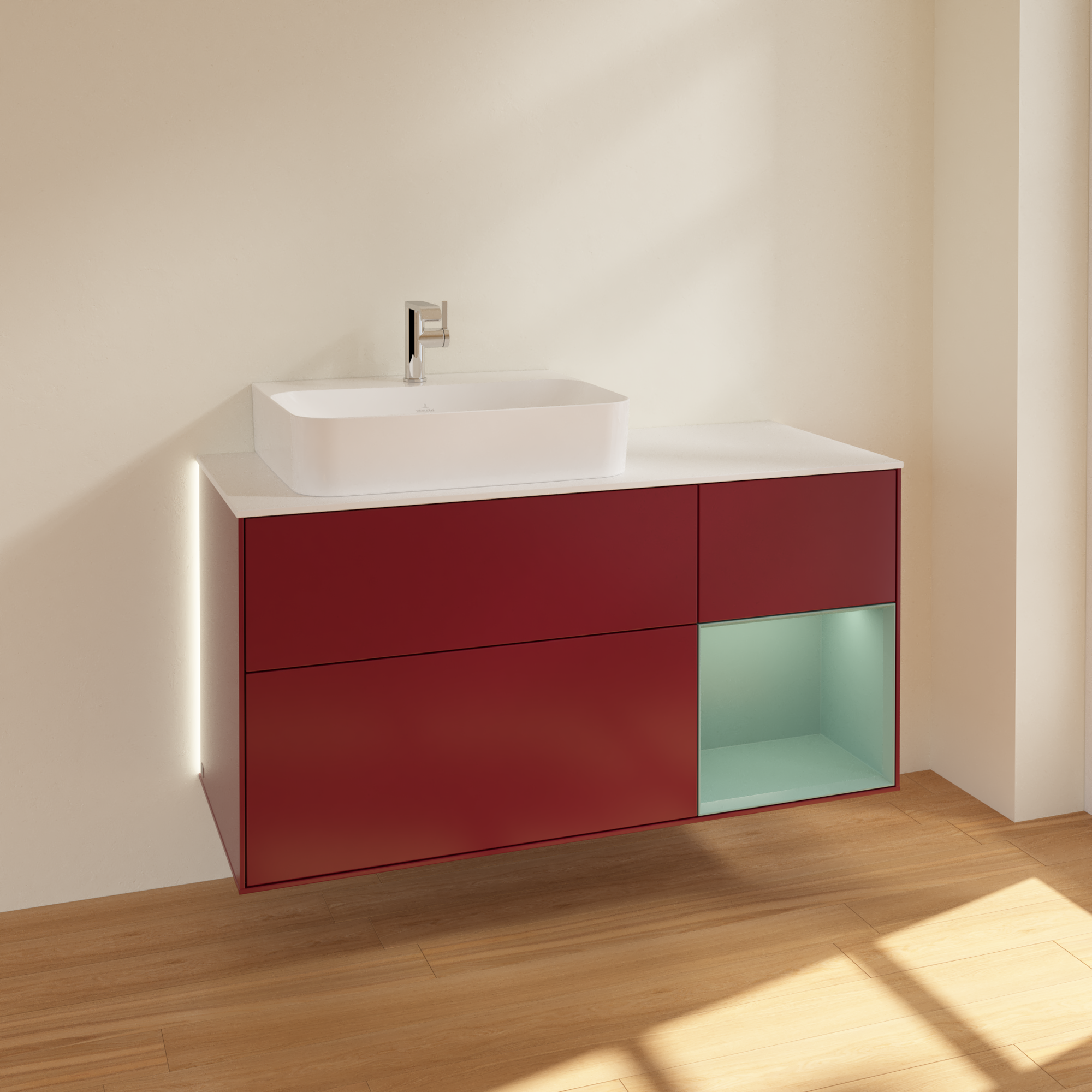 Finion Vanity unit, with lighting, 3 pull-out compartments, 1200x603x501mm, Body: Peony Matt Lacquer, Front: Peony Matt Lacquer, Shelf: Olive Matt Lacquer, Cover plate: Glass White Matt