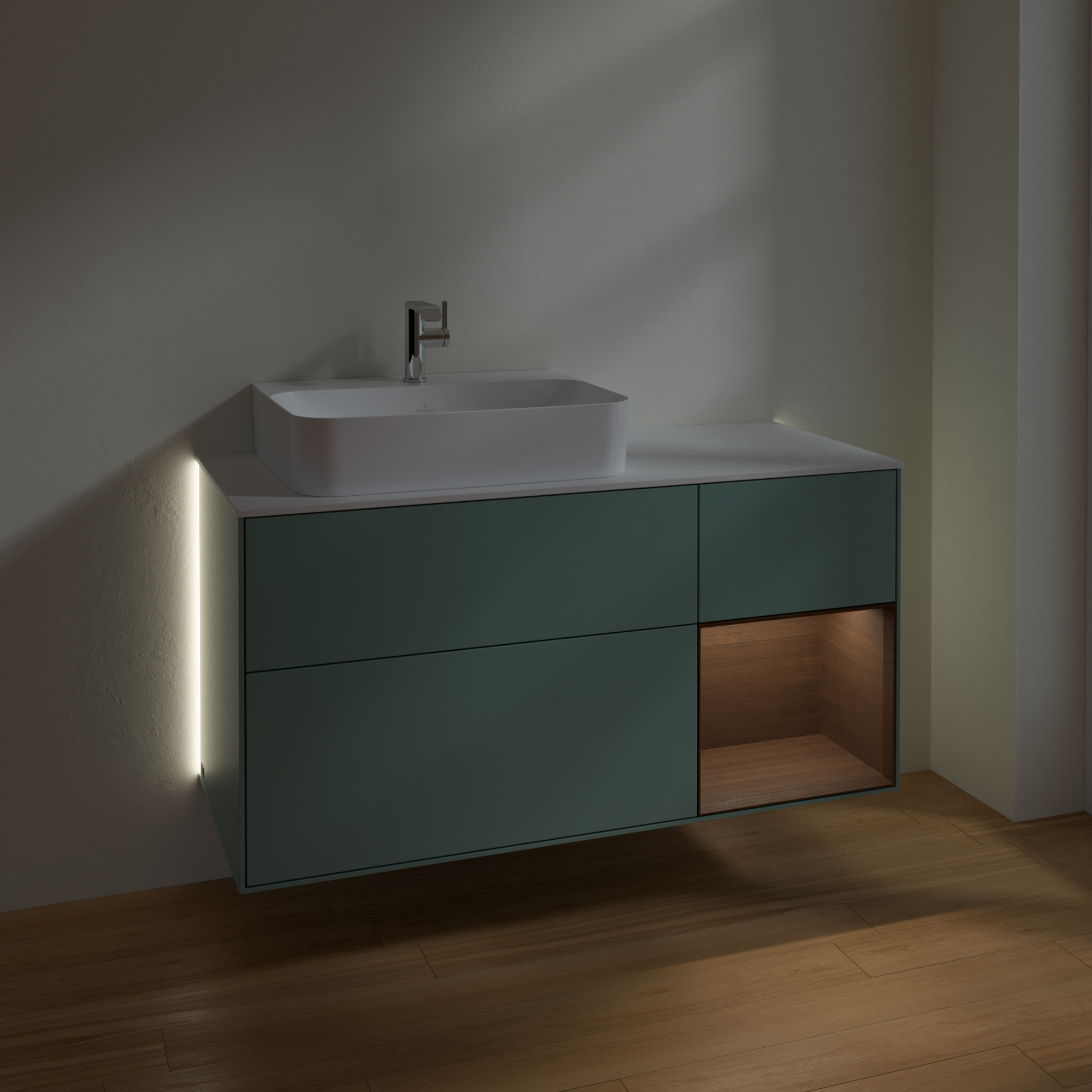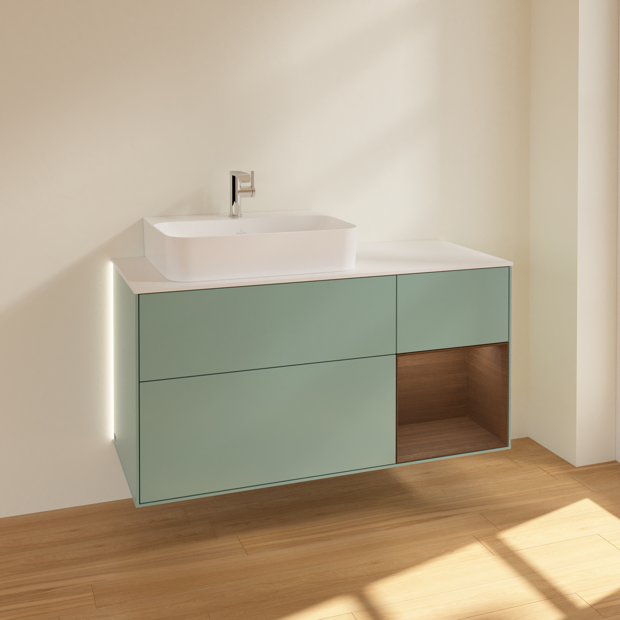 Finion Vanity unit, with lighting, 3 pull-out compartments, 1200x603x501mm, Body: Olive Matt Lacquer, Front: Olive Matt Lacquer, Shelf: Walnut Veneer, Cover plate: Glass White Matt