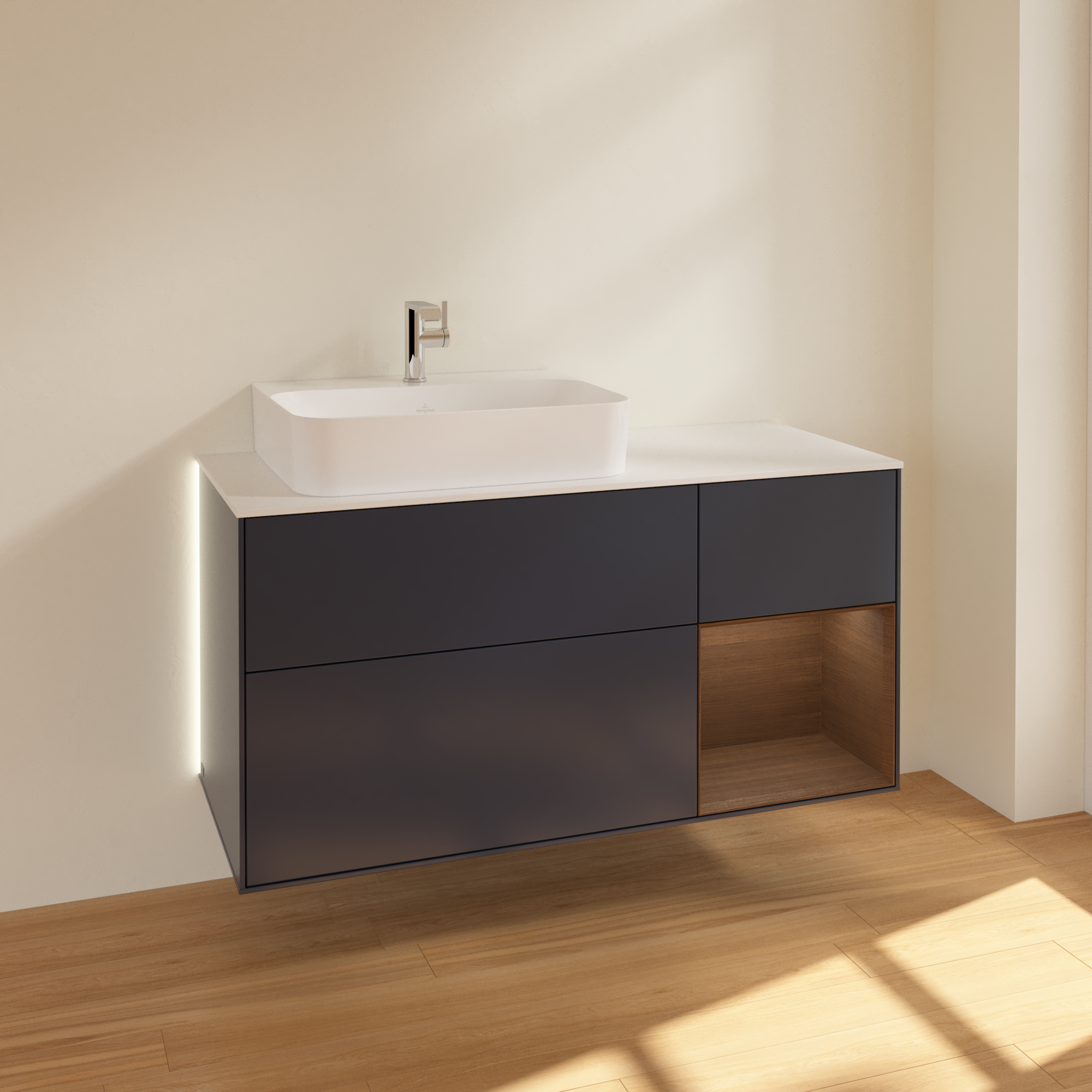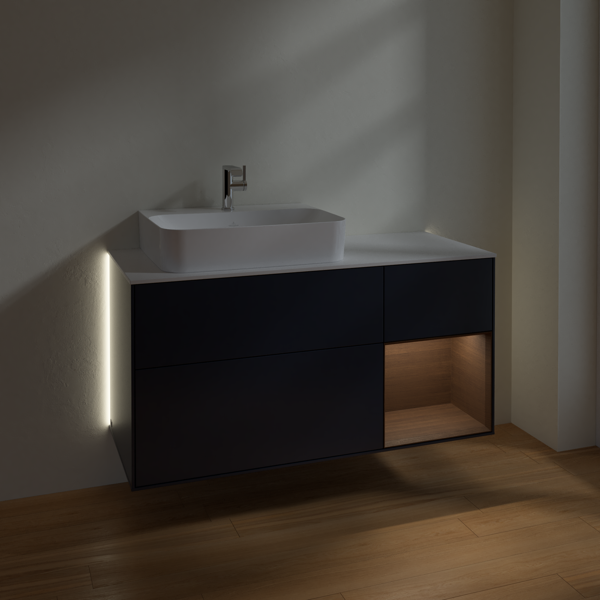 Finion Vanity unit, with lighting, 3 pull-out compartments, 1200x603x501mm, Body: Midnight Blue Matt Lacquer, Front: Midnight Blue Matt Lacquer, Shelf: Walnut Veneer, Cover plate: Glass White Matt