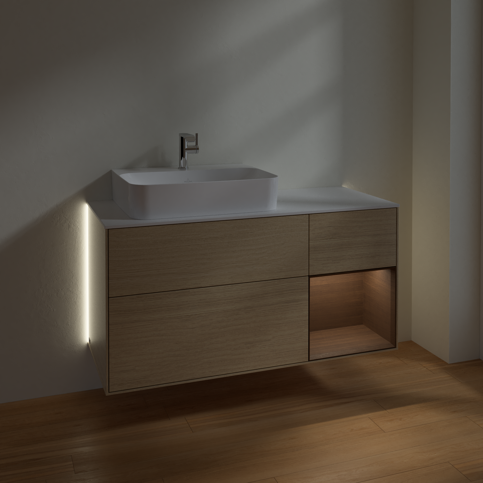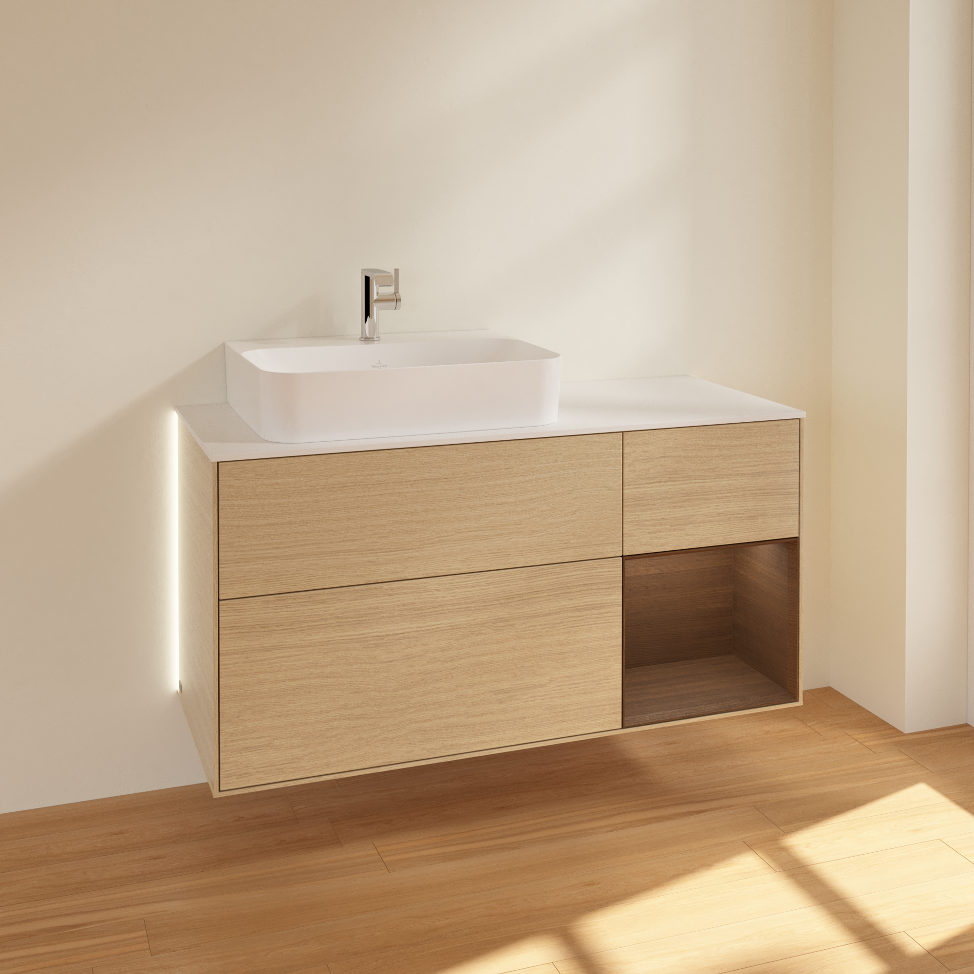 Finion Vanity unit, with lighting, 3 pull-out compartments, 1200x603x501mm, Body: Oak Veneer, Front: Oak Veneer, Shelf: Walnut Veneer, Cover plate: Glass White Matt
