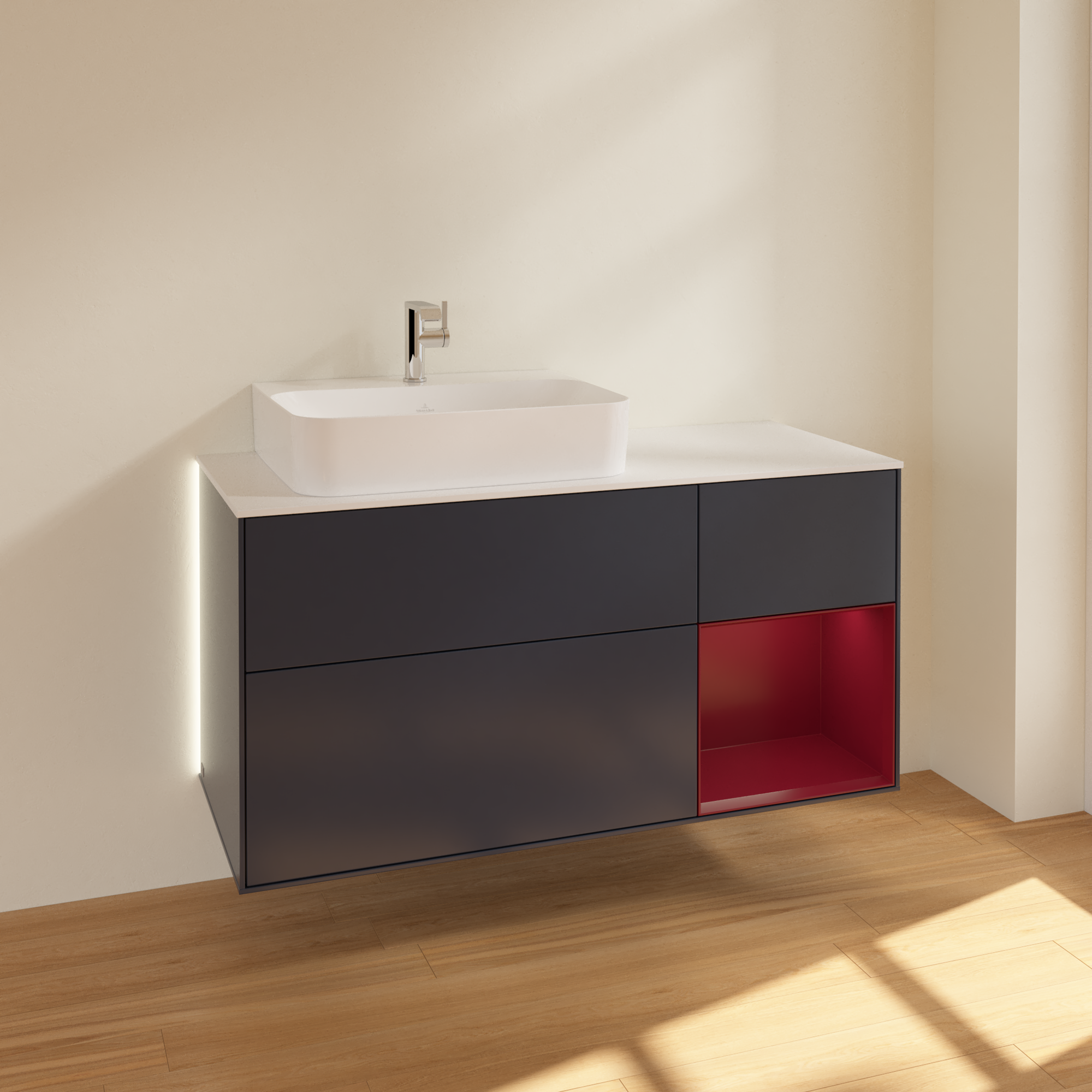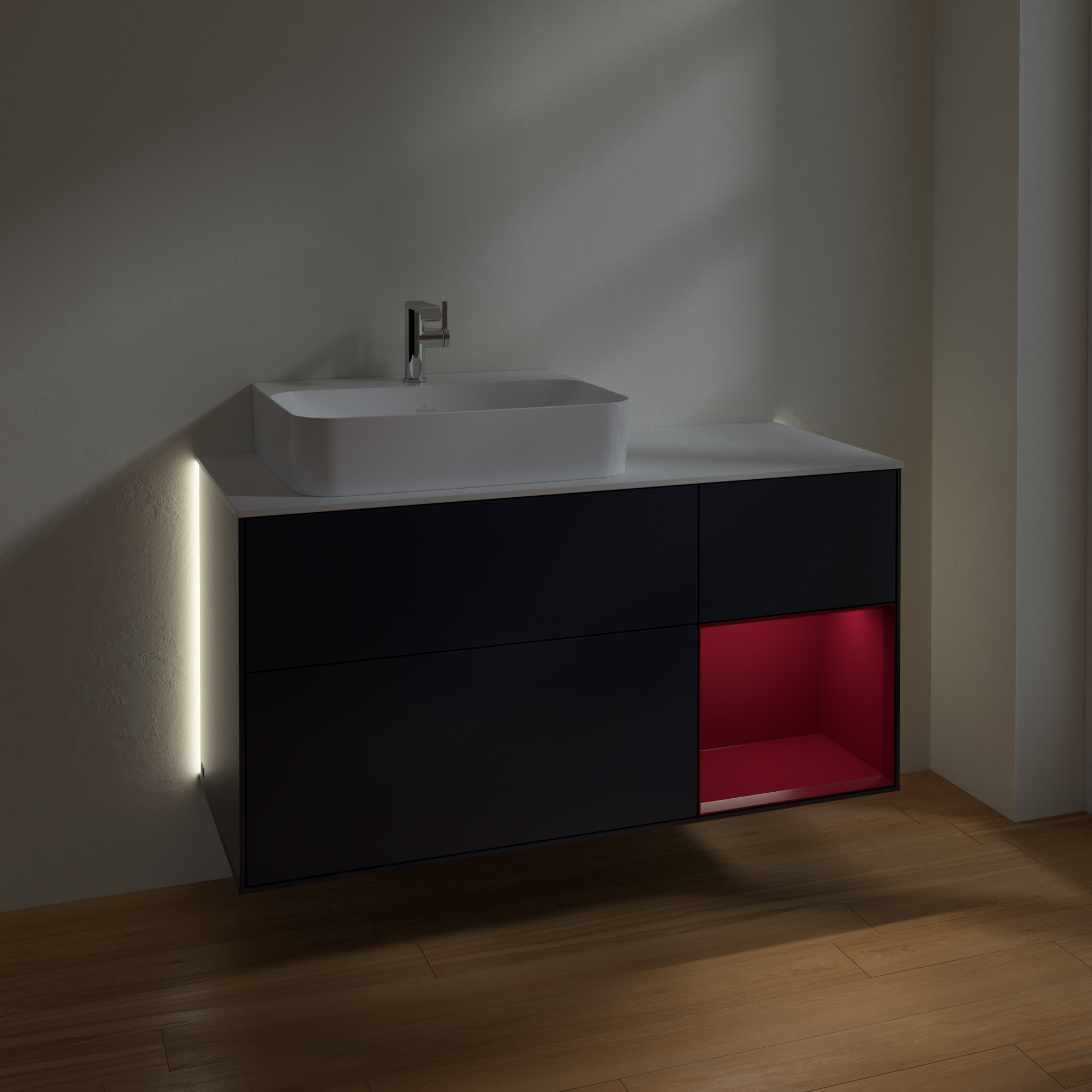Finion Vanity unit, with lighting, 3 pull-out compartments, 1200x603x501mm, Body: Midnight Blue Matt Lacquer, Front: Midnight Blue Matt Lacquer, Shelf: Peony Matt Lacquer, Cover plate: Glass White Matt
