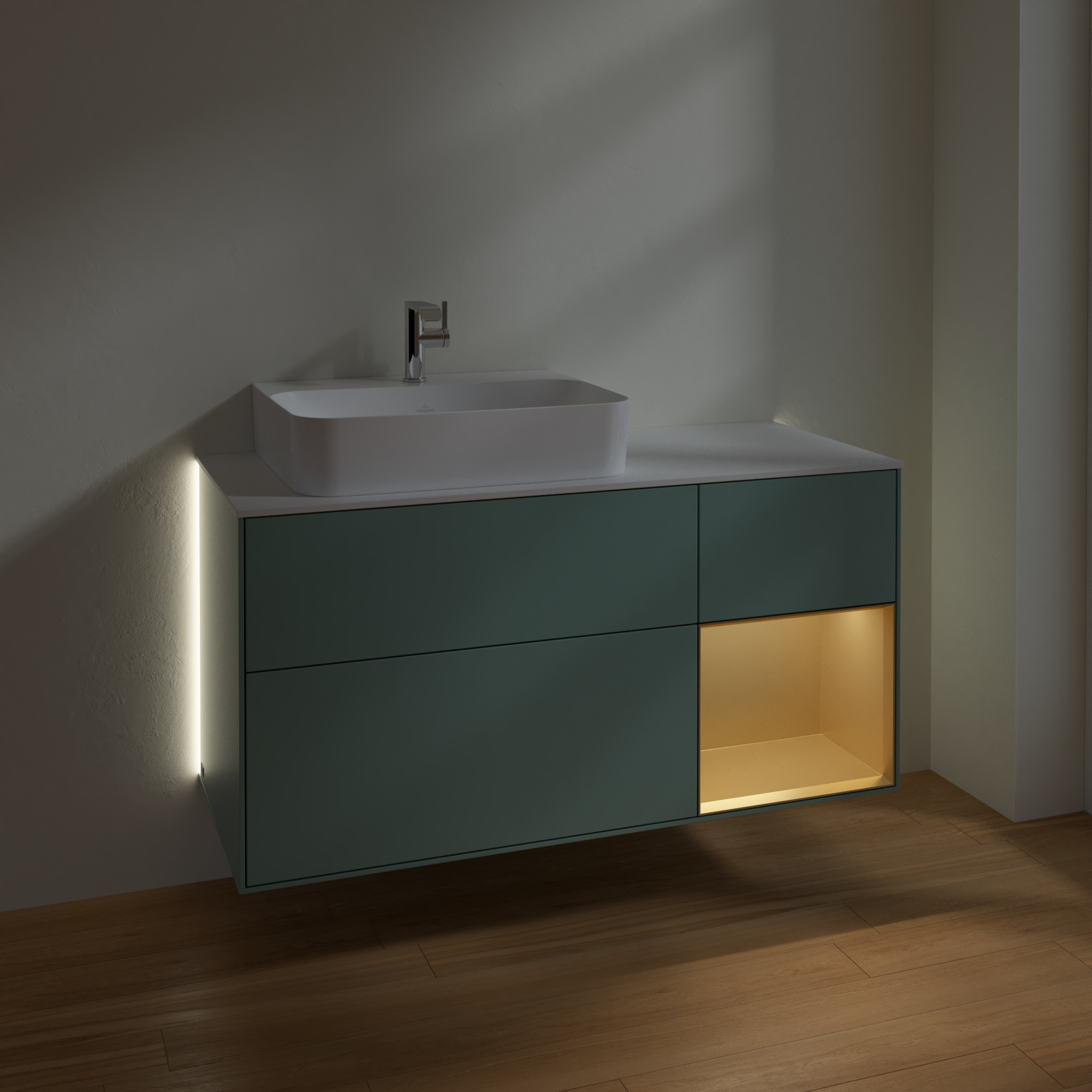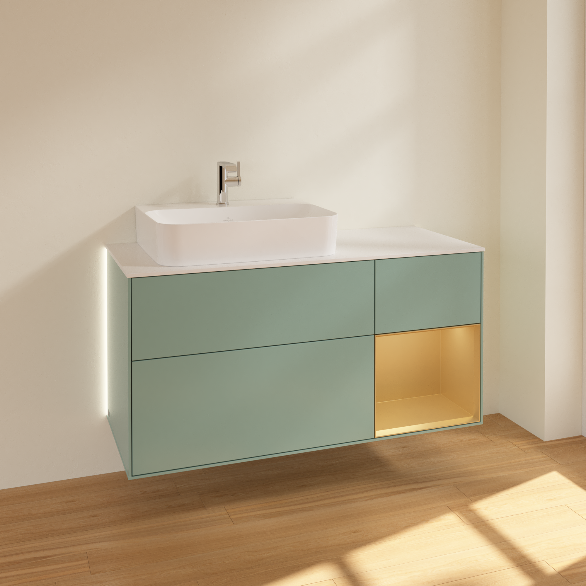 Finion Vanity unit, with lighting, 3 pull-out compartments, 1200x603x501mm, Body: Olive Matt Lacquer, Front: Olive Matt Lacquer, Shelf: Gold Matt Lacquer, Cover plate: Glass White Matt