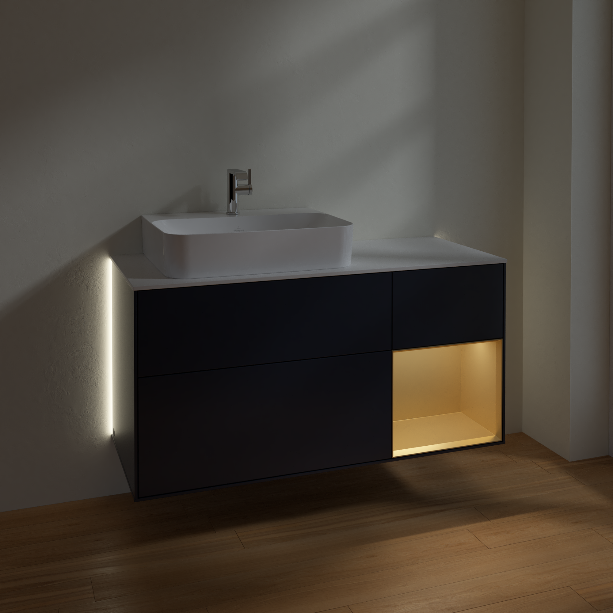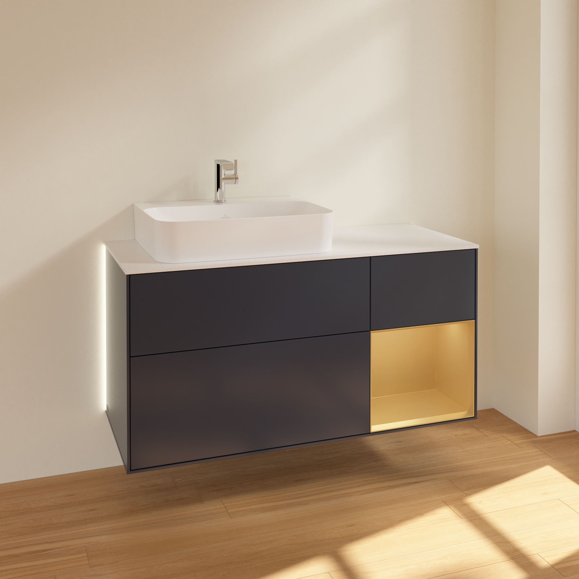 Finion Vanity unit, with lighting, 3 pull-out compartments, 1200x603x501mm, Body: Midnight Blue Matt Lacquer, Front: Midnight Blue Matt Lacquer, Shelf: Gold Matt Lacquer, Cover plate: Glass White Matt