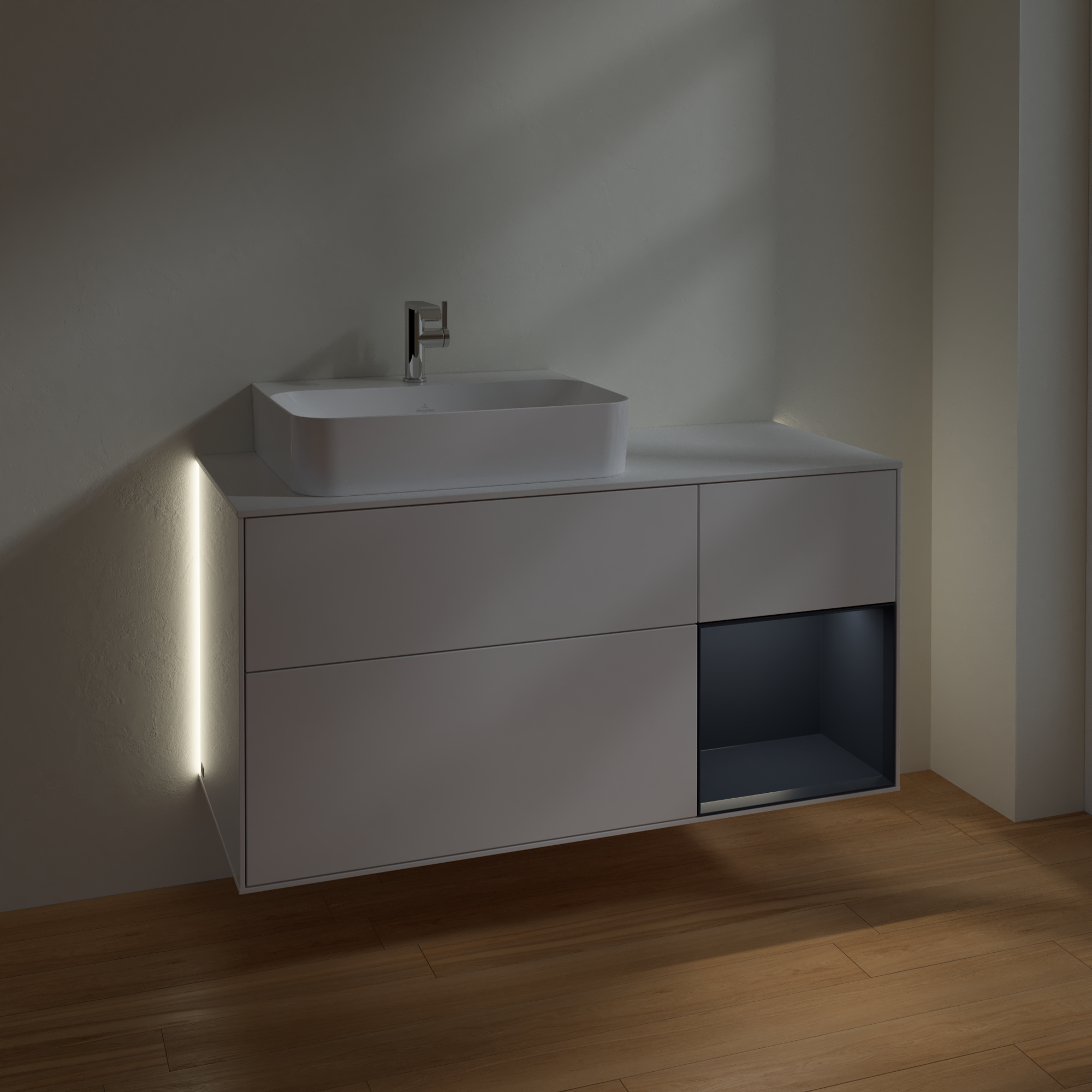 Finion Vanity unit, with lighting, 3 pull-out compartments, 1200x603x501mm, Body: Glossy White Lacquer, Front: Glossy White Lacquer, Shelf: Midnight Blue Matt Lacquer, Cover plate: Glass White Matt