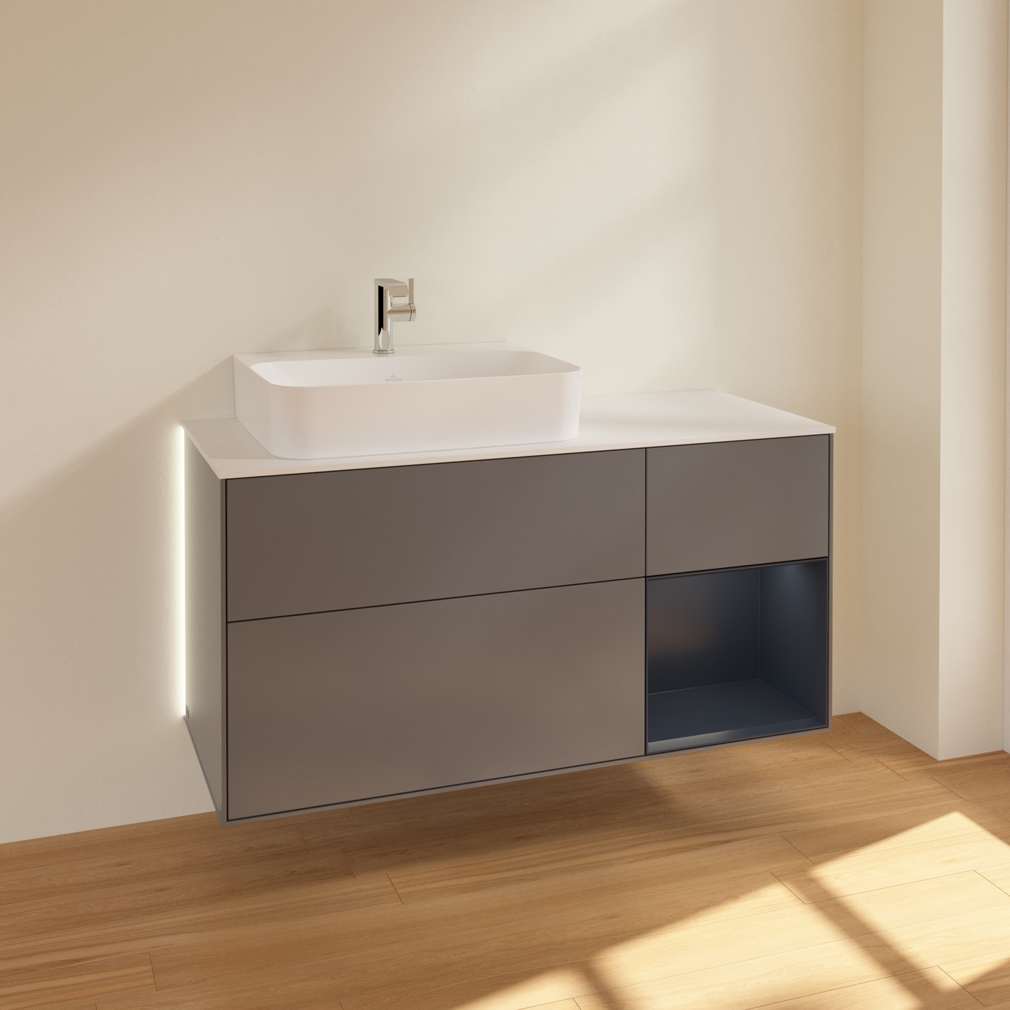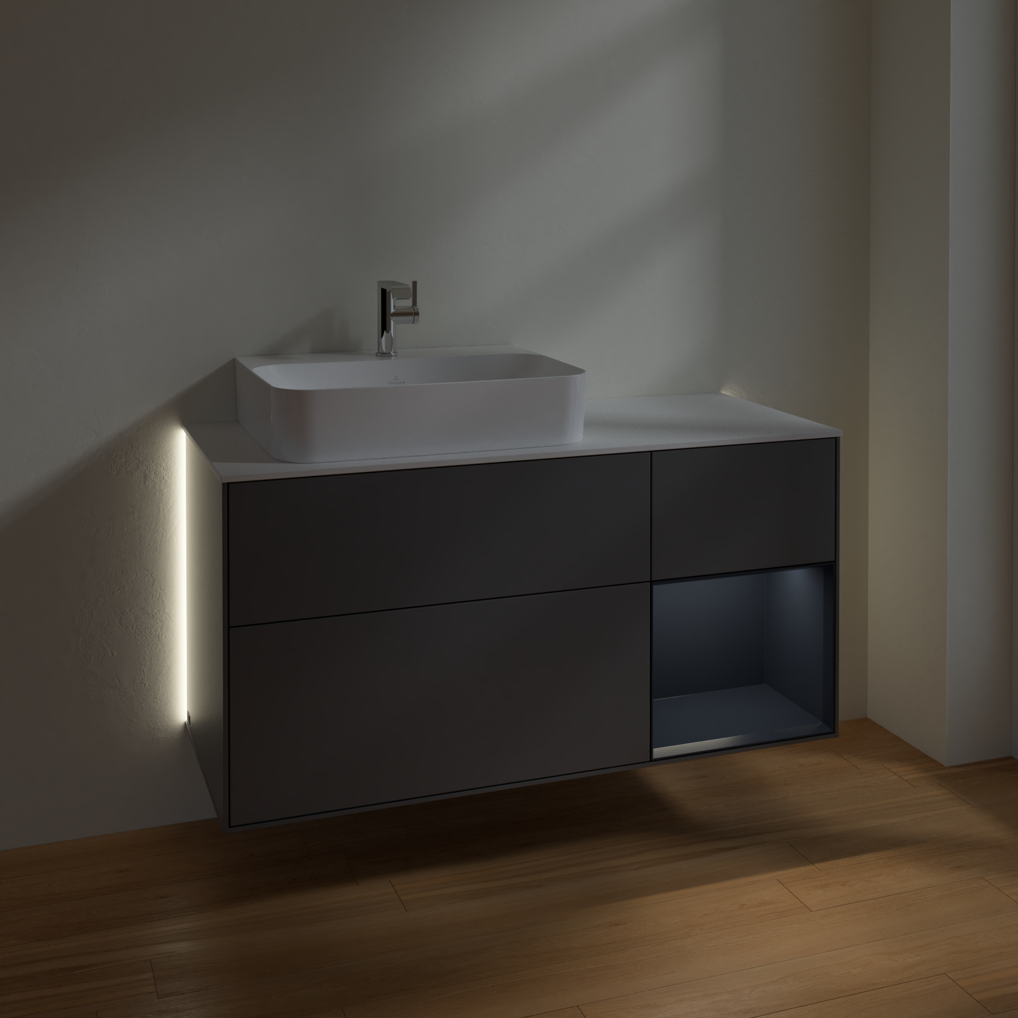 Finion Vanity unit, with lighting, 3 pull-out compartments, 1200x603x501mm, Body: Anthracite Matt Lacquer, Front: Anthracite Matt Lacquer, Shelf: Midnight Blue Matt Lacquer, Cover plate: Glass White Matt